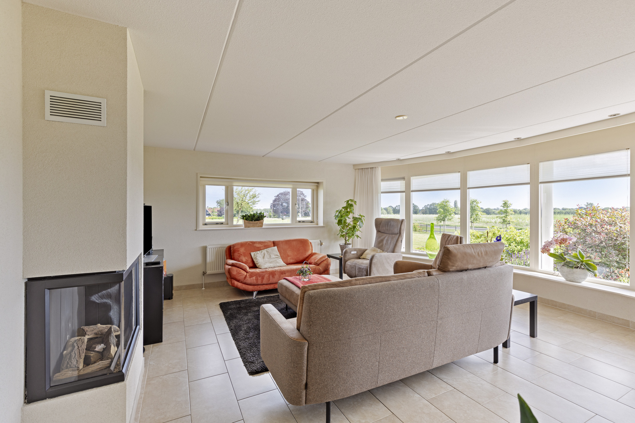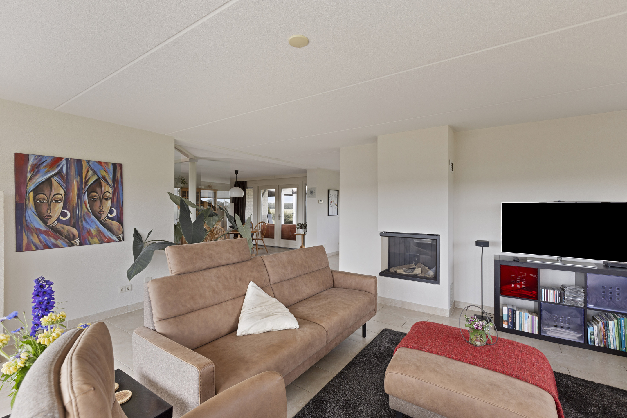 Rechts de living, met aan de voorzijde een grote halfronde glazen erker en een grote gashaard, die met één druk op de knop zorgt voor warmte en ambiance.