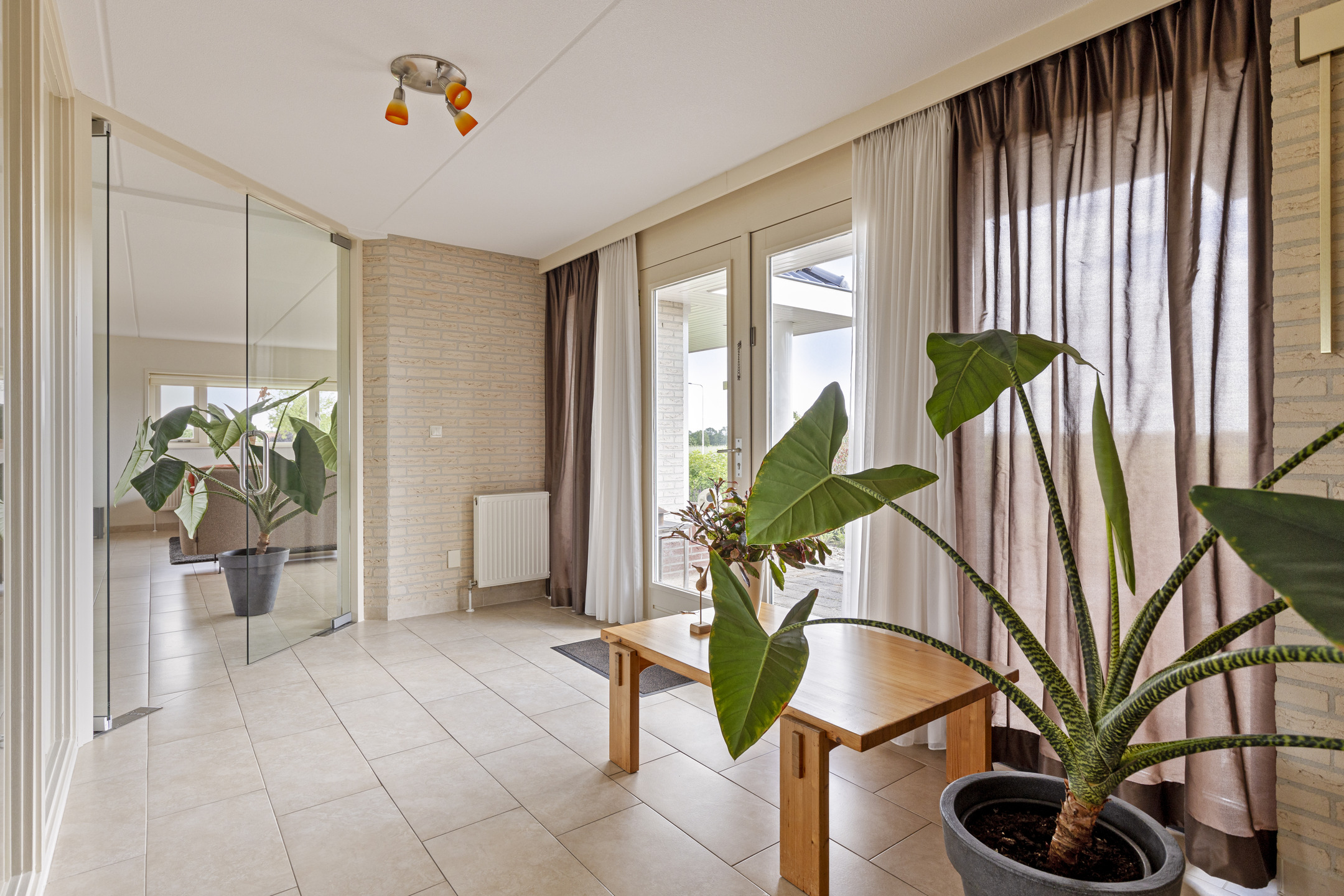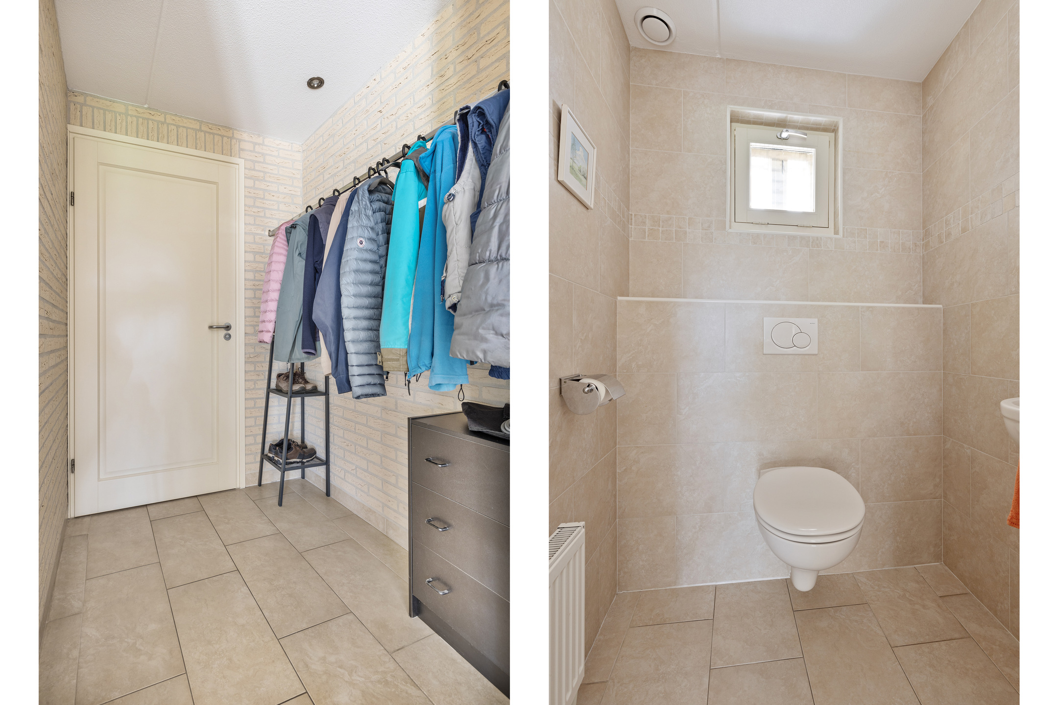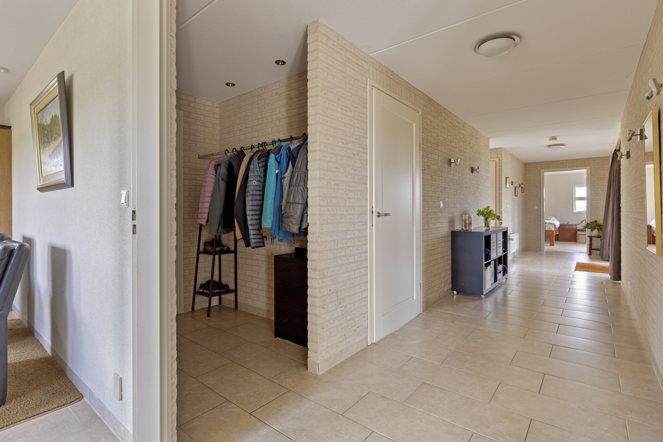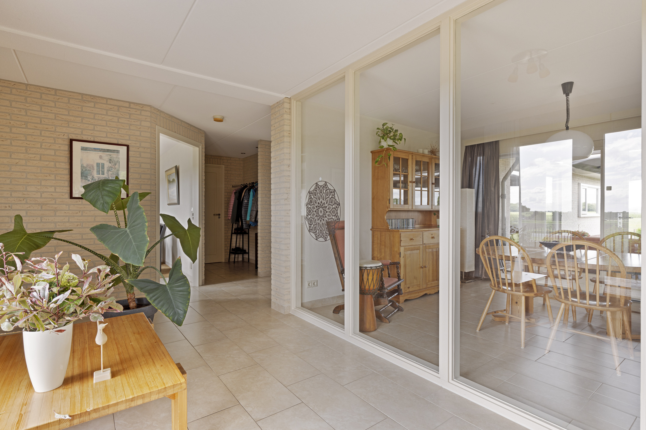 De villa is geheel gelijkvloers ingericht, drempelloos en met extra brede deurposten. In het gemoedelijke oosten komen we natuurlijk graag achterom binnen, maar voor de vorm entree aan de voorzijde van het huis, in de royale en zonnige hal. Op de vloer ligt een fraaie, lichte keramische tegel die uitstekend samenwerkt met vloerverwarming. De plinten zijn door de woning heen geïntegreerd met de wanden, dus stoffige randen hebben hier geen kans. De architect had als missie een open, licht en zonnig huis te creëren en daar is hij uitstekend in geslaagd.