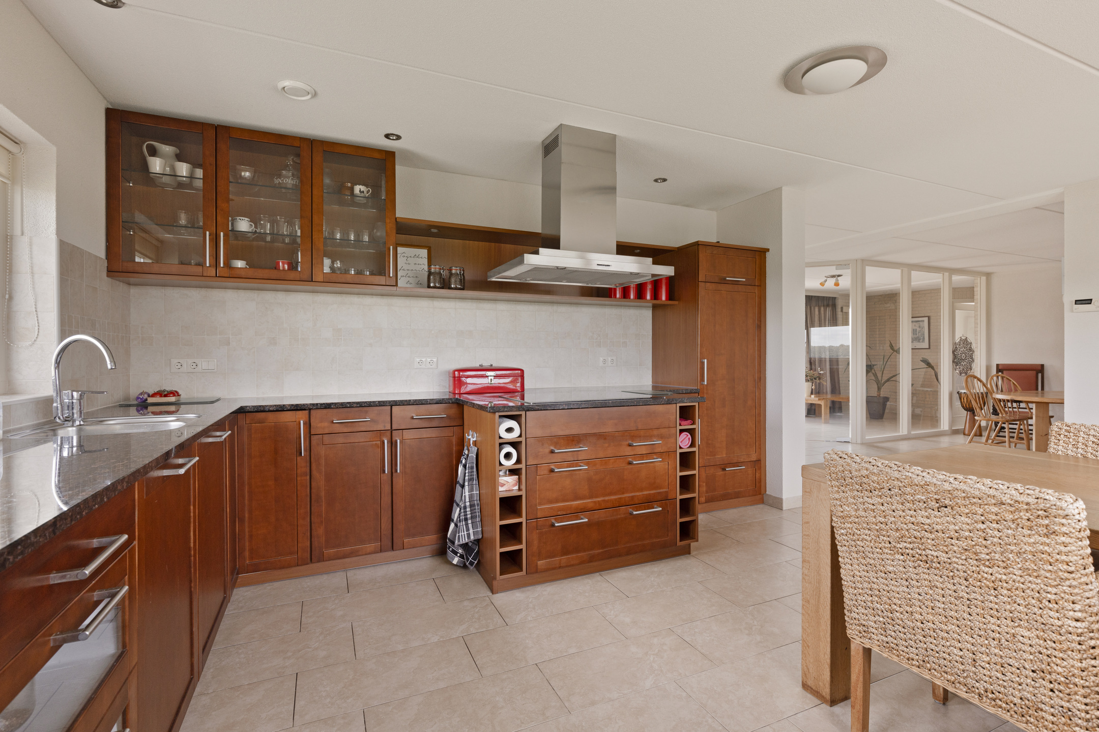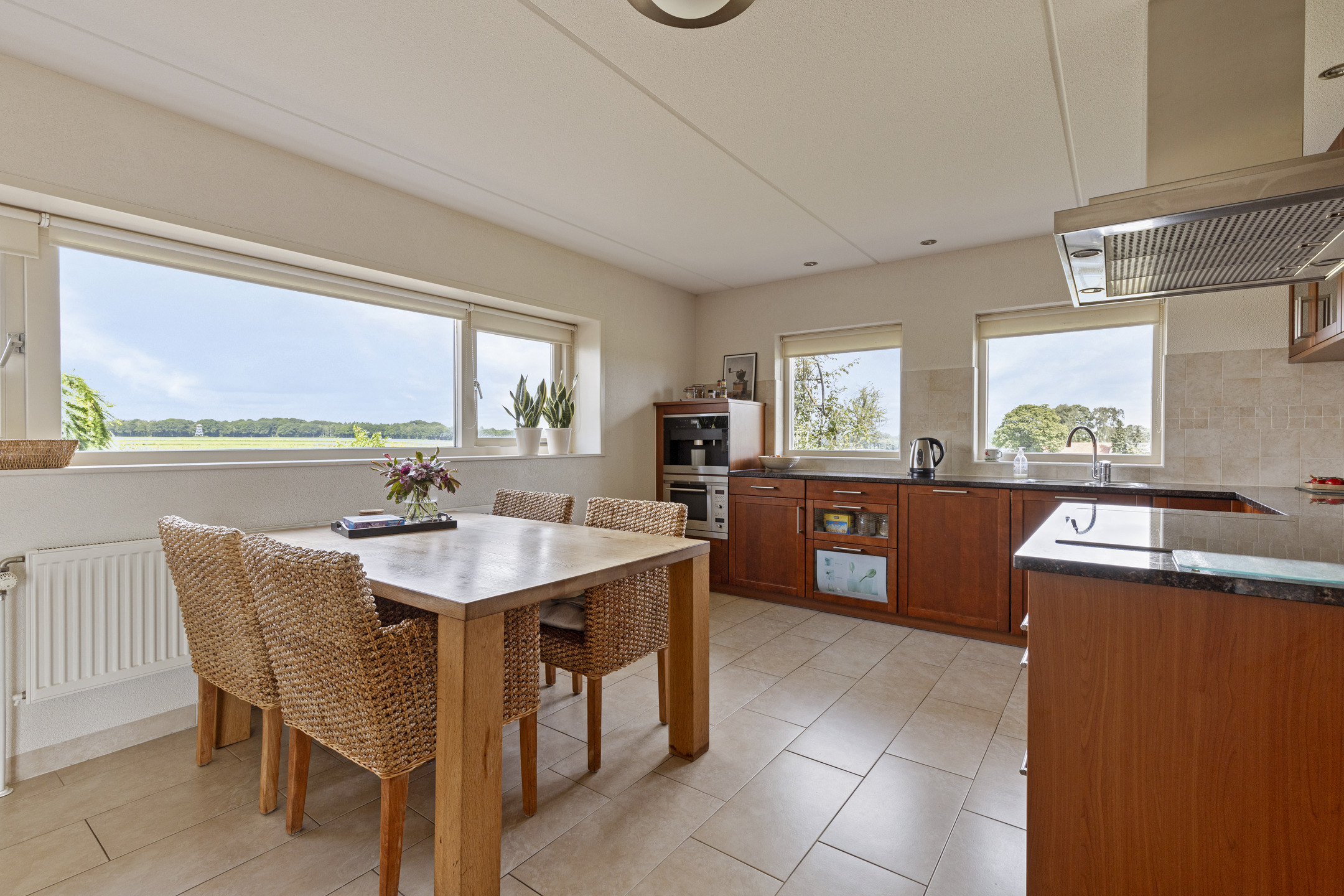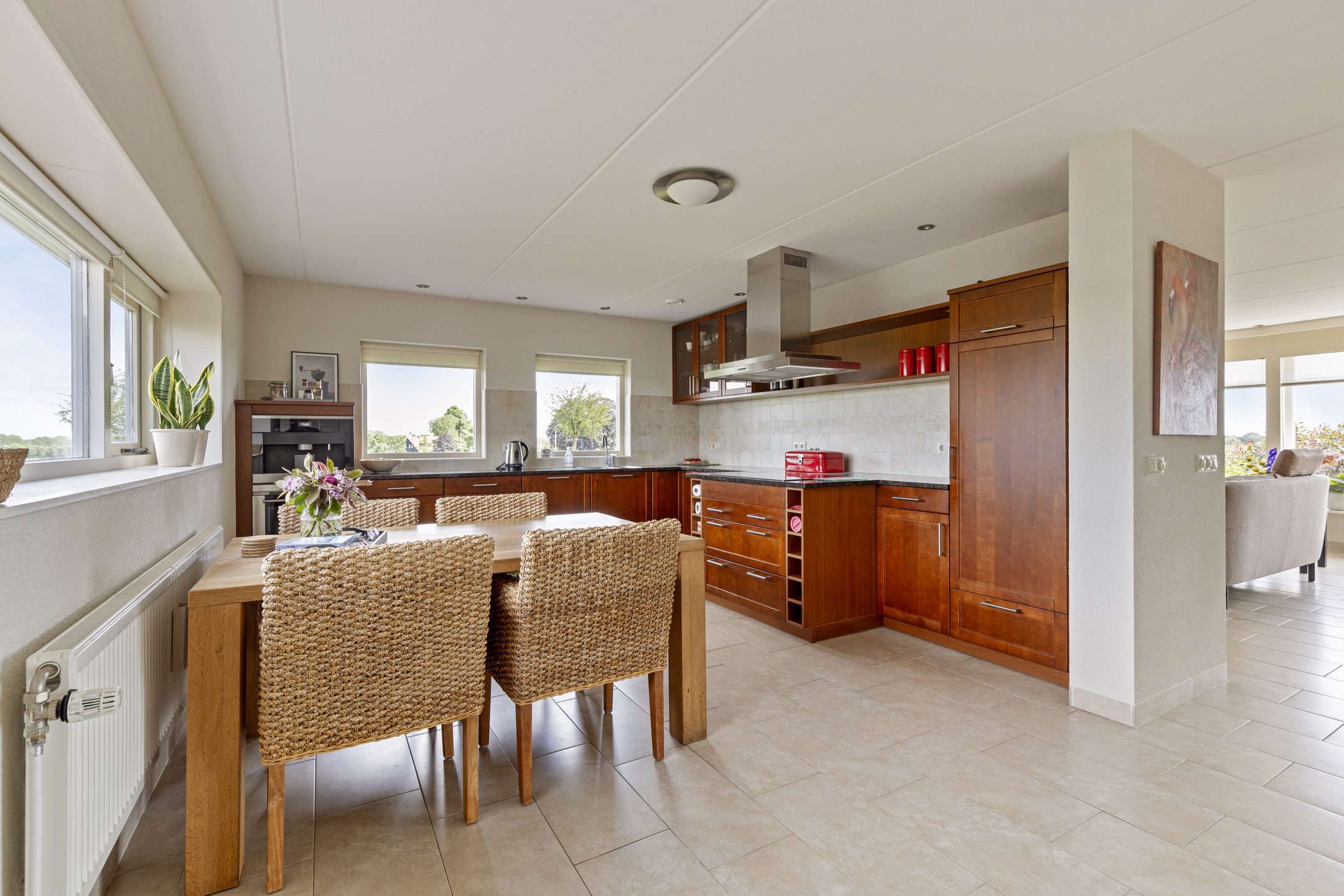 De keuken is open, maar door de ligging in het programma, met uitzicht op de tuin en het historische essenlandschap, wel een heel eigen sfeer. De fronten zijn walnootkleurig en het granieten werkblad is oersterk. Alles is er, van alles wenselijke inbouwapparatuur zoals afwasmachine, koelvriescombinatie en combimagnetron tot een Miele koffieapparaat waarmee u in een handomdraai koffie, cappuccino, latte en thee tevoorschijn tovert.