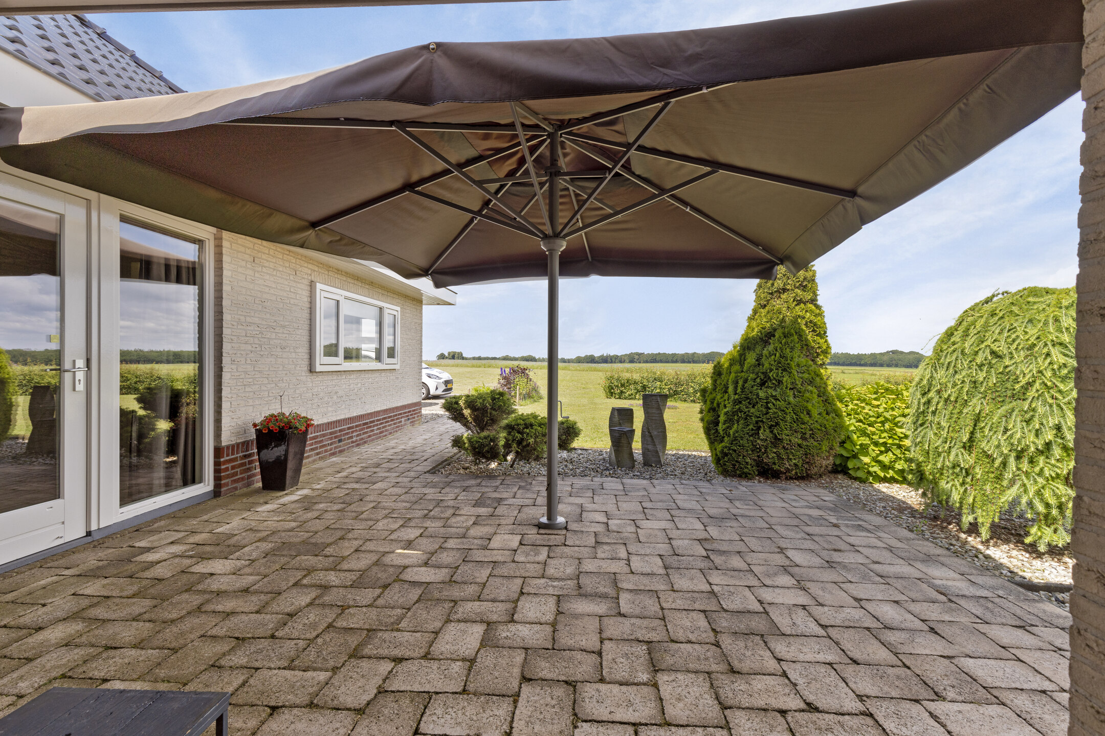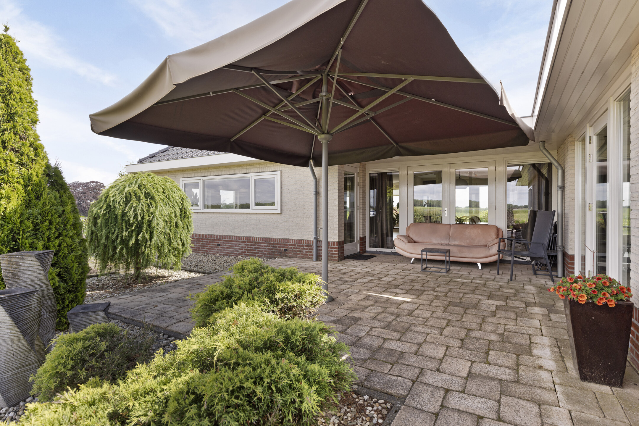 Aan de achterzijde van de woning is een overdekt terras gemaakt, bij de openslaande deuren; een heerlijke plek om de dag te besluiten. Hier staat ook een grote vaste parasol, om ook op warme dagen optimaal te kunnen genieten van de tuin.