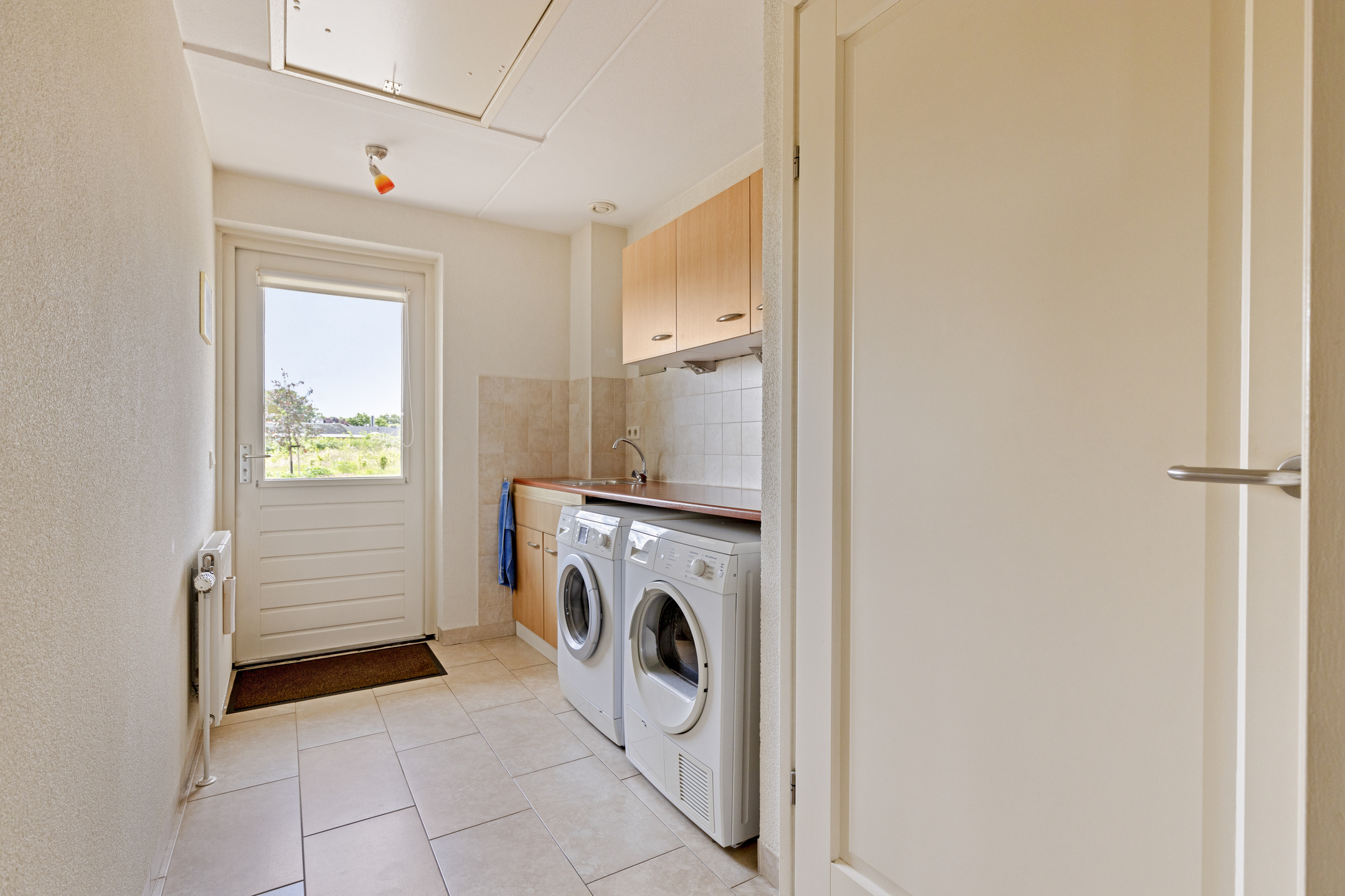 Aansluitend de bijkeuken, met de aansluitingen voor wasmachine en -droger, de pantry, de deur naar de oprit en de toegang tot de kelder.