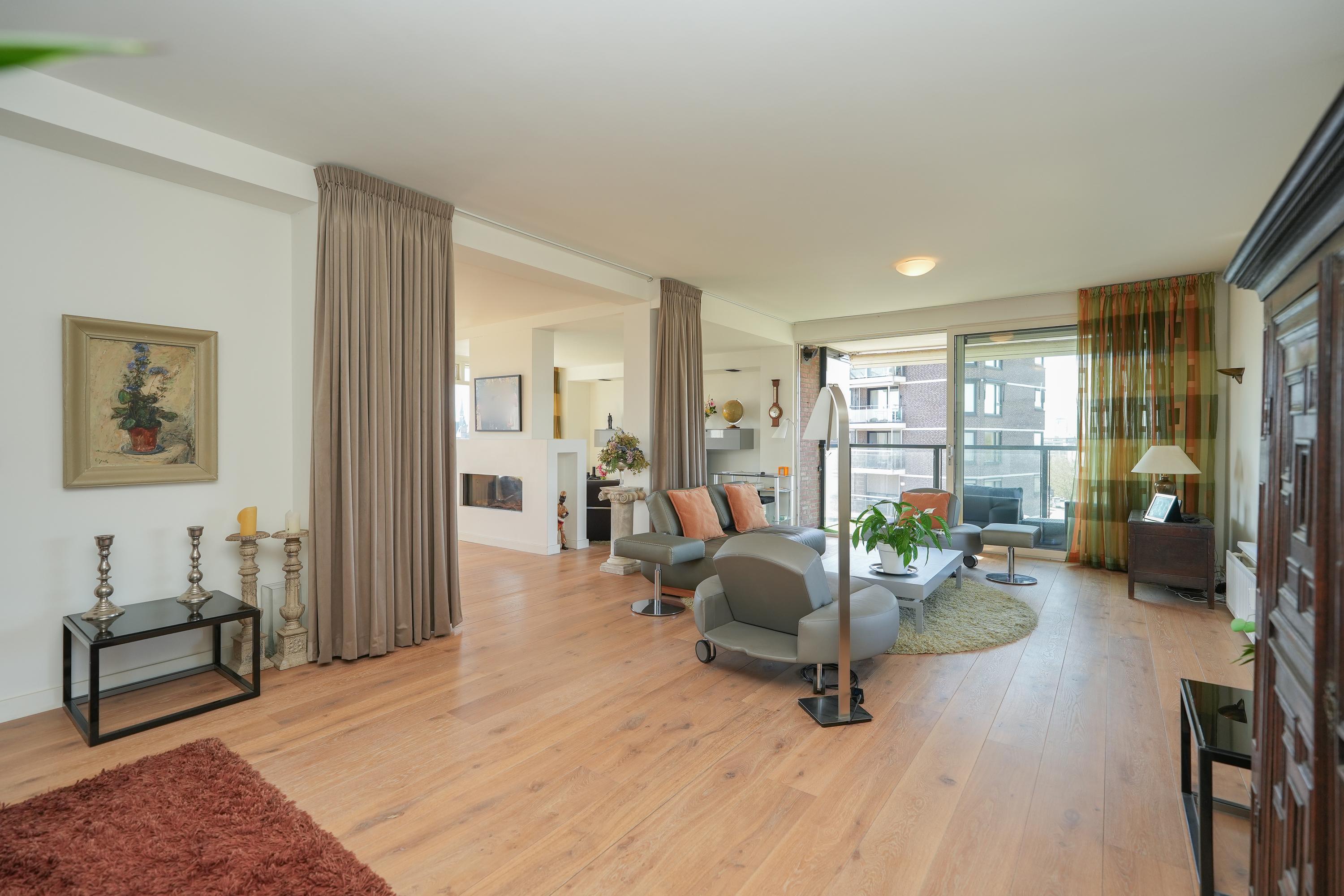 De woning is in 2009 ontstaan uit twee samengevoegde appartementen (nummers 44 en 46), wat heeft geresulteerd in een opmerkelijk ruim en logisch ingedeeld geheel met een duidelijke scheiding tussen wonen (44) en slapen (46). Tijdens deze samenvoeging is het appartement volledig en hoogwaardig gerenoveerd. In de woonkamer en hal ligt een massief eikenhouten vloer, wat samen met de strakke afwerking en het overvloedige daglicht zorgt voor een warme, luxe uitstraling. Grote raampartijen rondom bieden veel licht en indrukwekkende zichtlijnen met panoramisch uitzicht over de Waalbrug, de Ooijpolder en de stad. Privacy, comfort en afwerking komen hier samen in een unieke woonbeleving.