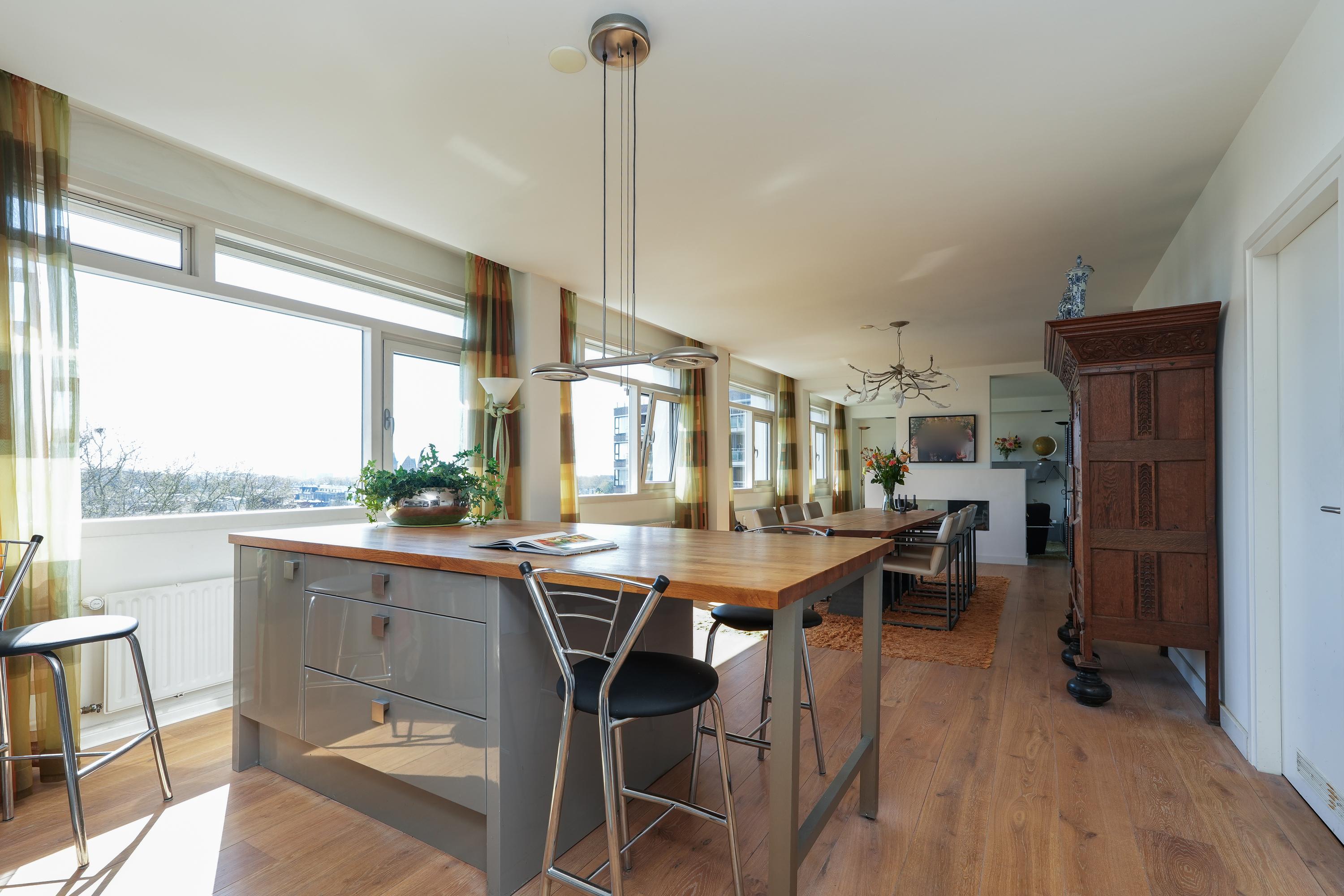 Entree appartement met een beveiligde toegangsdeur. Het appartement is zeer licht door rondom ramen. Het beschikt over een lange, brede hal die als centrale verbinding dient. Bij binnenkomst bevinden zich de garderobe, het gastentoilet, een wasruimte en de open keuken. De keuken en woonkamer zijn beide direct bereikbaar vanuit de hal, wat zorgt voor een loftachtige sfeer en mooie, logische doorloop. De keuken is voorzien van diverse inbouwapparatuur en biedt toegang tot het eerste balkon welke op het zuiden gericht is. Aangrenzend aan de keuken bevindt zich een inpandige bijkeuken met extra opberg- en werkruimte. Vanaf de woonkamer en het balkon is er een prachtig uitzicht over de stad Nijmegen en de Radboud Universiteit. Een gashaard zorgt voor een scheiding tussen de eetkamer en de televisiehoek aan de zuidwest kant. Het westelijk gelegen balkon biedt een fraai uitzicht richting de Waal en de iconische Waalbrug.