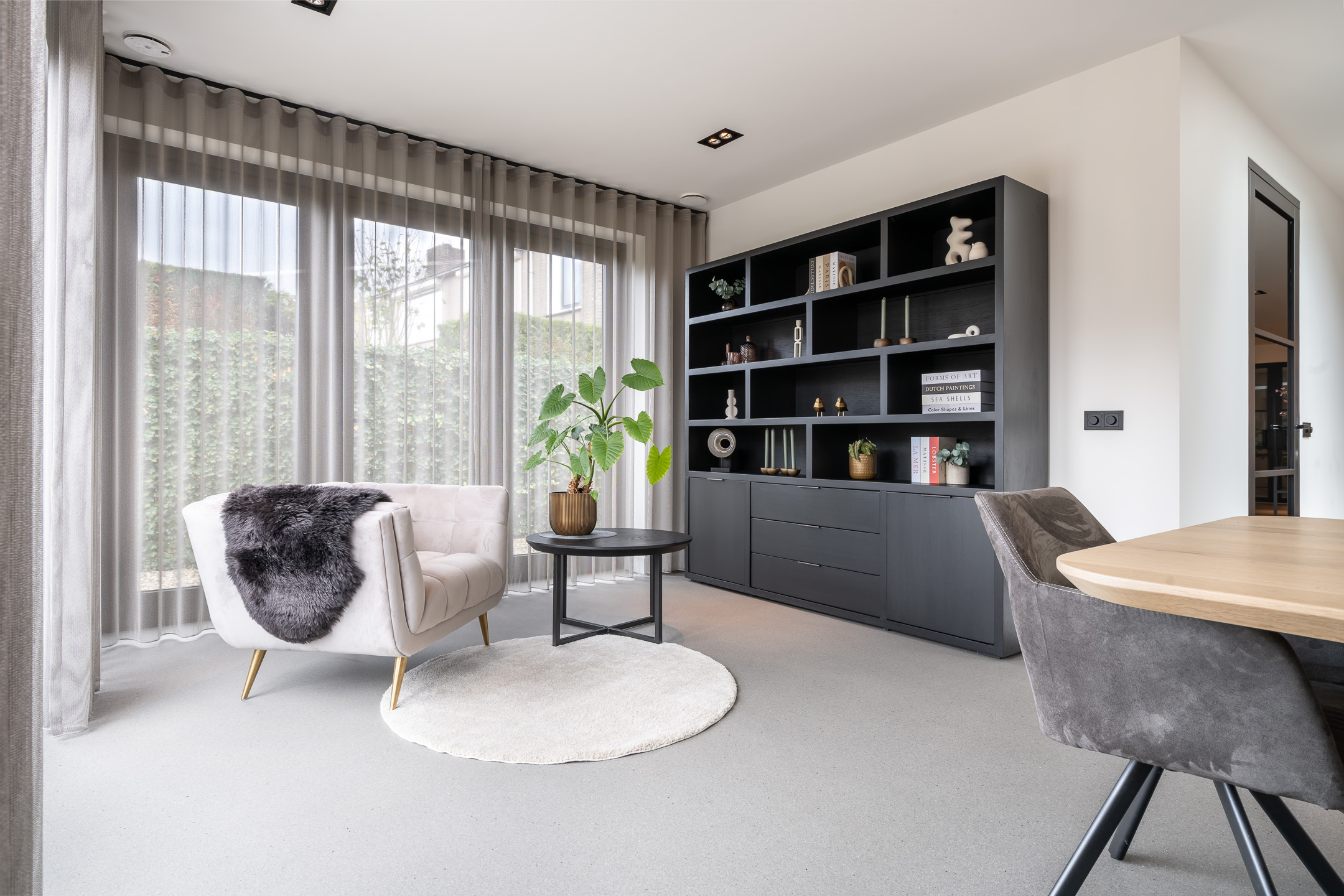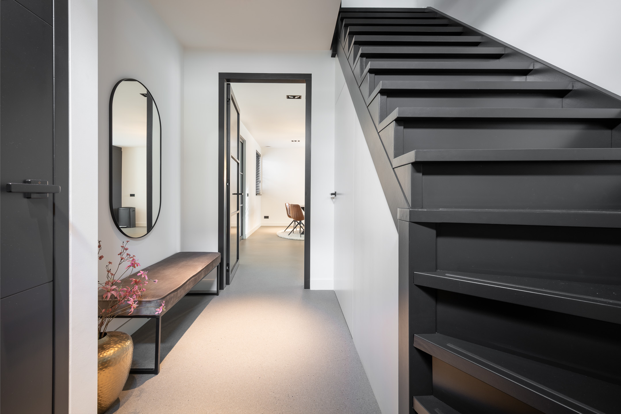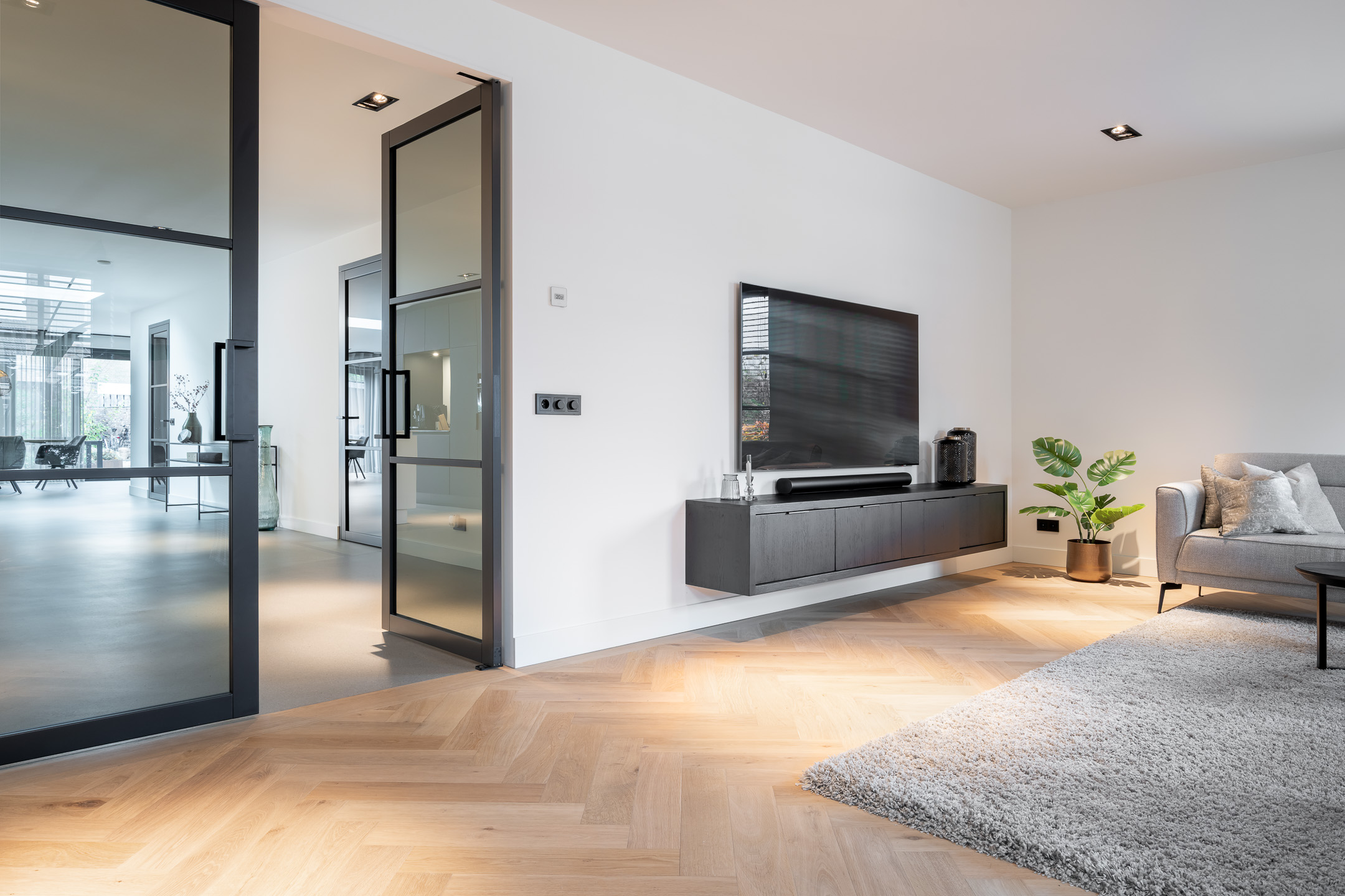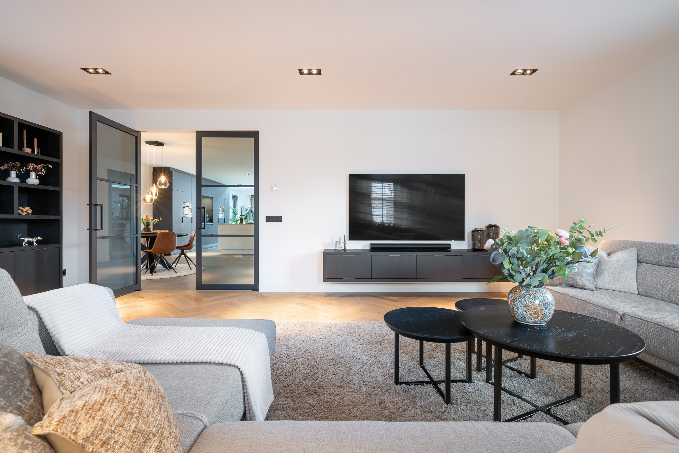 De royale leefruimtes zijn met veel oog voor detail afgewerkt. De indrukwekkende woonkeuken vormt het hart van de woning en is uitgevoerd met luxe materialen en hoogwaardige inbouwapparatuur. Aangrenzend bevindt zich de sfeervolle en ruime woonkamer met veel lichtinval. Een kantoorruimte, de separate wasruimte en de sterke verbinding met de tuin. De begane grond is voorzien van vloerverwarming, een extreem slijtvaste en krasbestendige troffelvloer die naadloos doorloopt. Deuren met magnetische sluiting en strak afgewerkte wanden en plafonds. De keuken is voorzien van alle gemakken, met een spoel- en kookeiland is het hier heerlijk koken.