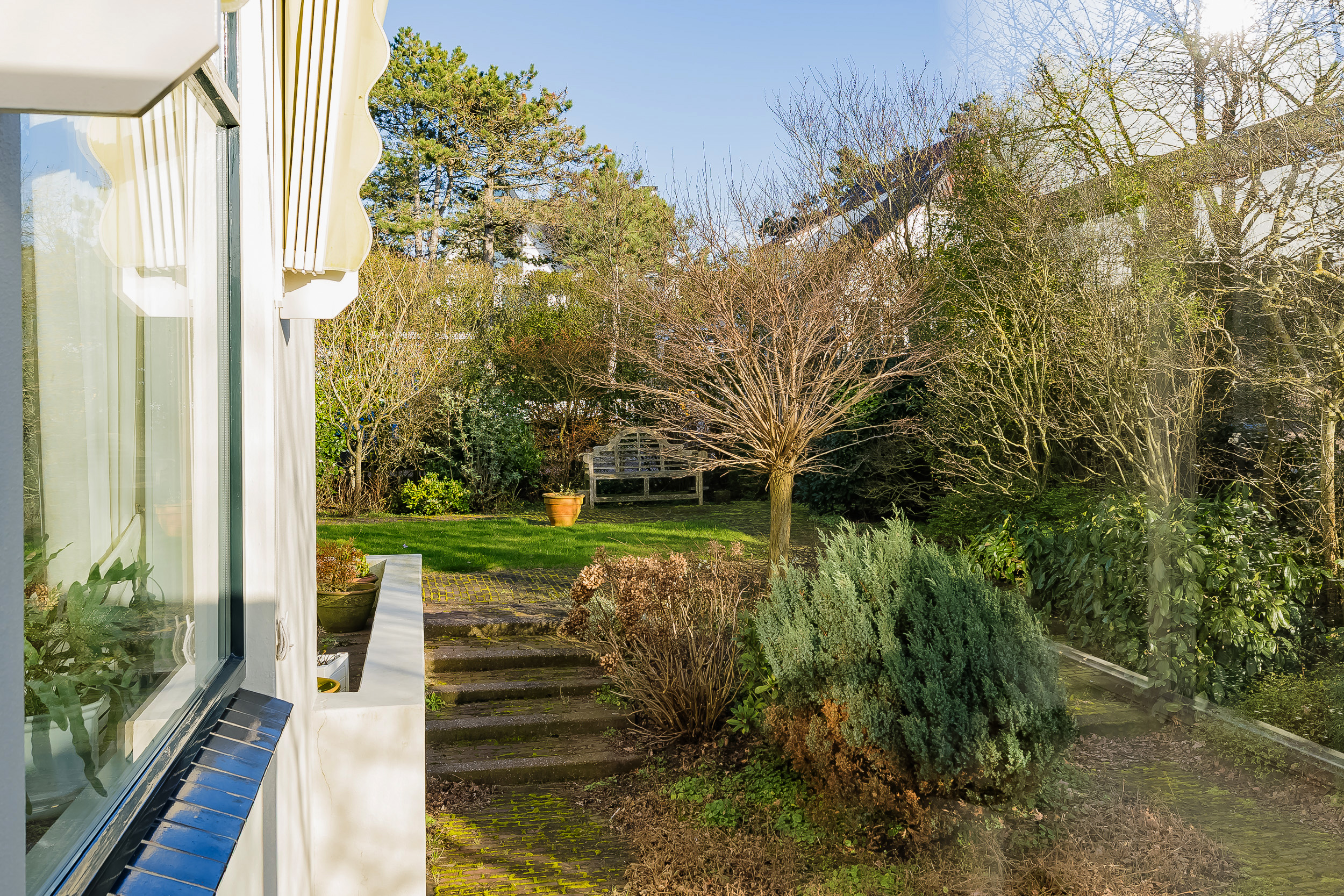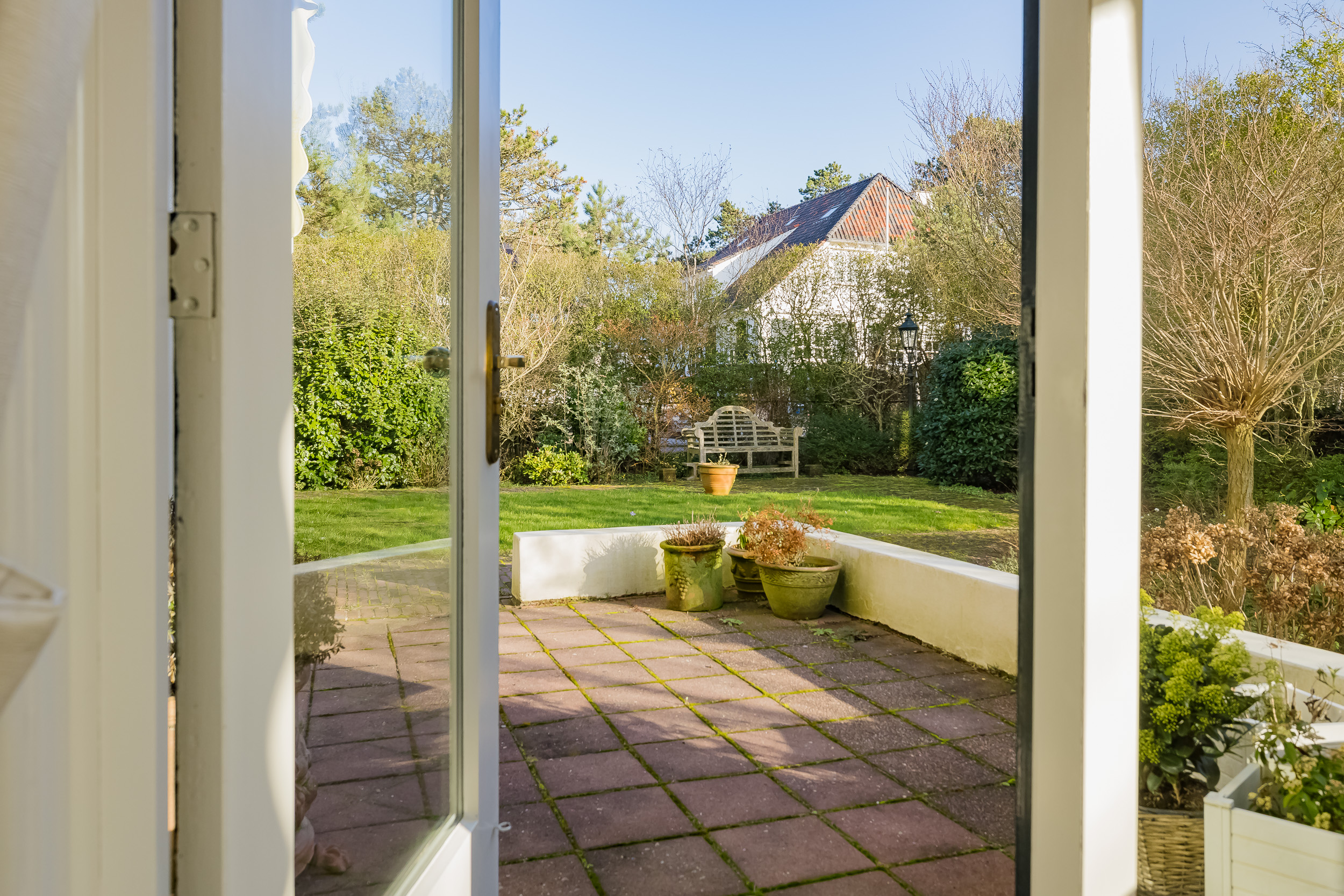 De eetkamer en-suite is met schuifdeuren handig af te sluiten van de woonkamer. Op het zonnige, met glas afgeschermde terras, geniet je al vroeg in het seizoen van de eerste zonnestralen, terwijl de deur op het terras directe toegang geeft tot de tuin.