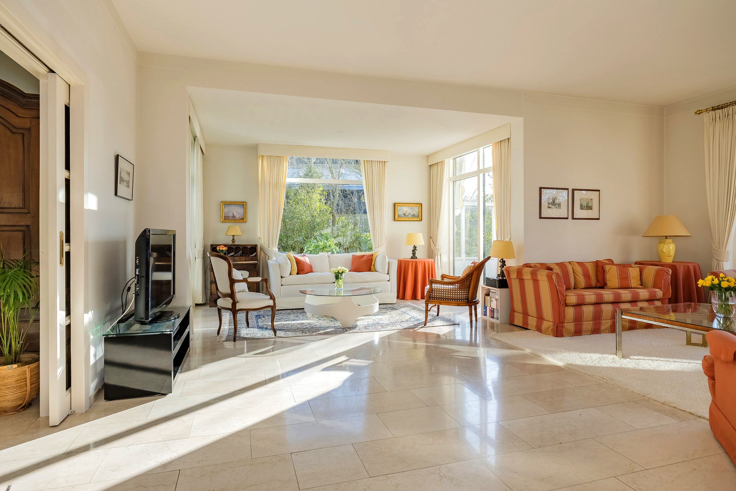 De royale woonkamer is een heerlijke leefruimte met een warme, uitnodigende sfeer. De open haard en de elegante marmeren vloer geven de ruimte karakter, terwijl de deuren vanuit de woonkamer zorgen voor een directe verbinding met de tuin. De zon draait van ’s-ochtends tot ’s-avonds om het huis wat voor een prachtige lichtinval zorgt.
