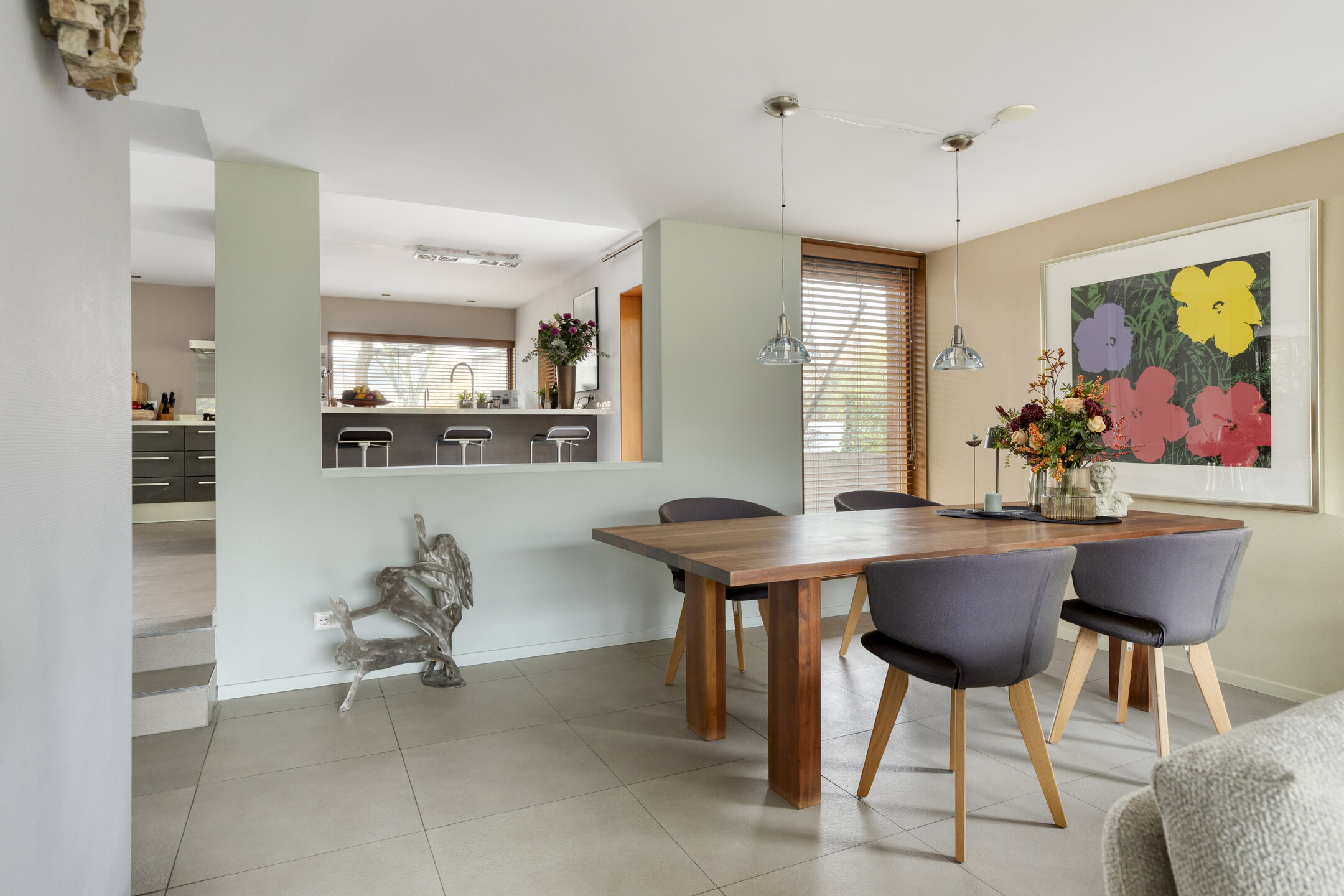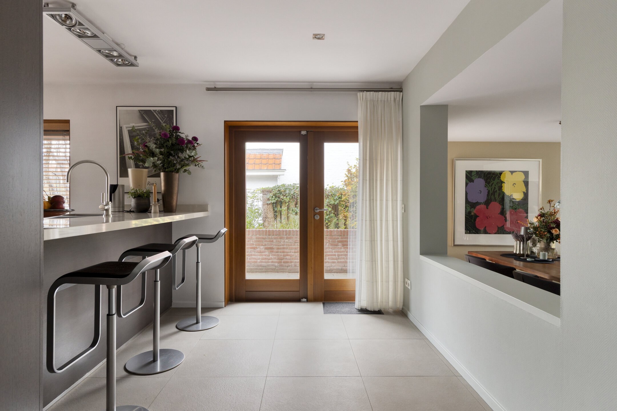 Vanuit de hal loopt u door naar de moderne, ruim opgezette keuken met ontbijtbar. De keuken is voorzien van diverse inbouwapparatuur, waaronder een inductiekookplaat met aparte wokbrander op gas, een dubbele wastafel, vaatwasser, oven, combi-oven en een grote koelkast. De open verbinding met de woonkamer maakt dit een praktische en prettige leefruimte.