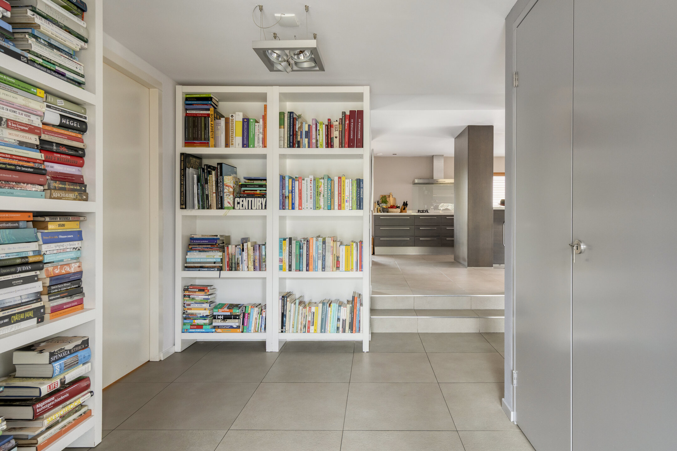 De woonkamer is een opvallend ruime en lichte plek in huis, mede dankzij de grote raampartijen in de vernieuwde schuifpui en de hoge plafonds met zicht op de kamers op de eerste etage. De haard in het midden van de woonkamer geeft de ruimte extra sfeer. De woonkamer ligt aan de achterzijde en heeft direct contact met de tuin. Aansluitend bevindt zich een extra kamer die uitstekend kan dienen als kantoor, speelkamer, tv-kamer of ruime slaapkamer met badkamer. De benodigde aansluitingen hiervoor zijn al aanwezig. Tot slot bereikt u via de woonkamer een ruime berging die ideaal is als voorraadkast en plaats biedt voor een extra koelkast en vriezer.