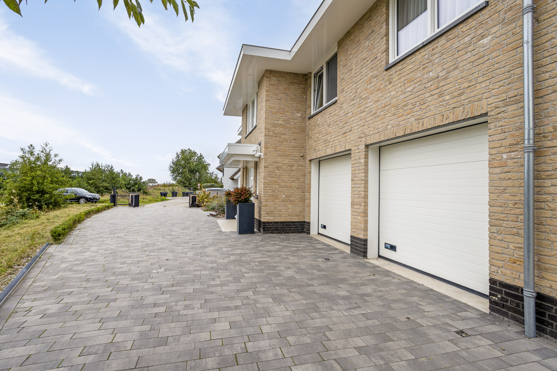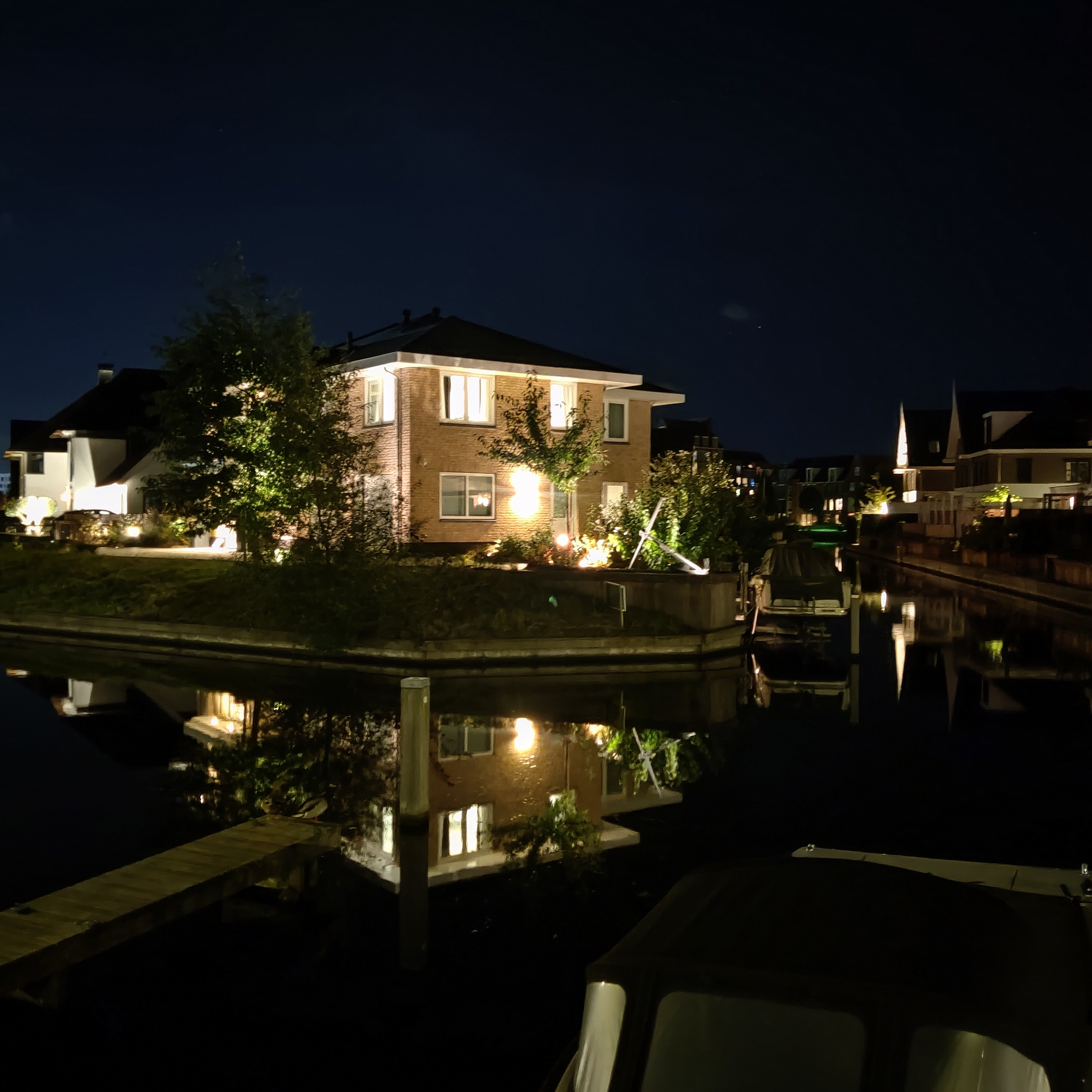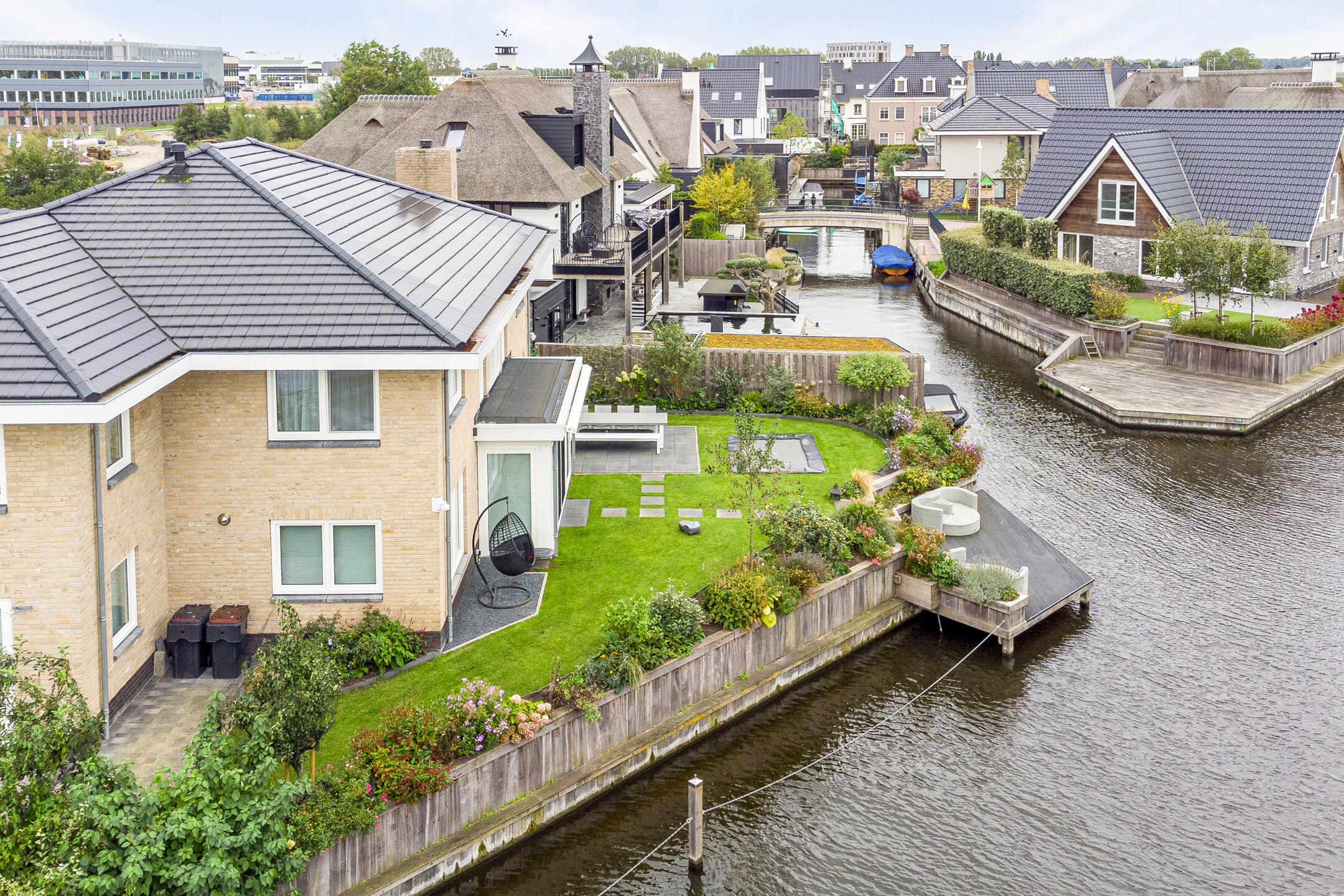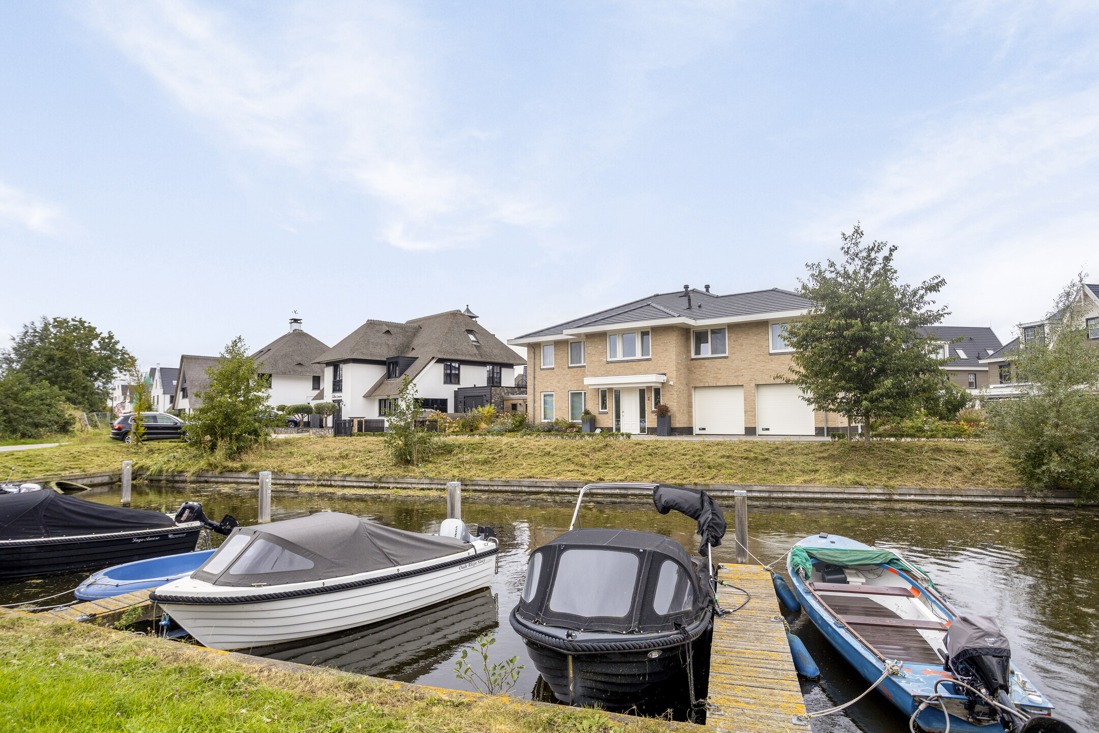 Aan de buitenzijde van de woning valt op dat deze beschikt over een zeer ruime oprit met elektrisch bedienbaar toegangshek. Aan het einde van de oprit bevindt zich een dubbele inpandige garage. Naast de woning staat de houten berging, die ook handig is voor de dagelijkse fietsen. De achtertuin is fraai aangelegd en heeft een riant terras direct aan de woning én een groot ‘deck’ aan het water. Aan de lange zijde van de tuin bevinden zich meerdere afmeerplekken voor boten, waarvan één afmeerplek is voorzien van een bootlift.