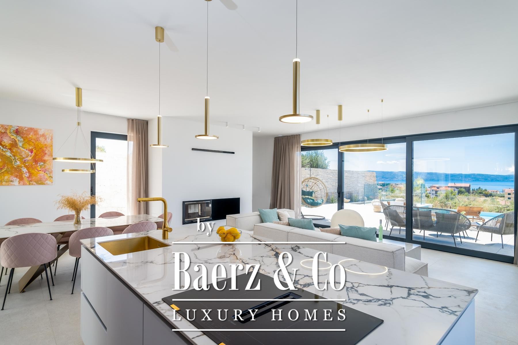 Boven bevinden zich drie slaapkamers met eigen badkamers als privé toevluchtsoord, waarvan twee met terrassen en vrij uitzicht over zee. De bovenste verdieping is gereserveerd voor de master suite: een privéterras, een serene badkamer en ononderbroken panoramische vergezichten. Hoogwaardige afwerking, privéparkeerplaats en doordachte buitenruimtes kenmerken het geheel, terwijl alle dagelijkse voorzieningen op loopafstand liggen. Dit alles zorgt voor een sfeer van ingetogen luxe. De villa in Podstrana onderscheidt zich door heldere vormgeving en een sterk gevoel voor locatie.