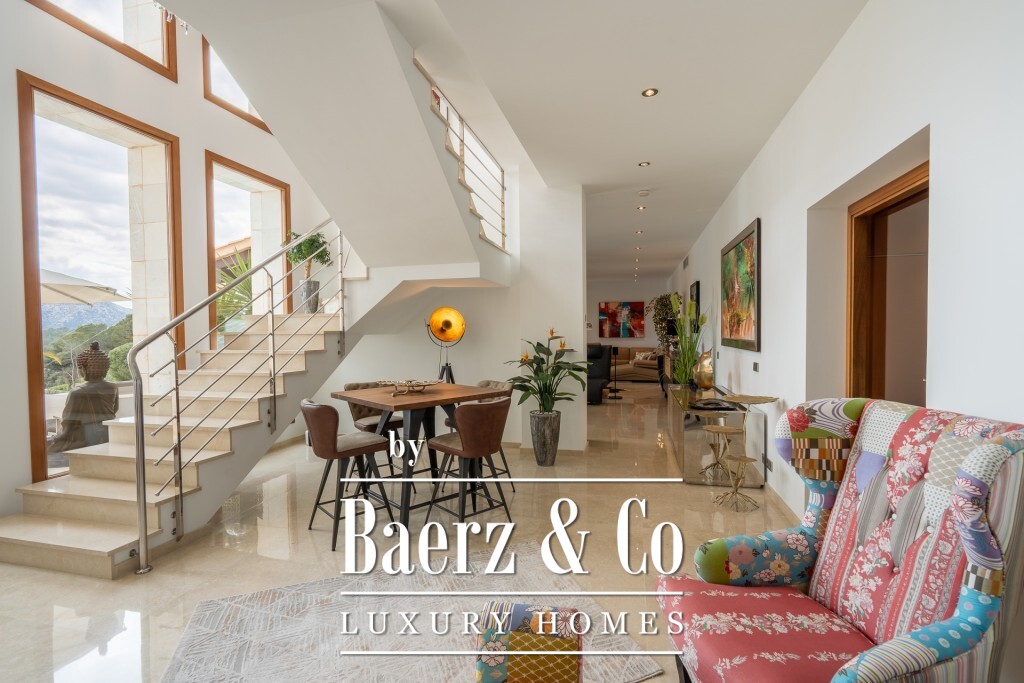 De mediterrane villa Pollença vormt een zeldzaam aanbod op een van de meest begeerde locaties van het eiland, omringd door slechts 20 exclusieve woningen en direct grenzend aan een 9-holes golfbaan. Dit perceel van 2.319 m² met 672 m² woonoppervlak ligt verhoogd in het landschap en biedt panoramisch uitzicht op zee en bergen, uitkijkend over de greens richting de baaien van Pollensa en Alcudia. Dankzij de zuidelijke oriëntatie baadt het interieur in daglicht, terwijl doordachte landscaping volledige privacy waarborgt voor het zwembad, de terrassen en de tuinen.