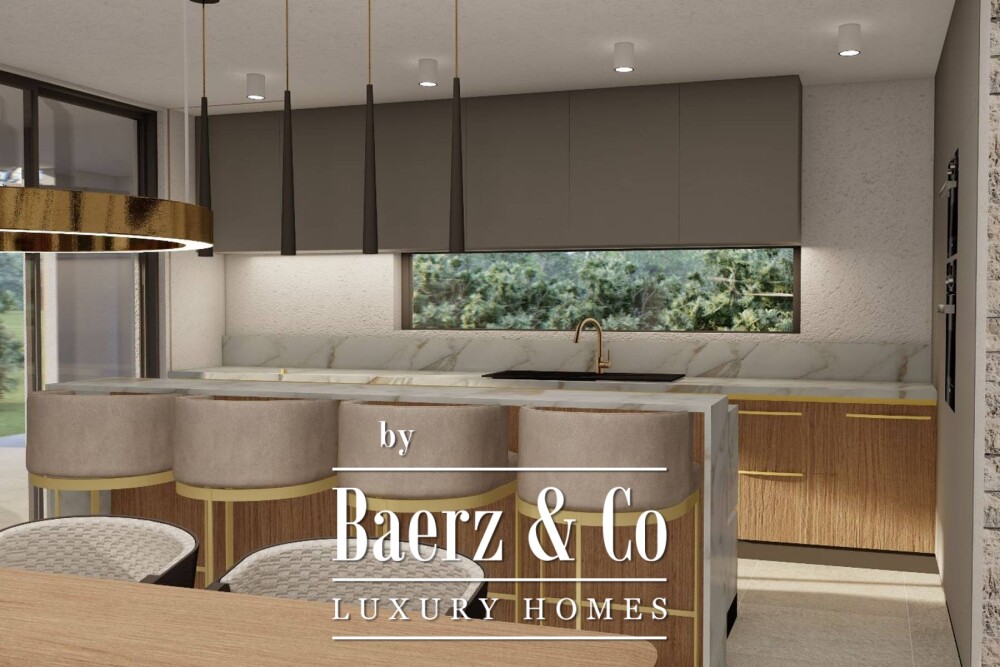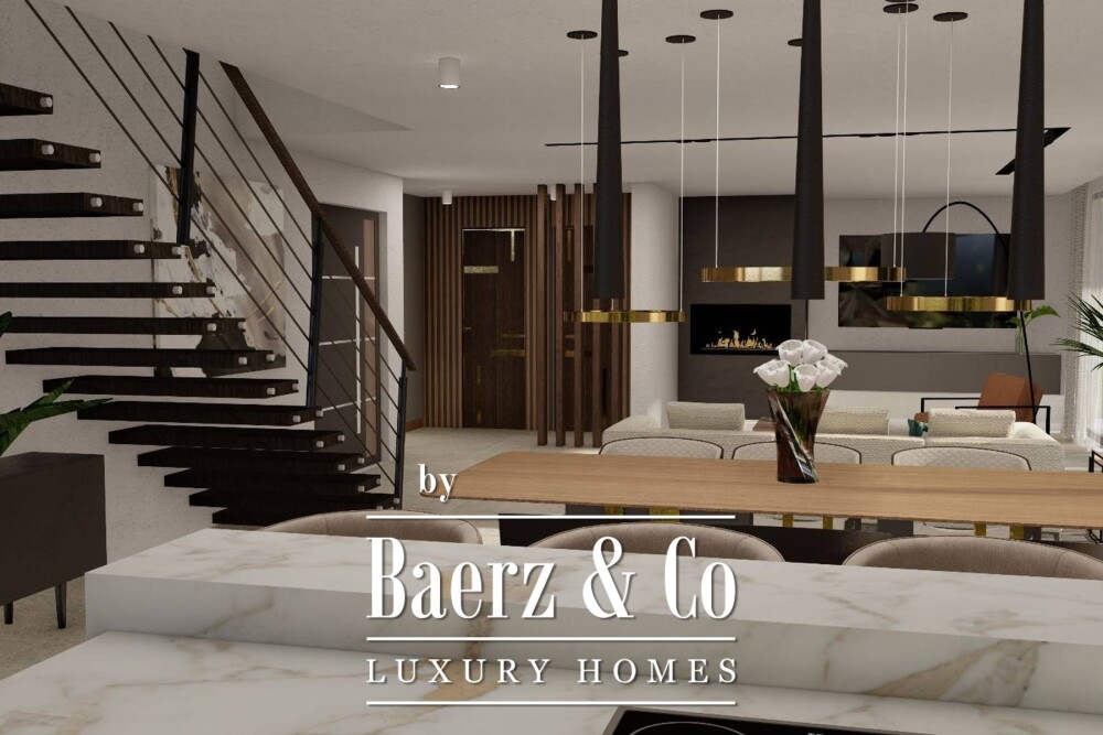 De villa is op de begane grond ingericht met een open indeling, met centraal een keuken met eiland, een lichte eetkamer, een woonkamer en discreet gelegen berging en wasruimte. Grote schuifpuien verbinden het binnenleven met buiten en geven toegang tot een overdekt terras, verwarmd zwembad, zonneterras, zomerkeuken en sauna. Elk detail straalt kwaliteit uit, van materiaalkeuze tot optimale lichtinval.