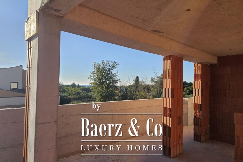 Deze halfvrijstaande woning in Poreč is gelegen op een glooiende heuvel en biedt een discrete uitkijk op zee en omliggende natuur. De architectuur strekt zich uit over 273 m² en combineert ingetogen moderniteit met lichte, open leefruimtes. De begane grond verwelkomt u met een open keuken en eetkamer, een woonkamer die naadloos aansluit op een overdekt terras, aangevuld met een gastentoilet, wasruimte en berging. Op de eerste verdieping beschikken twee royale slaapkamers over en-suite badkamers en inloopkasten, ieder met toegang tot een privéterras waar de zeelucht binnenstroomt. De tweede verdieping is volledig gereserveerd voor de master suite, voorzien van een eigen badkamer, ruime inloopkast en een royaal terras met panoramisch zeezicht.