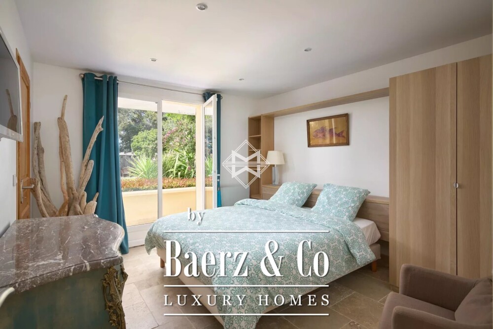 Het tuinniveau verlengt de woonbeleving met nog een woonkamer, een slaapkamer met eigen badkamer, een wasruimte en een flexibele ruimte voor uiteenlopende doeleinden. Dankzij de zuidelijke oriëntatie baadt het interieur in het zonlicht, te midden van ruim 2.300 m² vlak en aangelegd perceel. Het verwarmde zwembad van 11 bij 4 meter en het poolhouse liggen in de schaduw van volwassen beplanting; een jeu-de-boulesbaan benadrukt de Provençaalse rust. Uitzicht op zee en heuvels vormt een zeldzaam decor voor het dagelijks leven.