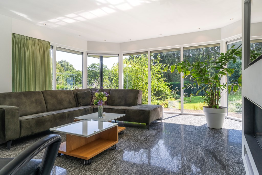 U komt binnen in een ruime, lichte hal die toegang geeft tot de woonkamer, een werkkamer, toiletruimte, meterkast (21 groepen + glasvezel) en de trapopgang. De werkkamer is ideaal en perfect bereikbaar om bijvoorbeeld klanten te ontvangen. De royale woonkamer heeft een bijzondere indeling, waardoor u gemakkelijk verschillende zithoeken kunt creëren. De grote ramen rondom bieden een prachtig uitzicht op de tuin en zorgen voor veel licht. Een sfeervolle gashaard voegt extra warmte toe. Via een dubbele schuifpui loopt u zo de zonnige achtertuin in. Aan de zonnige kant zorgen screens voor extra comfort. De ruime keuken met een eigen deur naar de tuin is ideaal voor het bereiden van maaltijden. Aangrenzend aan de keuken vindt u een bijkeuken met een aanrecht voorzien van spoelbak en aansluitingen voor de wasmachine en droger. De gehele benedenverdieping is voorzien van een natuurstenen vloer met vloerverwarming. In de woonkamer bevindt zich ook een airco.