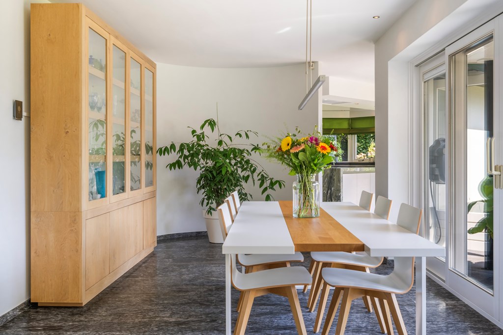 De royale, U-vormige keuken is nog maar een paar jaar oud (2020) en voorzien van hoogwaardige apparatuur. Dankzij de ruime opzet en praktische indeling is deze keuken van alle gemakken voorzien. U beschikt over een groot natuurstenen werkblad, een vijfpits kookplaat, bakoven, plafondunit afzuigkap, vaatwasser, grote koelkast, een grote vriezer en veel opberg-/kastruimte. Deze moderne keuken biedt volop ruimte om uitgebreid te kokerellen. Bovendien heeft u vanuit de keuken een prachtig uitzicht op de zij- achtertuin en directe toegang tot het terras.