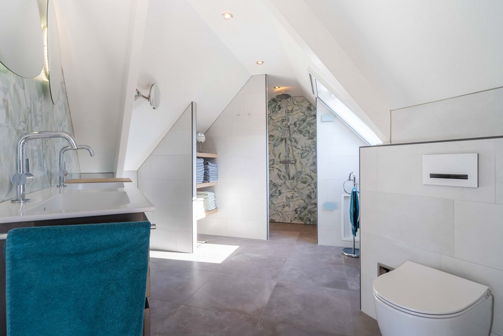 Op de begane grond bevindt zich in de hal een separate toiletruimte met fonteintje. Op de eerste verdieping zijn twee badkamers aanwezig. De badkamer die grenst aan de masterbedroom is geheel vernieuwd in 2020 en is luxe uitgevoerd en voorzien van een inloopdouche, een Sunshower, een designradiator, een dubbele wastafel en een toilet. De betegelde vloer is uitgerust met vloerverwarming voor extra comfort. De tweede badkamer, afgewerkt met witte marmeren tegels, beschikt over een douche, een wastafel, toilet en designradiator.