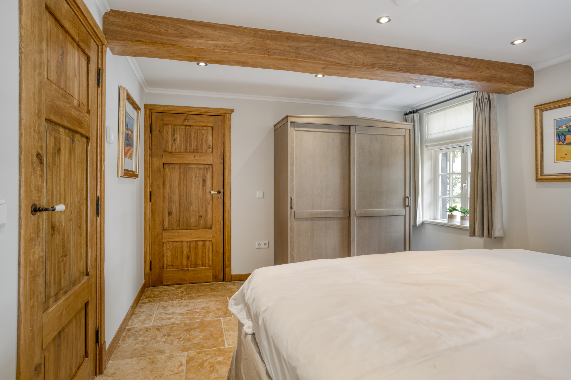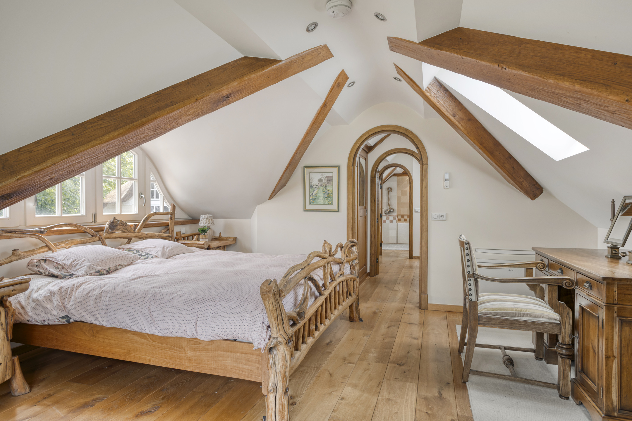 De zeer ruime slaapkamer 4 is voorzien van een houten vloer, een plafond met een zeer bijzondere balkenconstructie, twee dakkapellen en een grote walk in closet. Een grote karakteristieke raampartij biedt een prachtig uitzicht over de parkachtige tuin. Badkamer 2 is voorzien van marmeren vloer- en wandbetegeling, een dakkapel, sierradiator, wandcloset, ligbad, douche en dubbele wastafel in meubel.