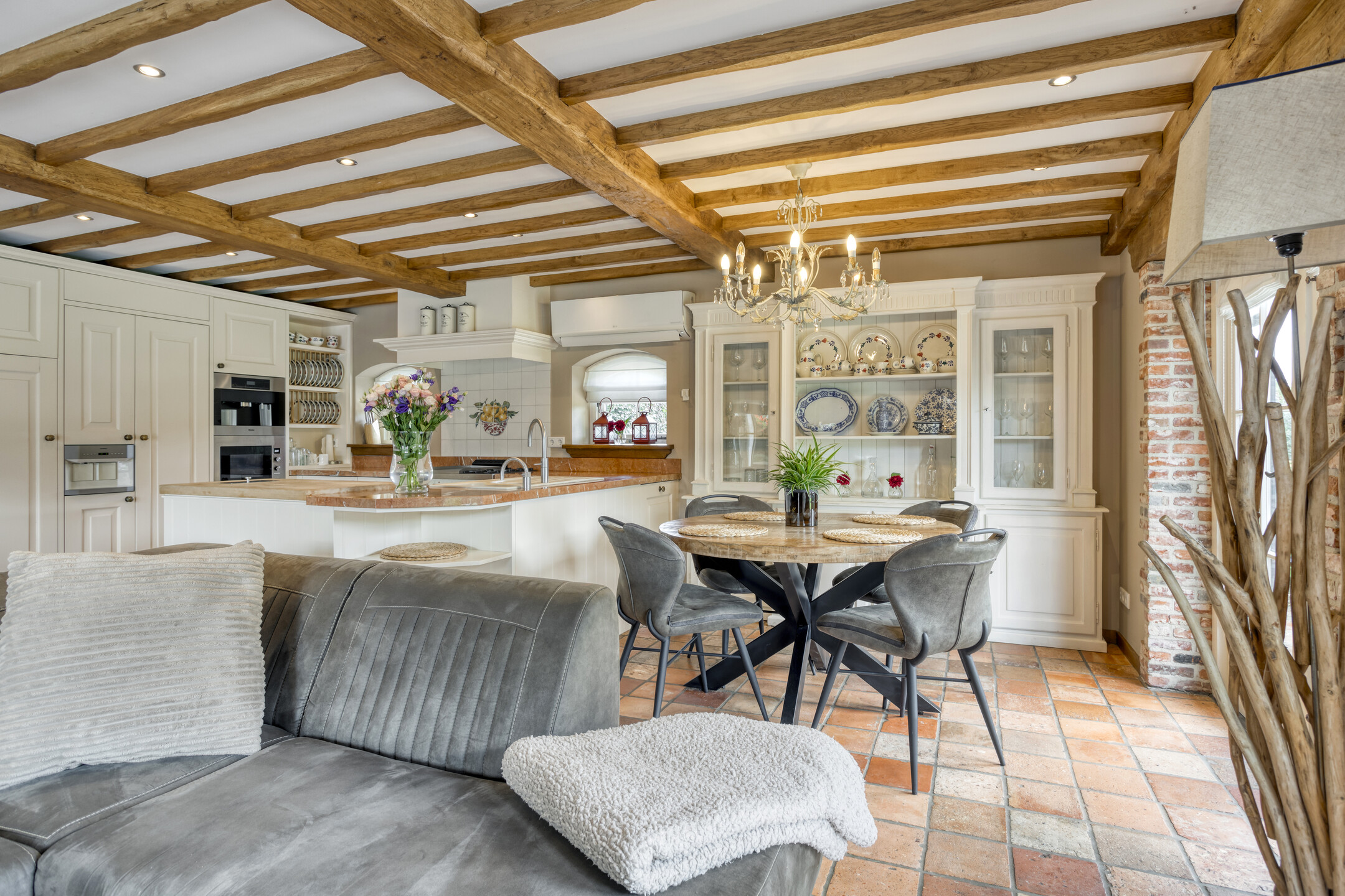 - De woonboerderij en bijgebouw beschikken over hoge plafonds met prachtige balkenconstructie en karakteristieke
