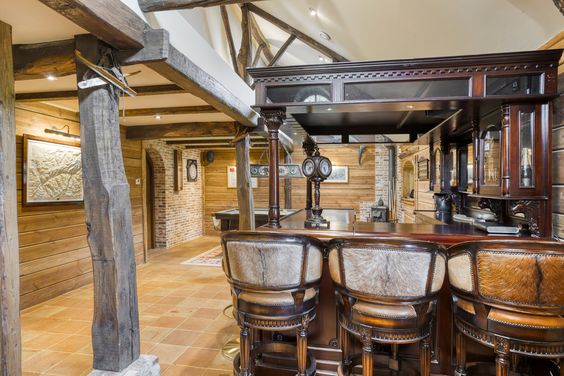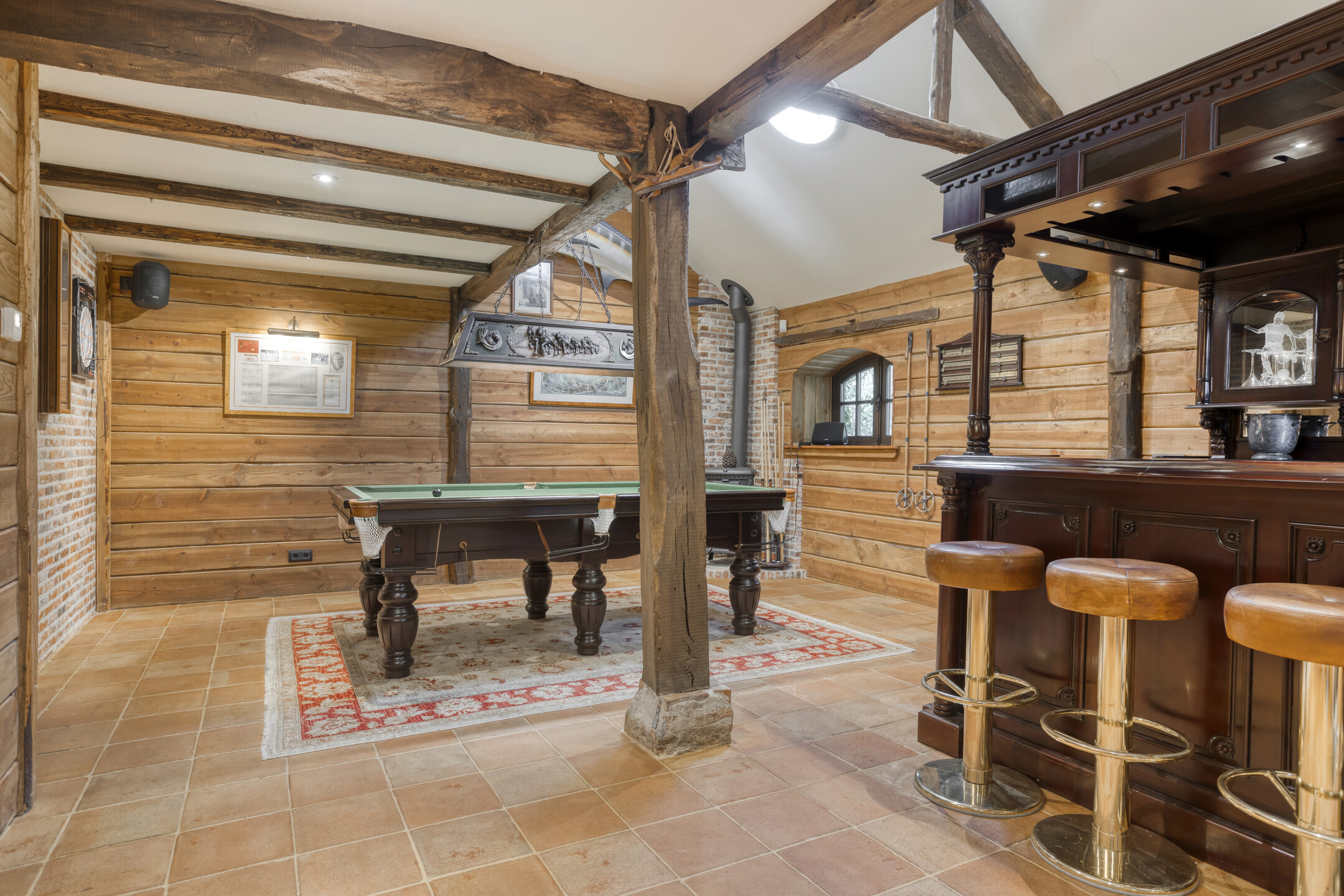 De voormalige garage is volledig verbouwd en voorzien van een rieten dak. Een deel van dit 'gepotdekselde' bijgebouw is in gebruik als berging. Deze is toegankelijk via een deur bij de carport. Op de begane grond bevindt zich verder een grote ontspanningsruimte. De hal is voorzien van natuurstenen vloerbetegeling, een grote kast met daarin de meterkast, de toiletruimte en een fraaie hardhouten trapopgang naar de eerste verdieping. Vanuit de hal is ook de ontspanningsruimte bereikbaar. Toiletruimte met natuurstenen vloerbetegeling, vrij hangend closet, urinoir en een designmeubel met fonteintje. Grote, sfeervolle ontspanningsruimte met natuurstenen vloerbetegeling, balkenplafond met inbouwspots en een glazen doorkijkje naar de erboven gelegen fitnessruimte/gym. Deze ontspanningsruimte is voorzien van een grote stijlvolle bar met ‘drankkast’, gezellige zithoek en een ingebouwd geluidssysteem. Op dit moment is deze ruimte deels in gebruik als ‘biljartkamer’. De toegangsdeur van de berging bevindt zich bij de carport. De berging biedt volop ruimte en is voorzien van een ingebouwde kastenwand. In de berging bevinden zich ook de installatie van de vloerverwarming en de aansluitingen voor de CV- en beregeningsinstallatie.