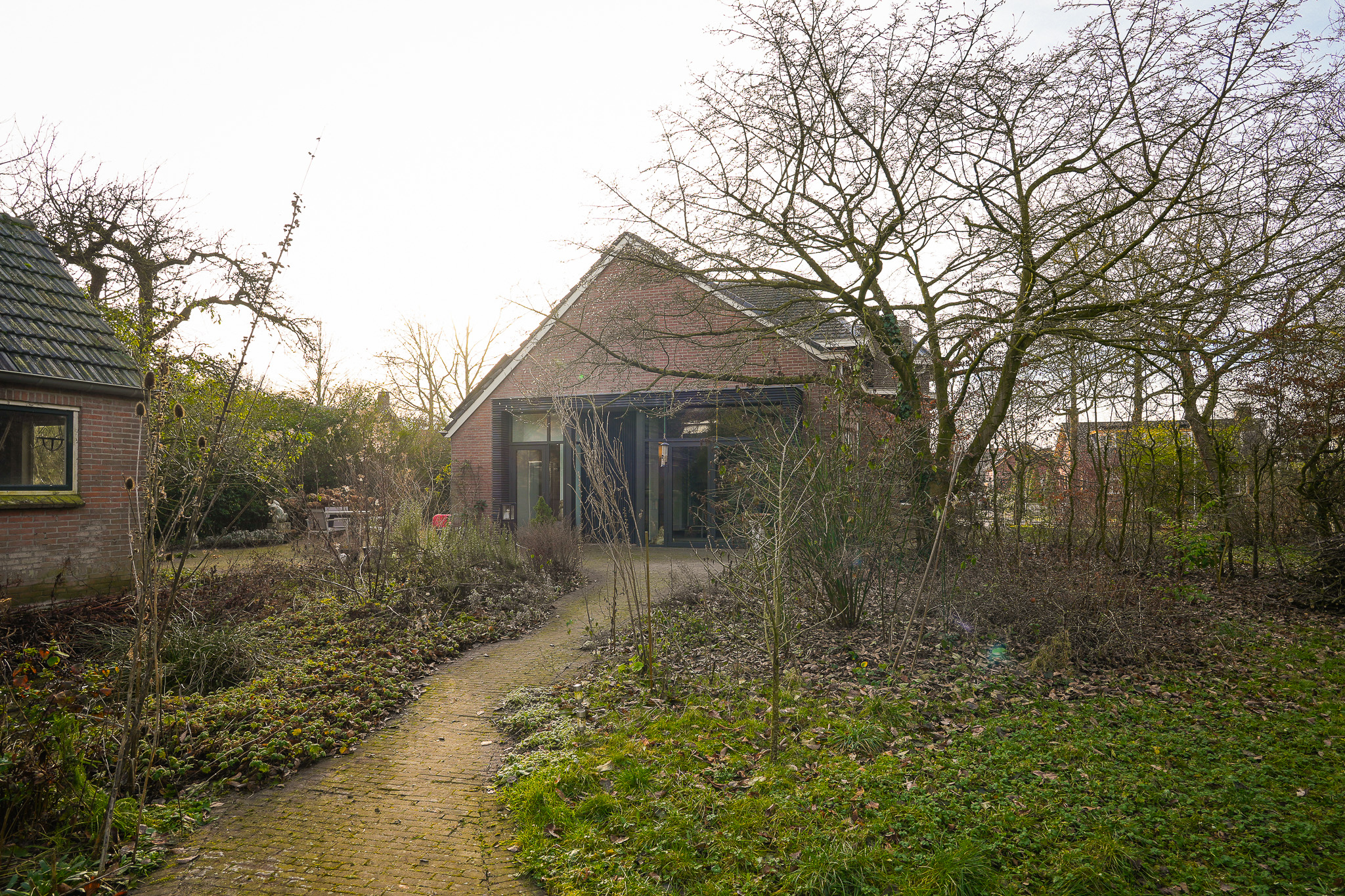 De entree voert naar een L-vormige gang, die toegang geeft tot de verschillende vertrekken, waar licht en hoogte meteen opvallen. Halverwege de gang bevindt zich de fraaie trap naar de eerste verdieping met een karakteristiek bordes. Aan de voorzijde ligt de woonkamer en suite, verdeeld in een zit- en eetgedeelte. Deze ruimte wordt gekenmerkt door originele schuifdeuren met glas-in-lood en een erker. In het eetgedeelte zorgen de parketvloer en vaste inbouwkasten voor een rustige en verzorgde uitstraling; in het zitgedeelte dragen het balkenplafond, de maatwerk wandkasten en de stoere houtkachel bij aan een warme, huiselijke sfeer.