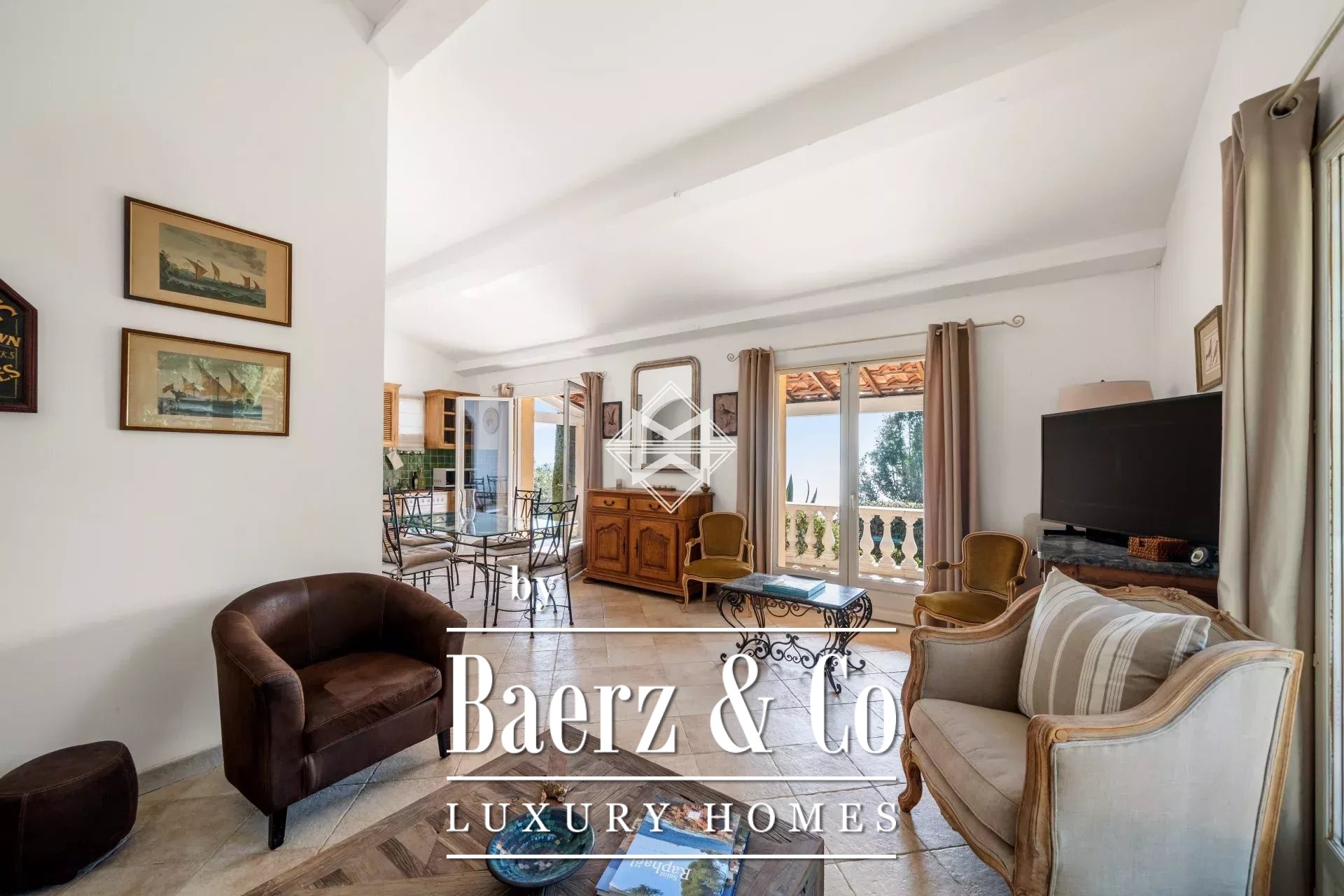 Een overdekt terras grenst aan de woonkamer en biedt schaduwrijke verkoeling met directe toegang tot het lagergelegen zwembad, waar de zee zowel landschap als achtergrond vormt. De twee slaapkamers en de enige badkamer zijn gericht op eenvoud en comfort, in harmonie met de stille aanwezigheid van de omringende Estérel-heuvels.