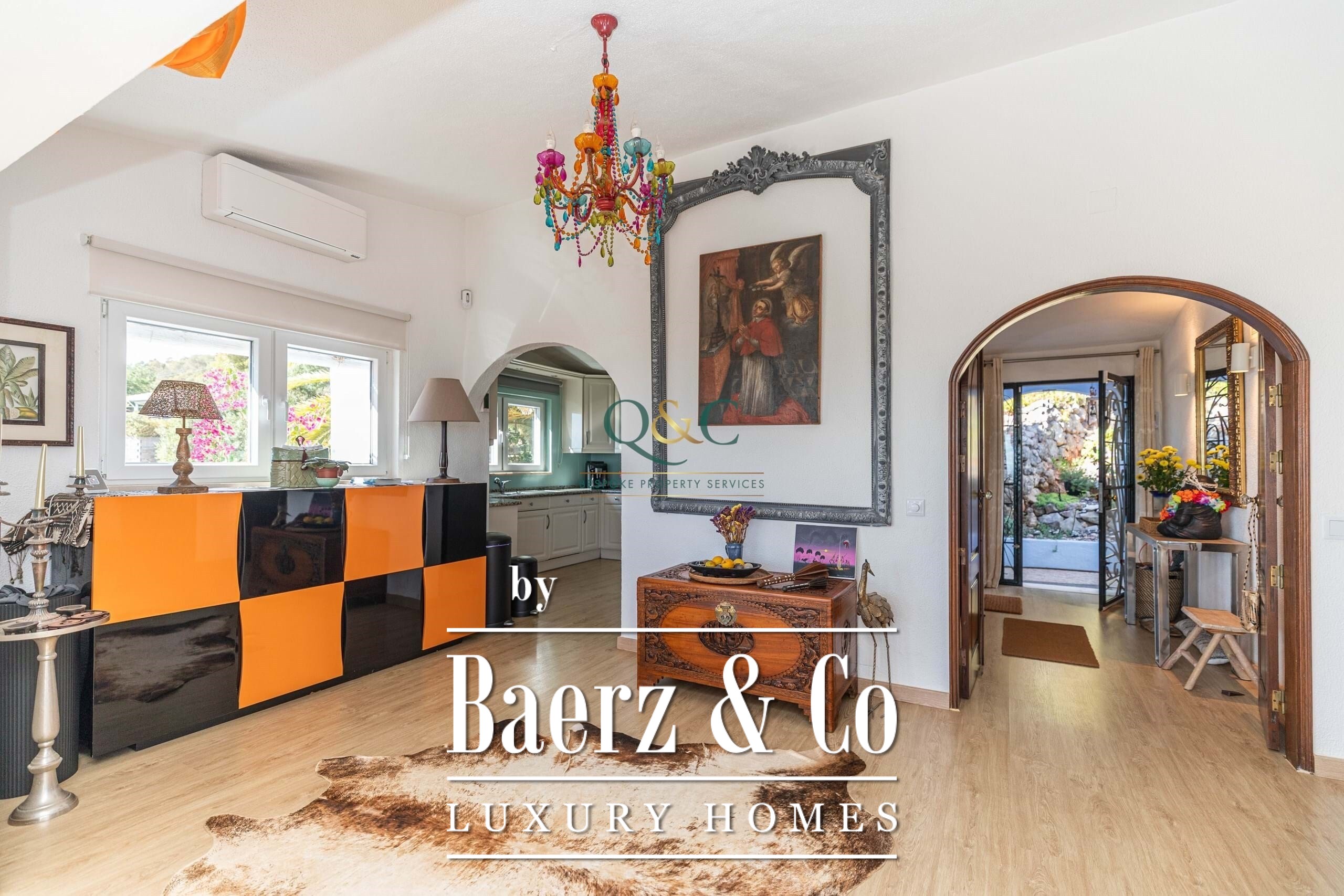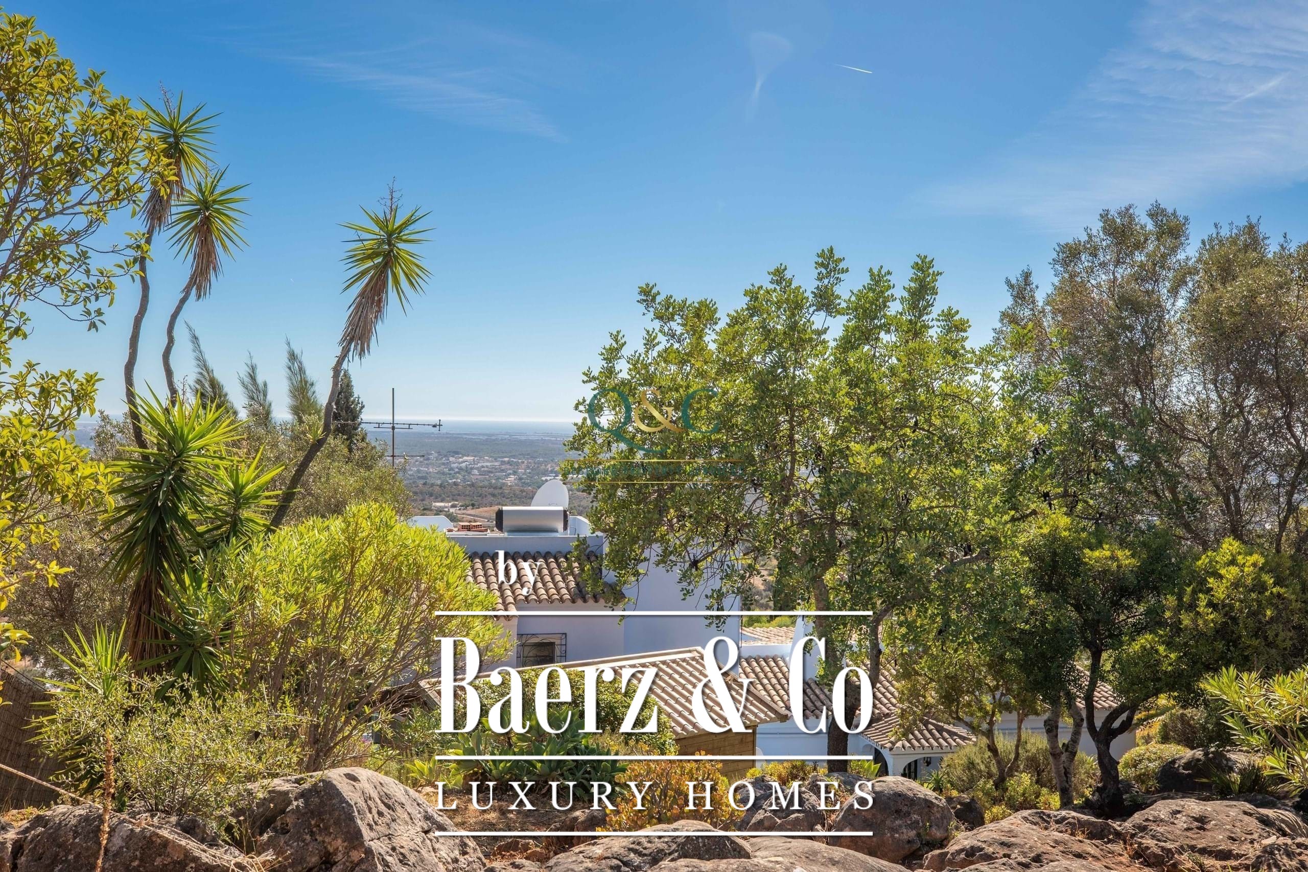 Set within a fully fenced plot, electric gates open to a sweeping calcada driveway leading to a garage, carport, and ample parking. The beautifully landscaped gardens feature mature trees and a well-chosen selection of drought-tolerant plants, creating a lush yet low-maintenance haven.