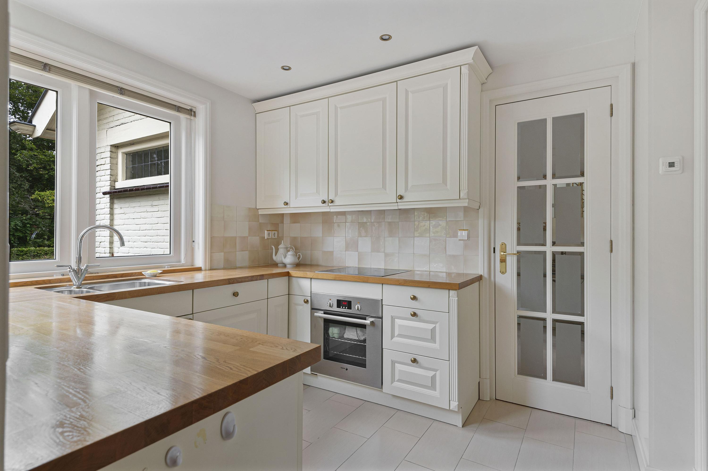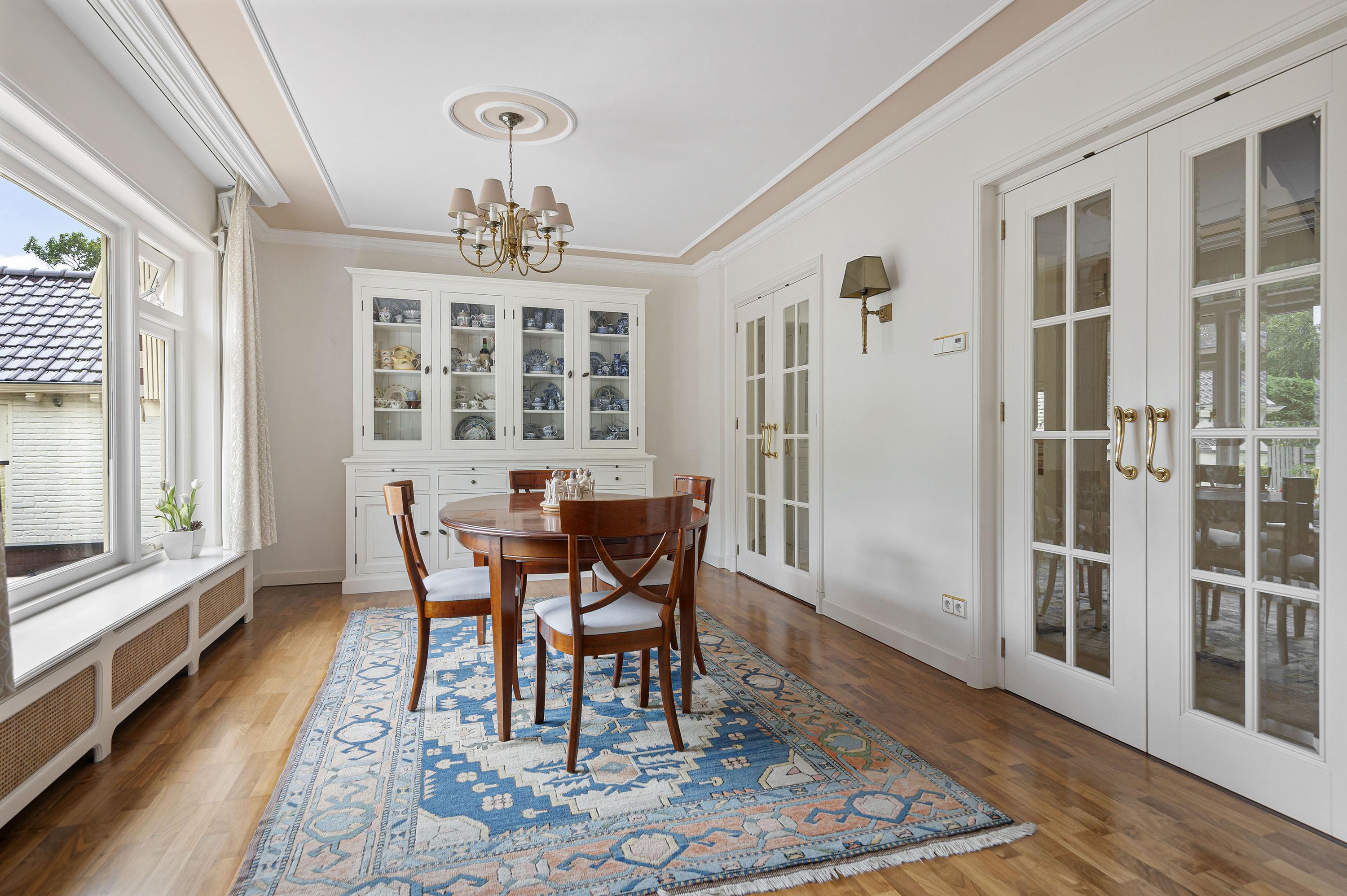 Entree in zeer ruime hal, sfeervolle glas in lood ramen, toilet en verdiepte garderobe. De woonkamer is opgesteld in L-vorm, heeft veel lichtinval, sfeervolle gashaard en is voorzien van een prachtige houten parketvloer. De serre en tweede woonkamer zijn later aangebouwd waardoor er veel extra ruimte is gecreëerd welke meerdere mogelijkheden geven. De serre en tweede woonkamer zijn voorzien van een nette tegelvloer met vloerverwarming. De keuken is gelegen aan de voorzijde van de woning welke tevens toegang biedt tot de ruime bijkeuken.