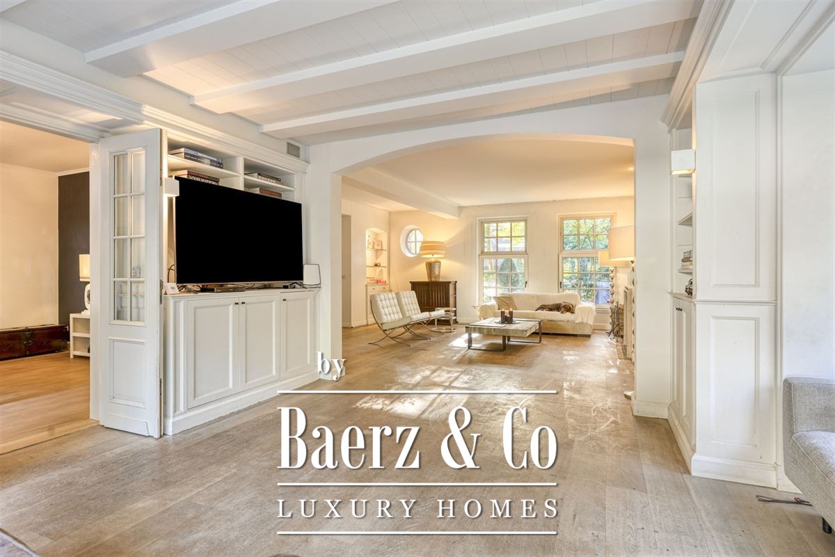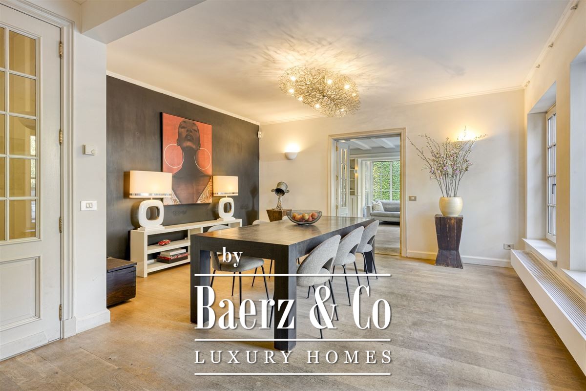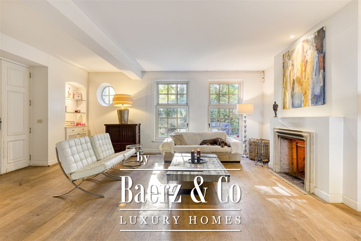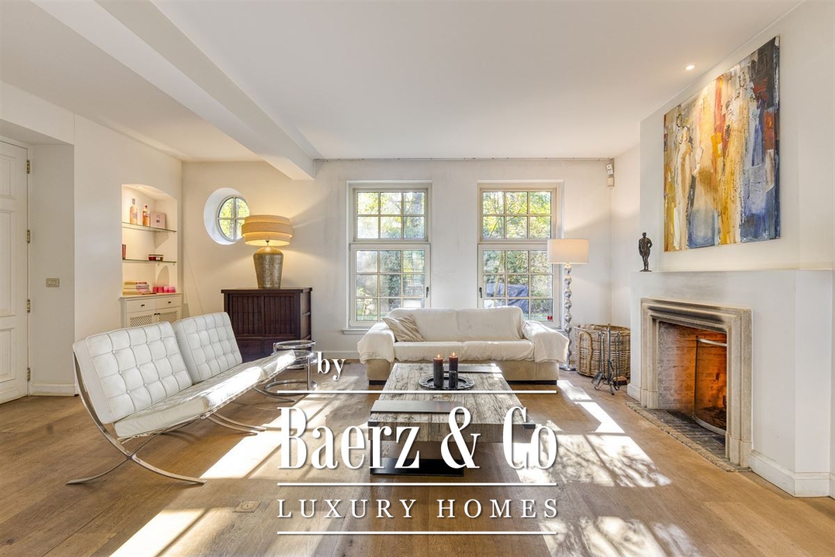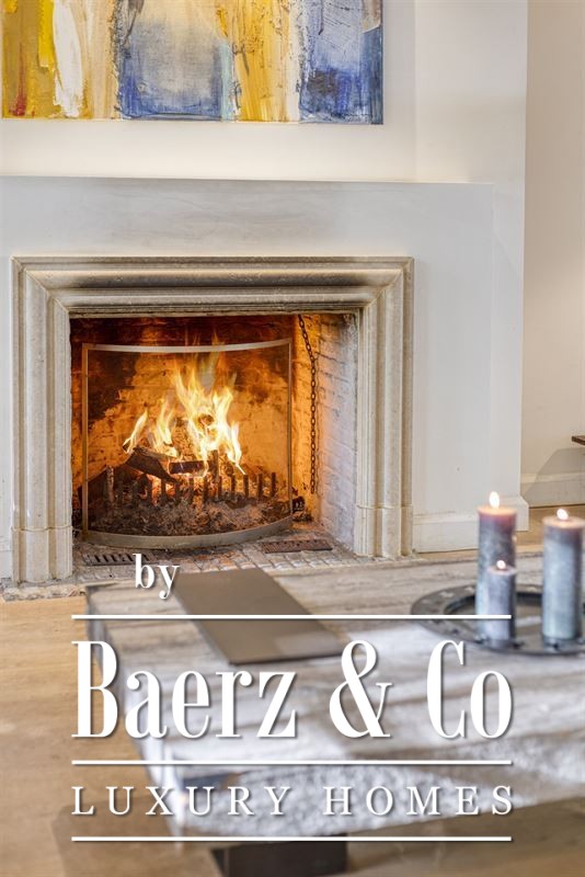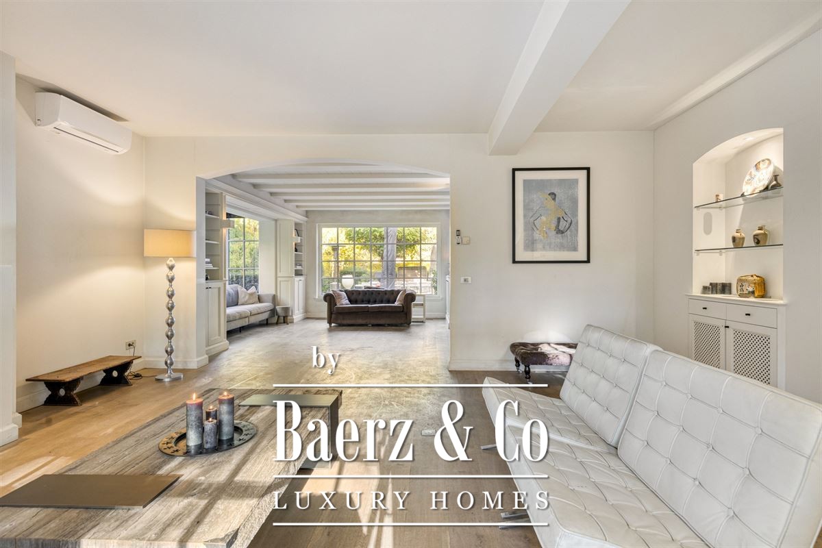 De leefruimte op eiken parket baadt in het licht dankzij grote raampartijen met zicht op de tuin. De open haard en airco zorgen voor ultiem comfort.