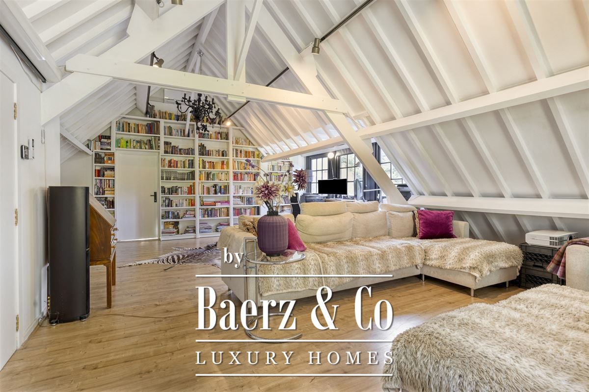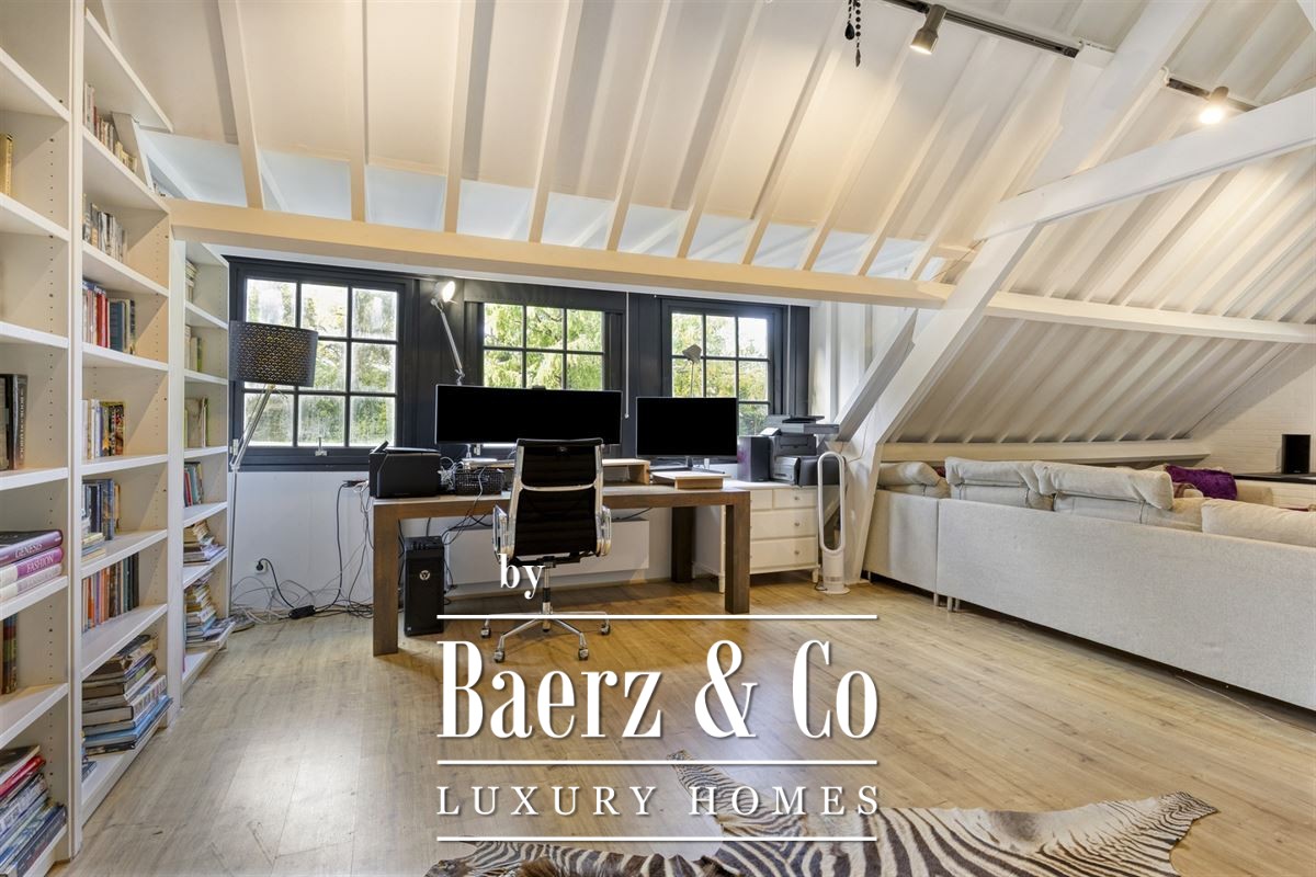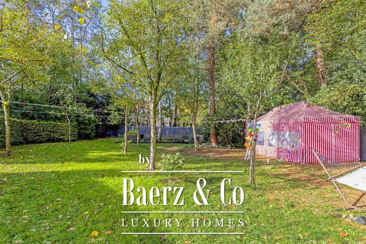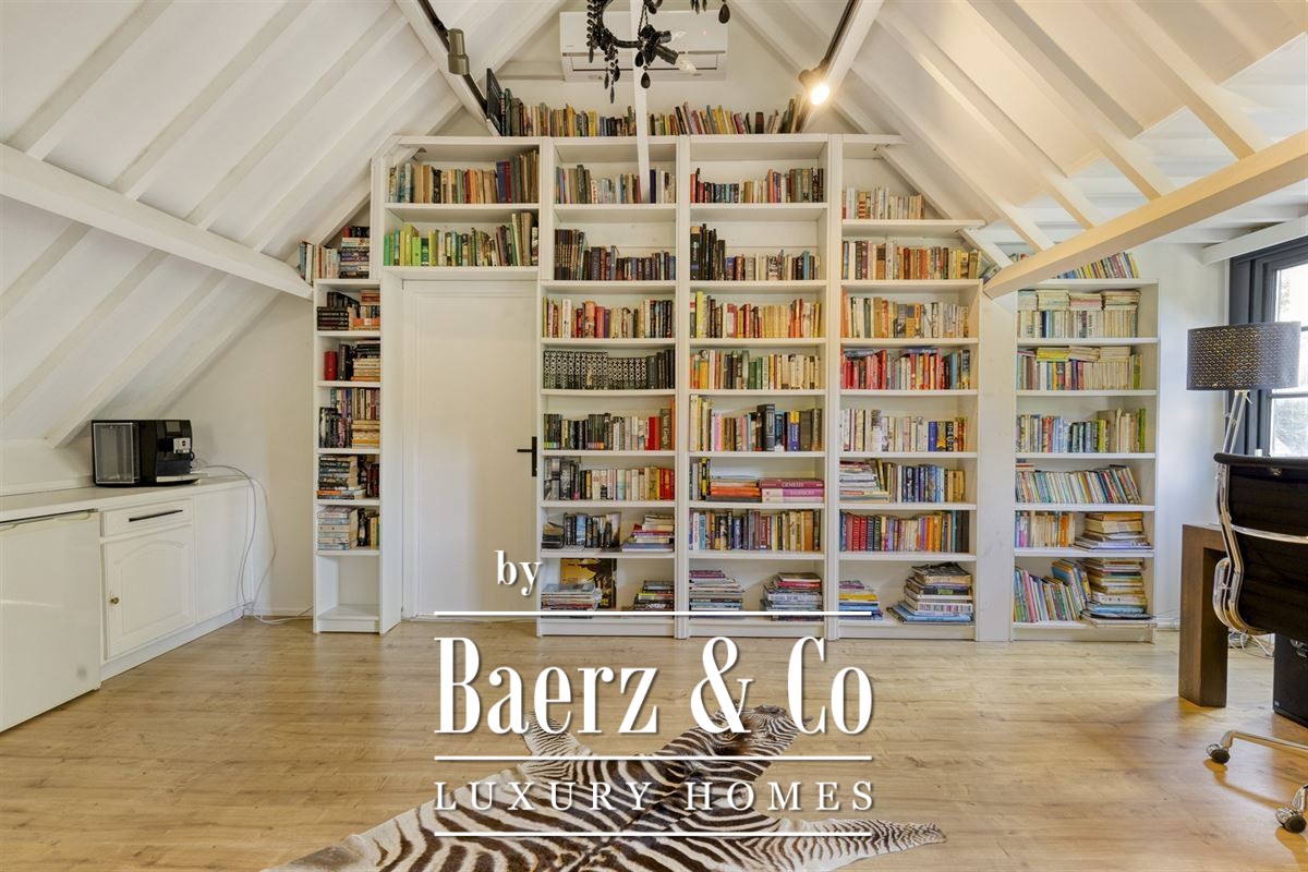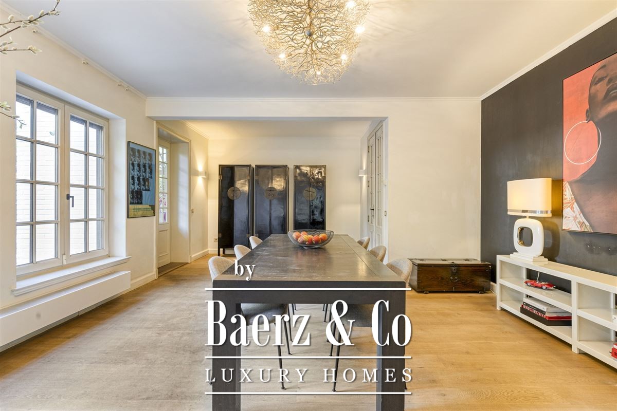 De leefruimte op eiken parket baadt in het licht dankzij grote raampartijen met zicht op de tuin. De open haard en airco zorgen voor ultiem comfort.