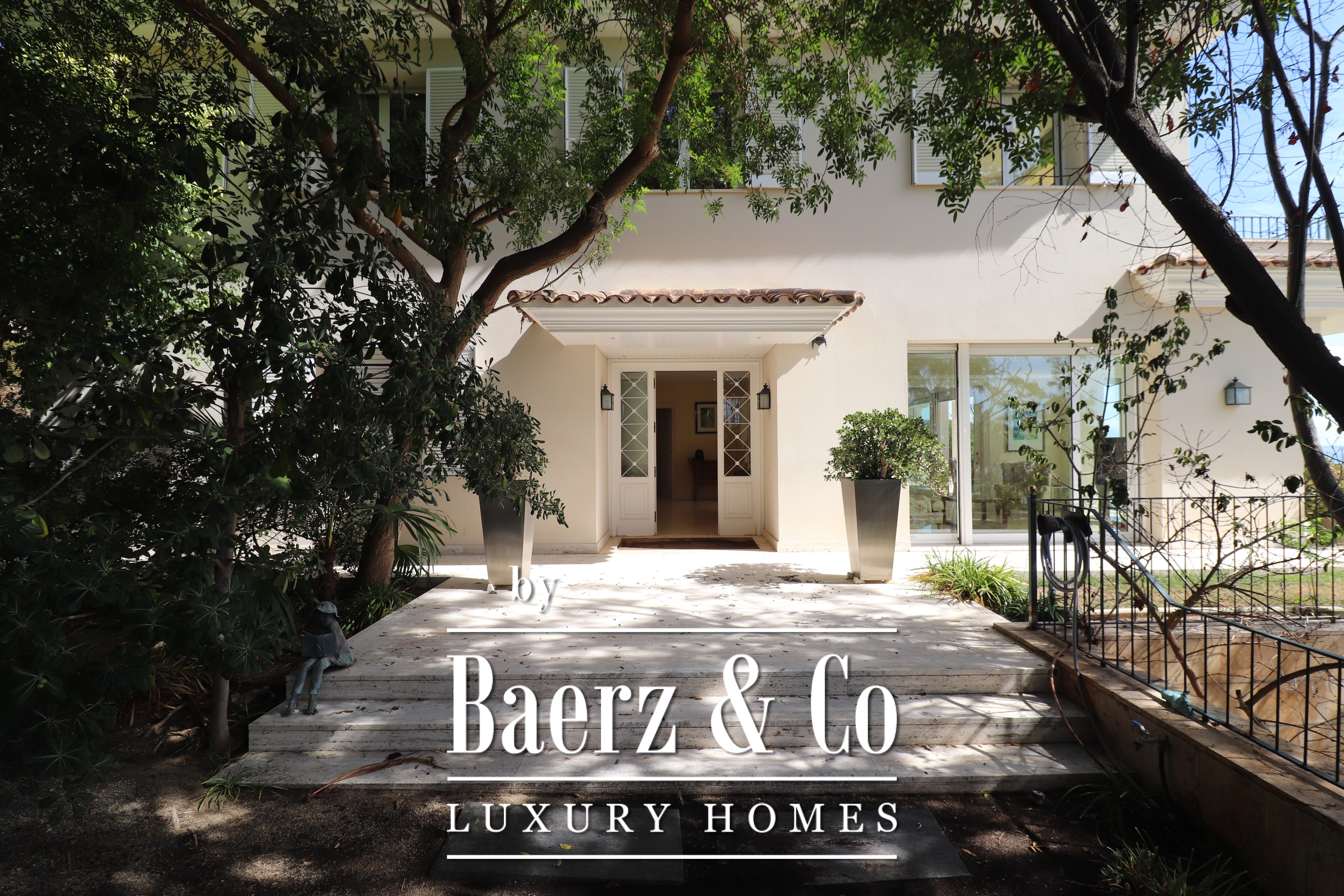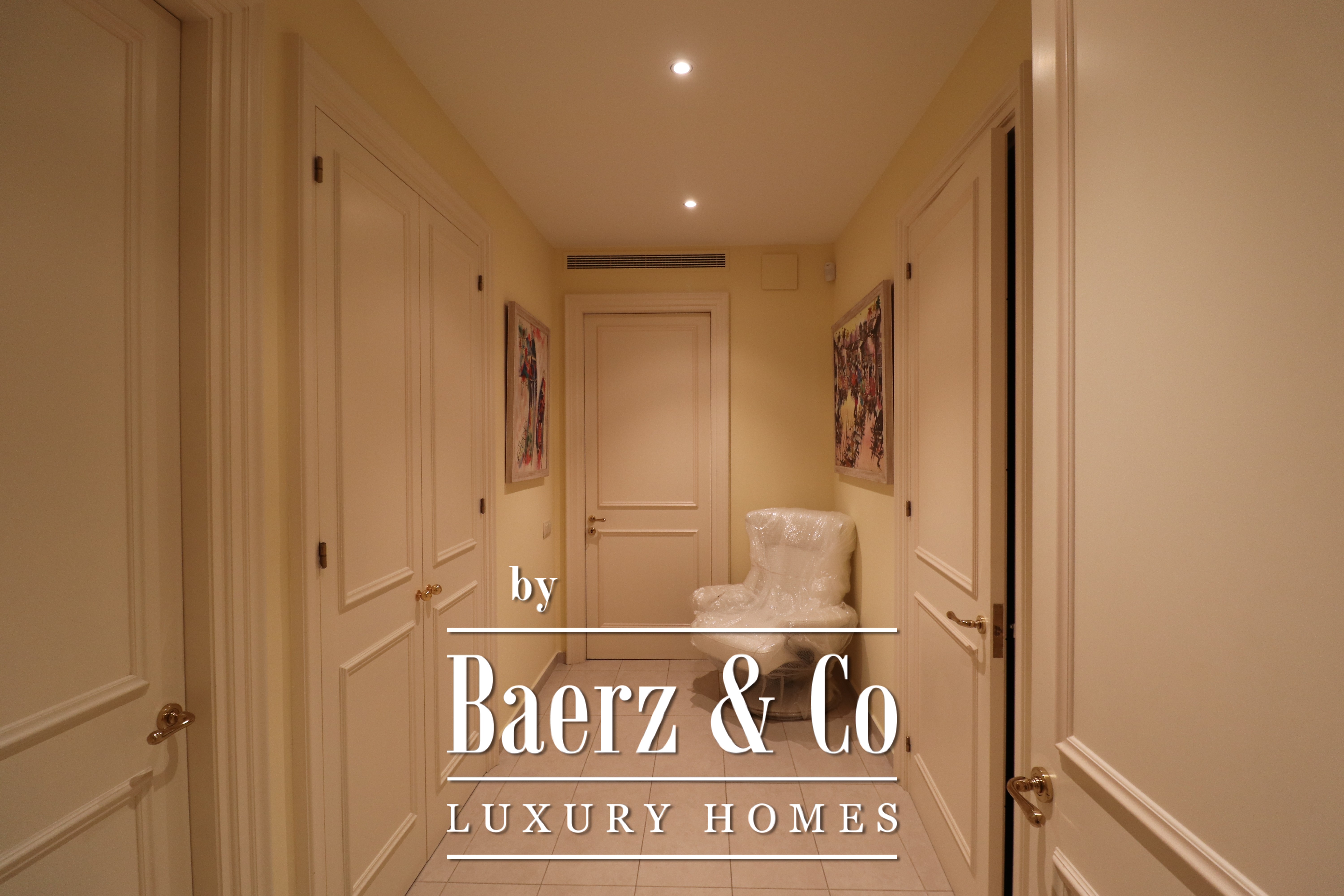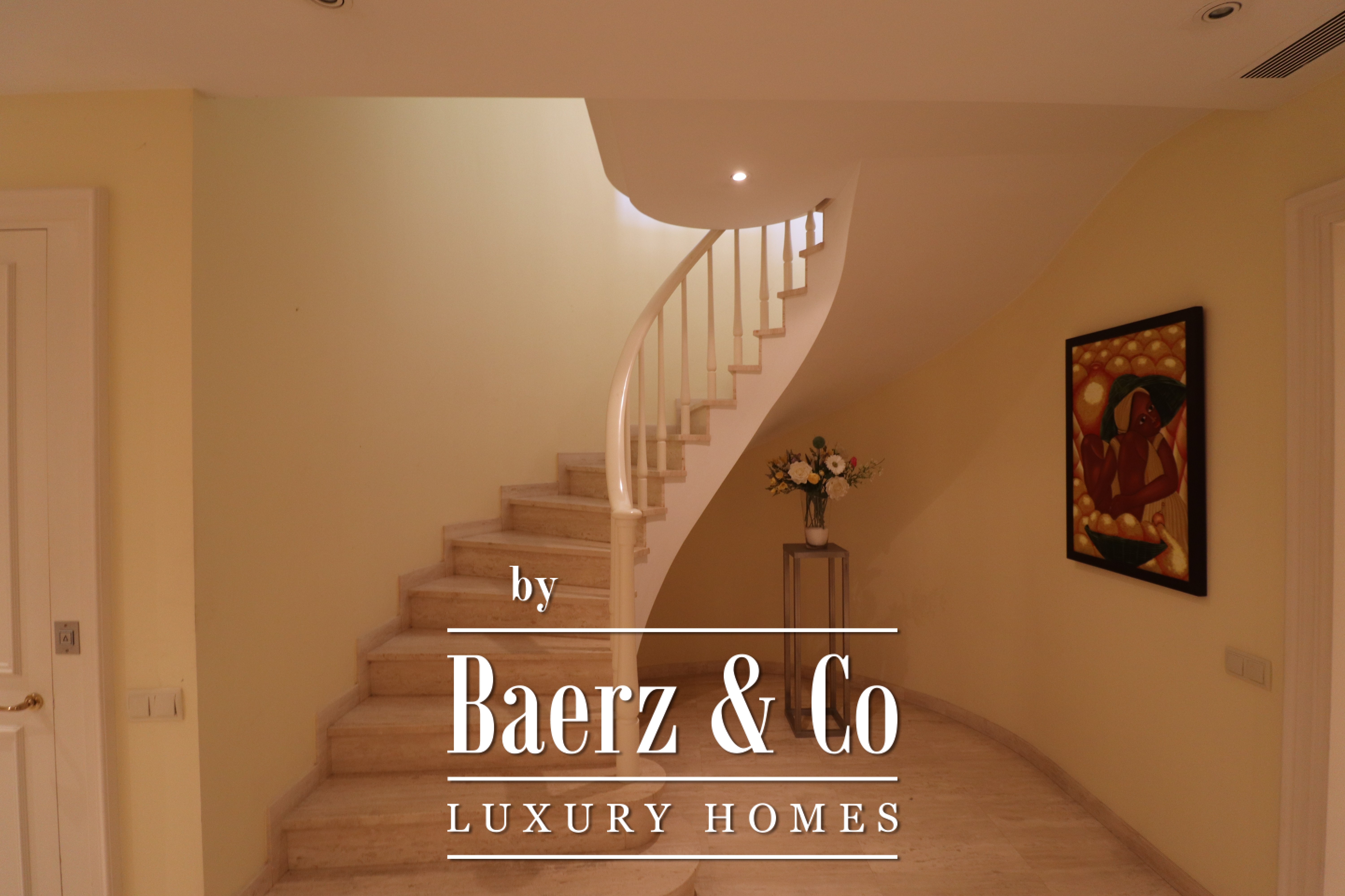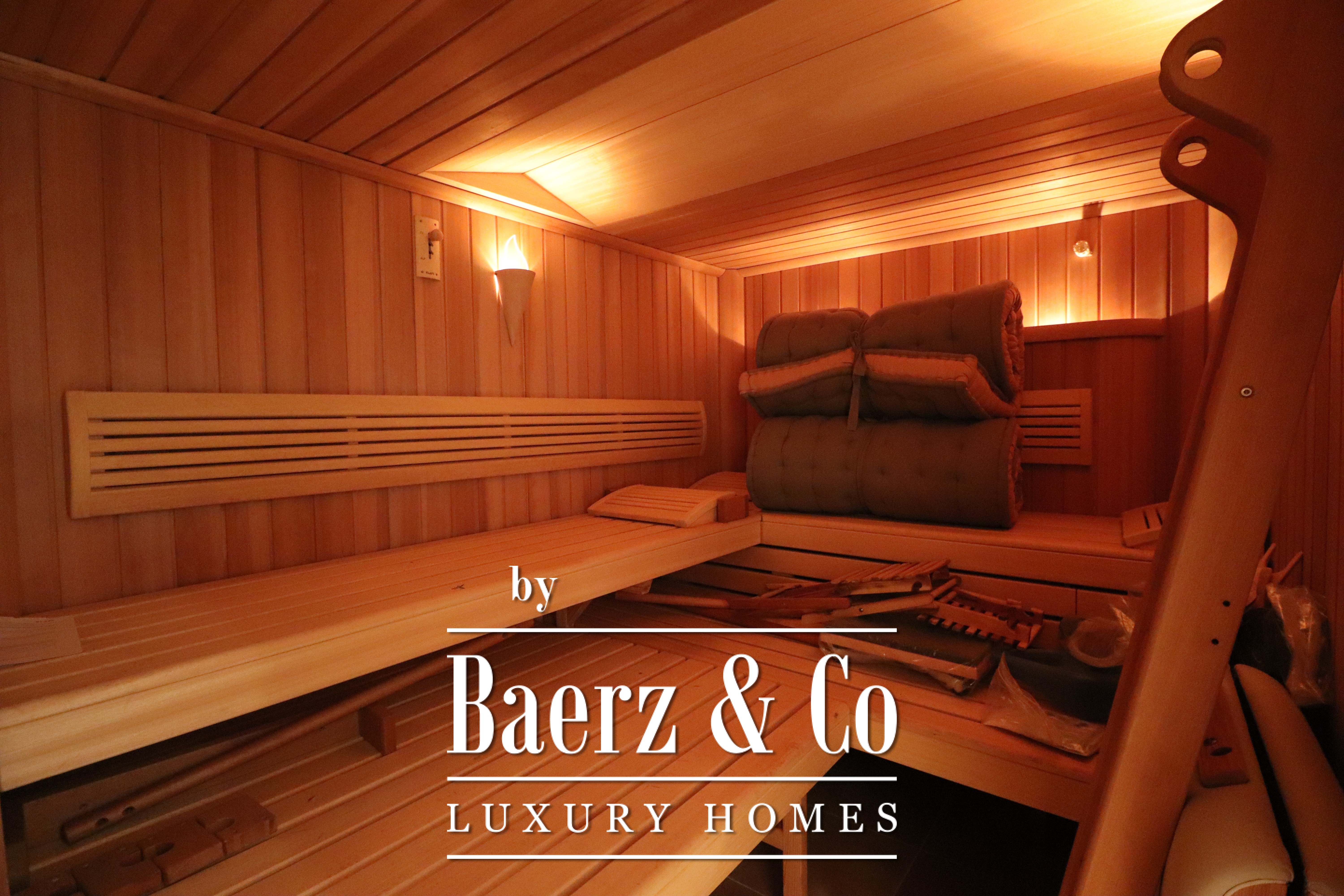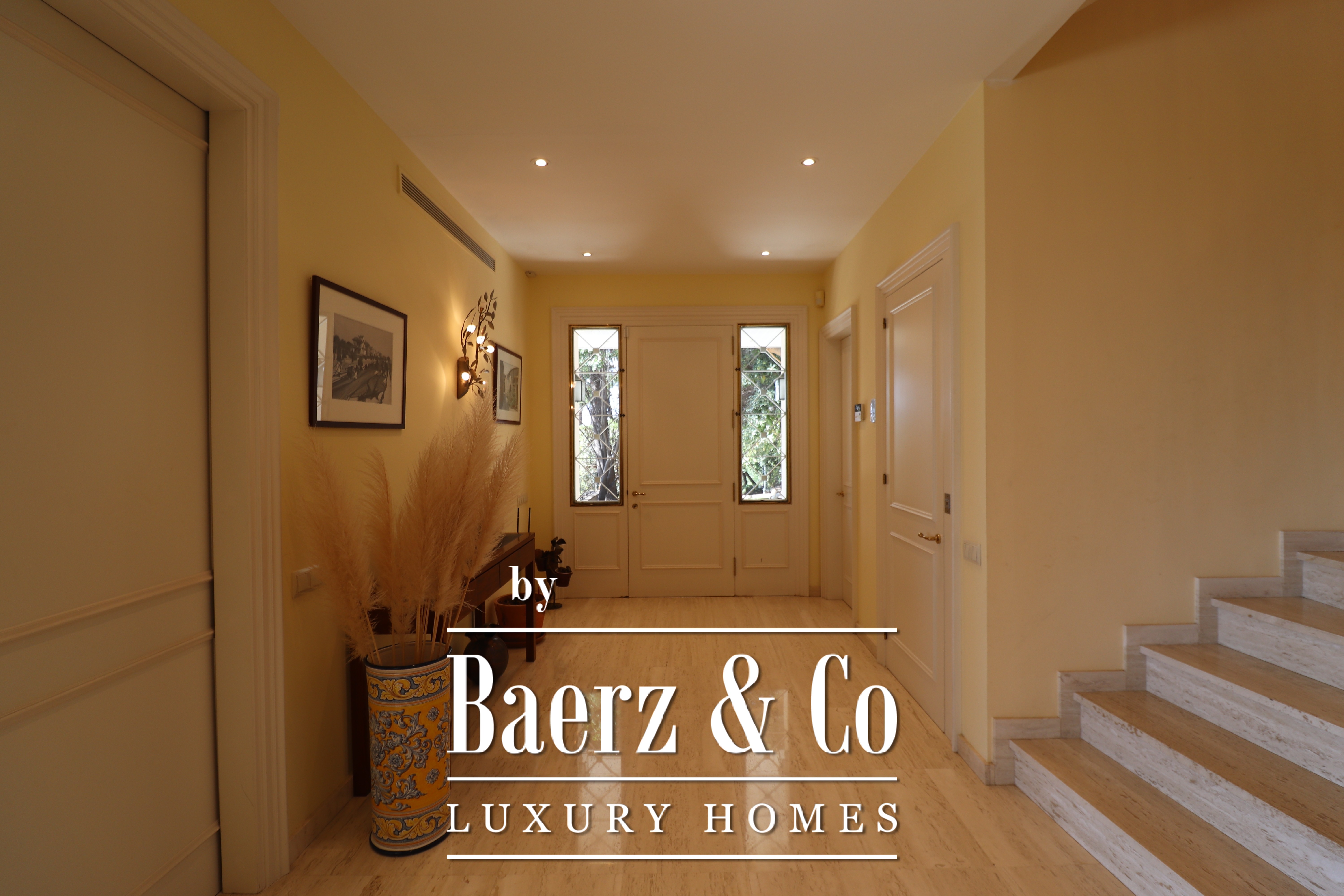 Ontworpen met oog voor discretie en comfort, spreidt de villa zich uit over drie verdiepingen, verbonden door een privé-lift. De hoofdverdieping begint met een stijlvolle entreehal en vloeit over in een open leefruimte met een salon en eetkamer, een mediaruimte, en een volledig uitgeruste keuken met aangrenzende bijkeuken en een dedicated kantoor. Vijf slaapkamers en acht badkamers bieden ruimte aan gezinsleven én grootschalig ontvangen.