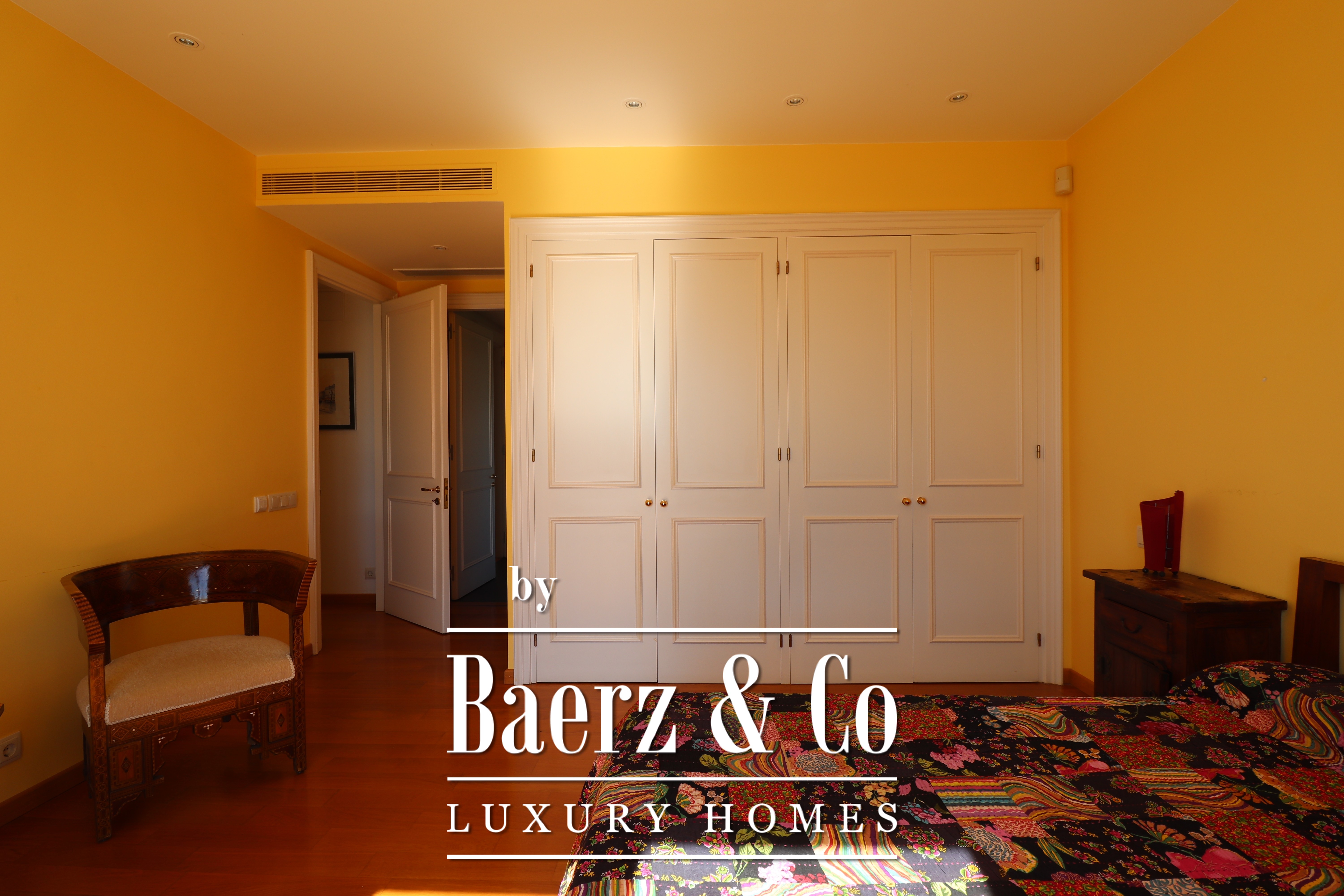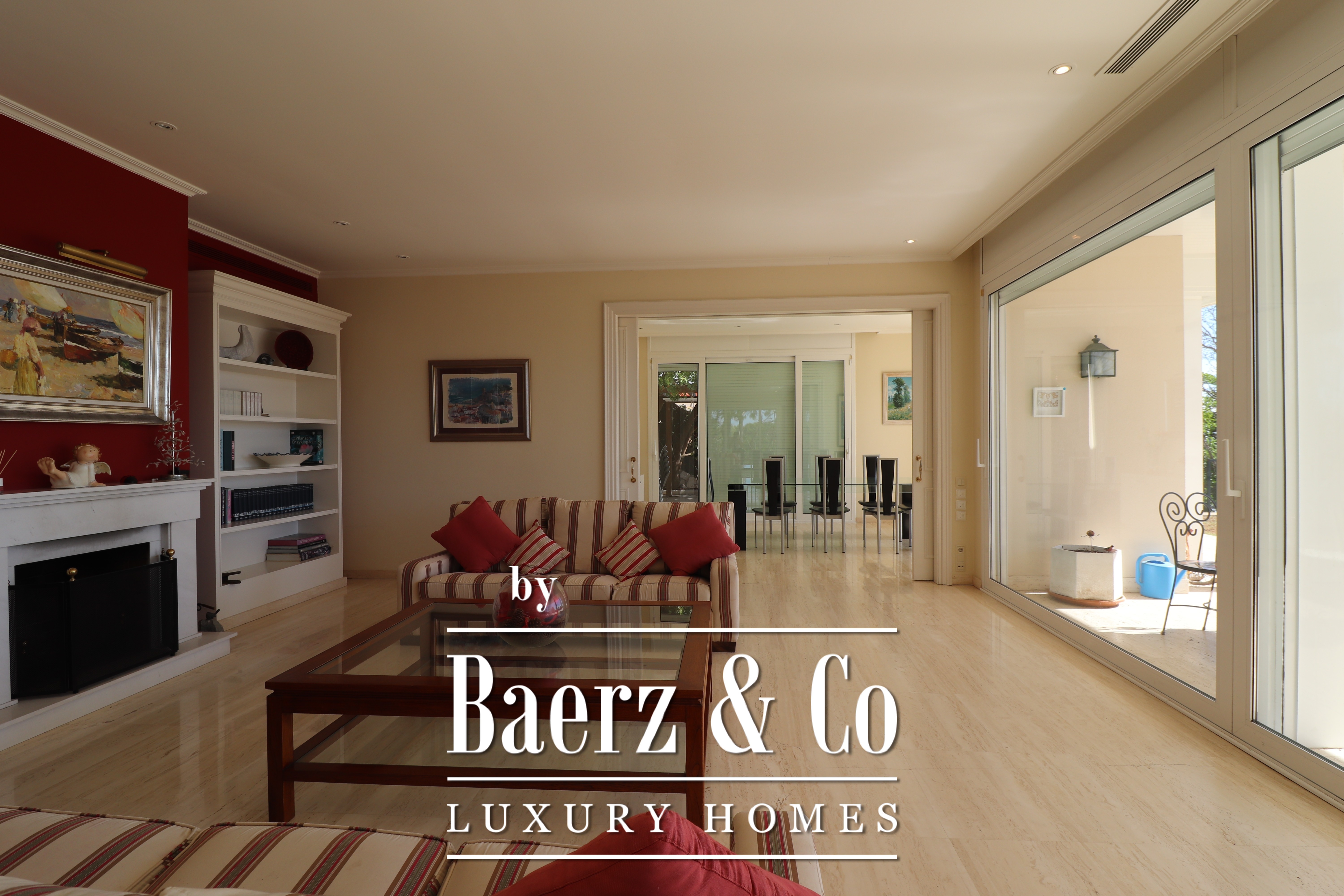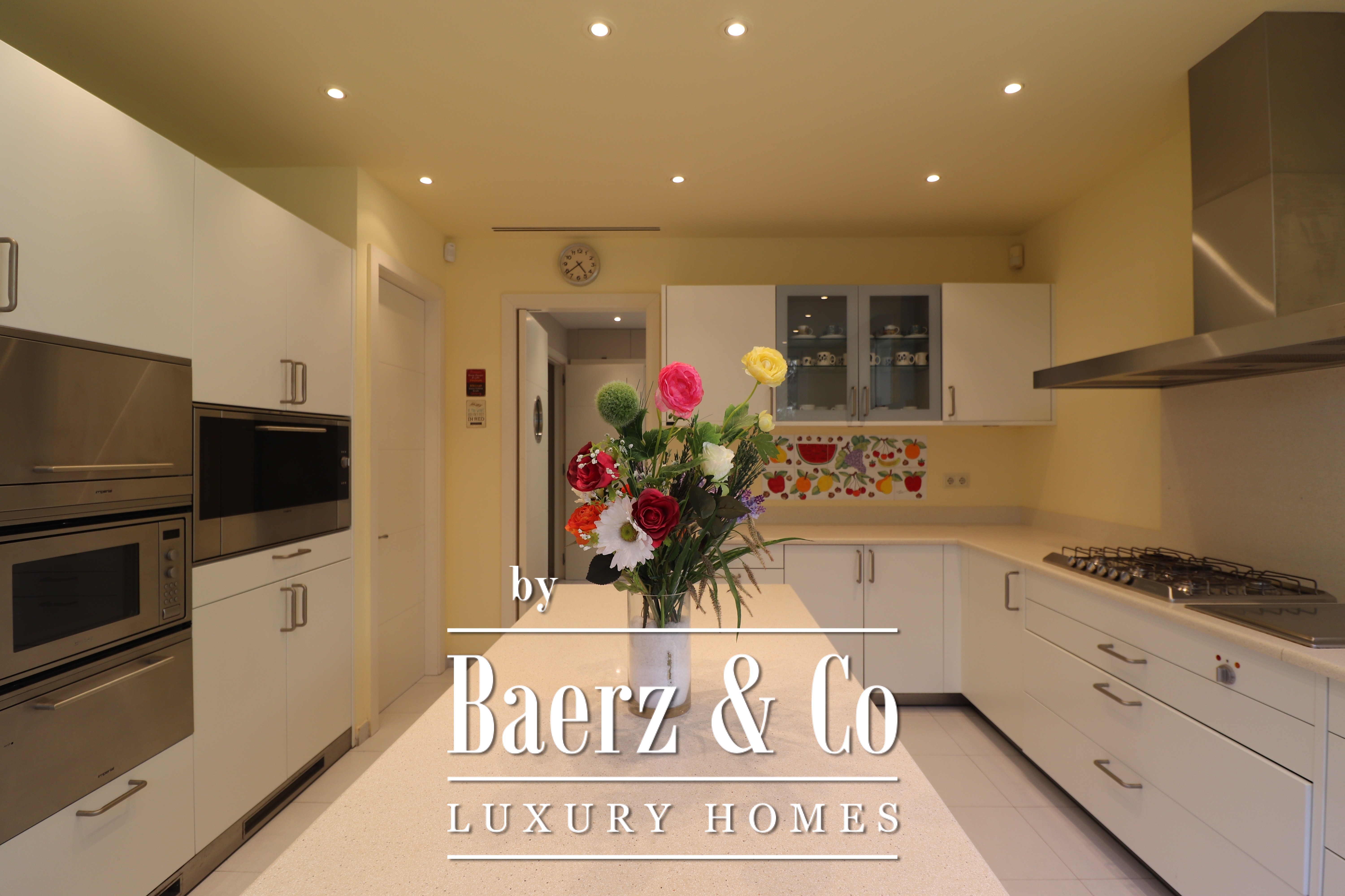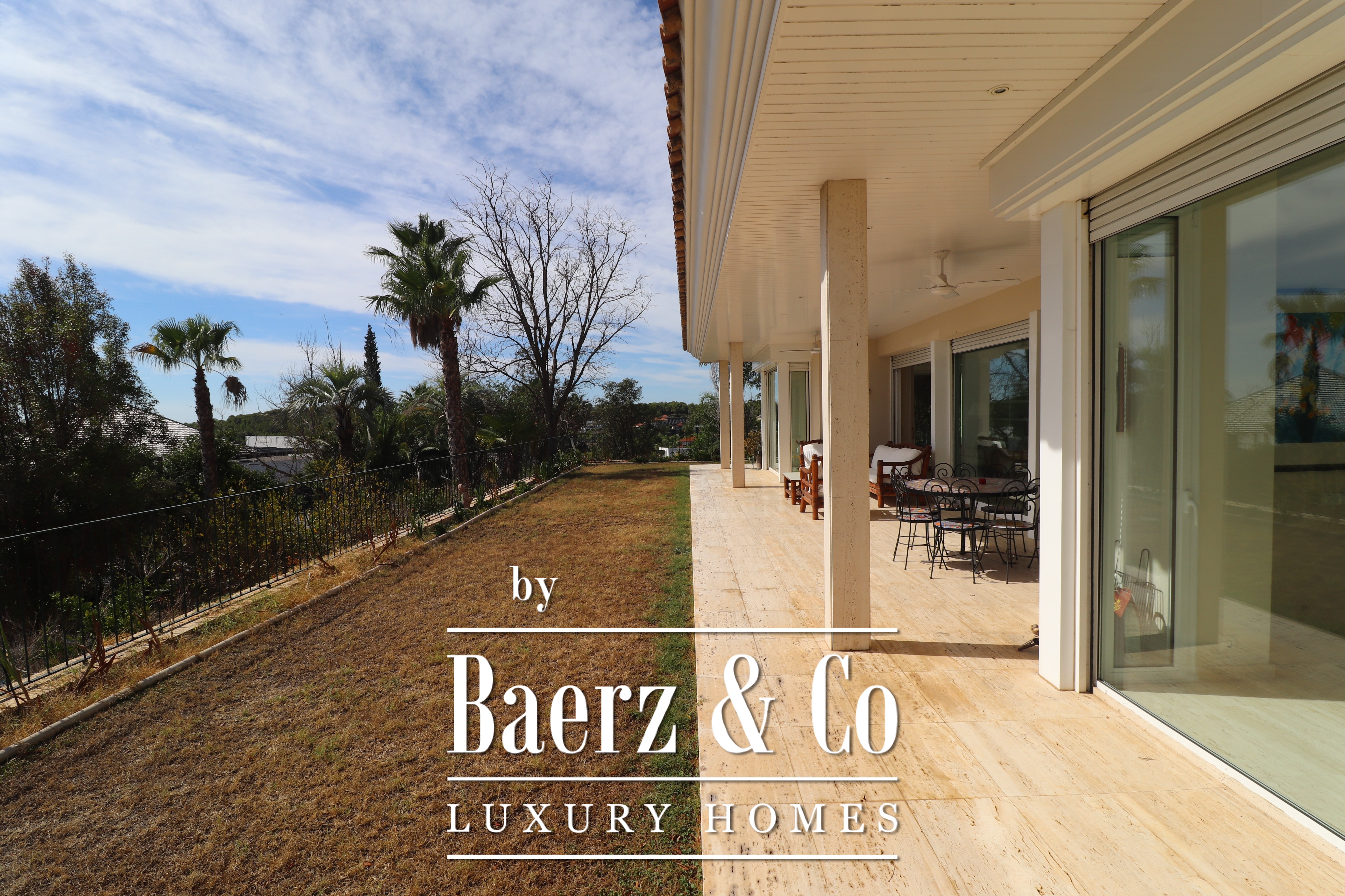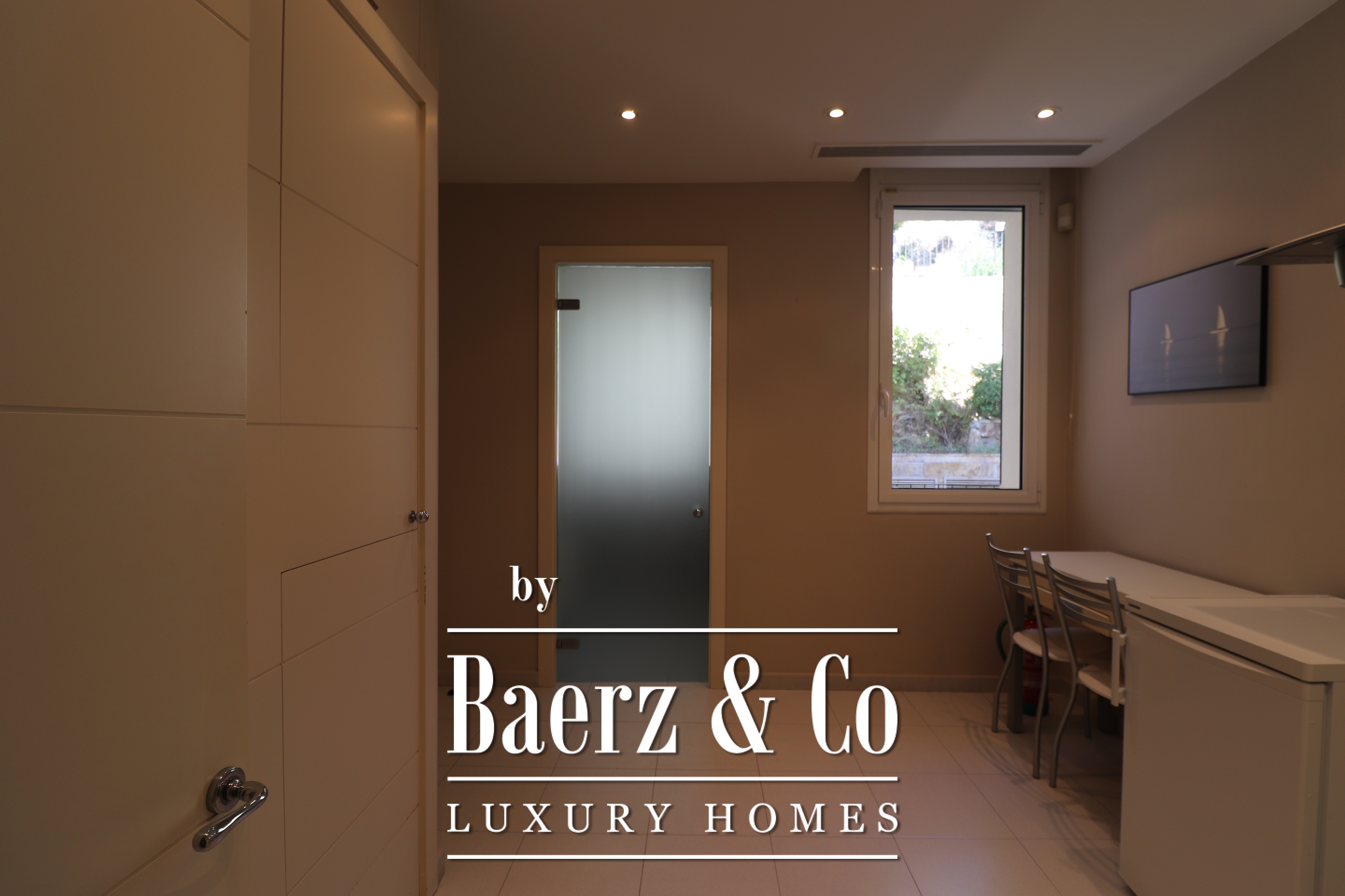 Ontworpen met oog voor discretie en comfort, spreidt de villa zich uit over drie verdiepingen, verbonden door een privé-lift. De hoofdverdieping begint met een stijlvolle entreehal en vloeit over in een open leefruimte met een salon en eetkamer, een mediaruimte, en een volledig uitgeruste keuken met aangrenzende bijkeuken en een dedicated kantoor. Vijf slaapkamers en acht badkamers bieden ruimte aan gezinsleven én grootschalig ontvangen.