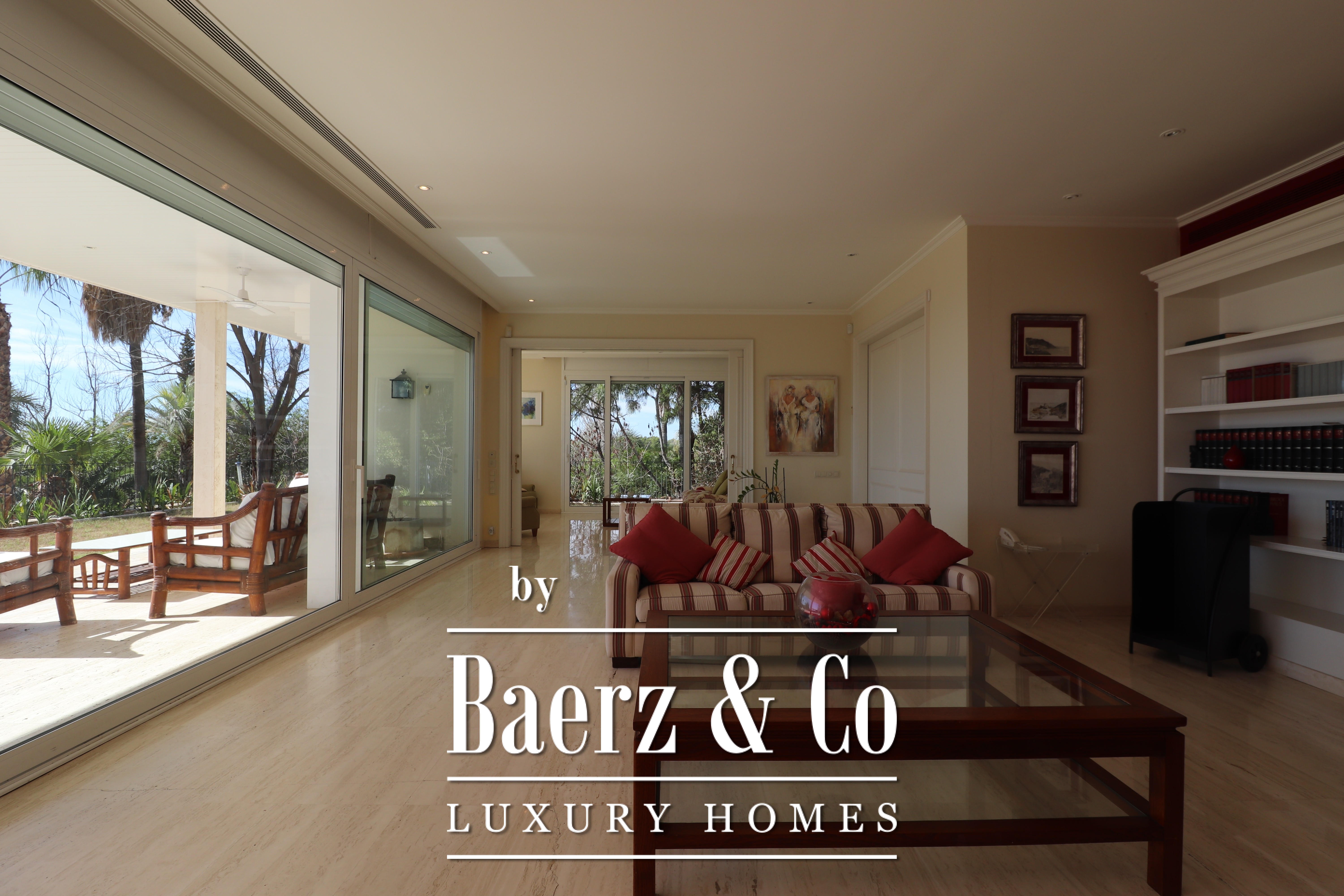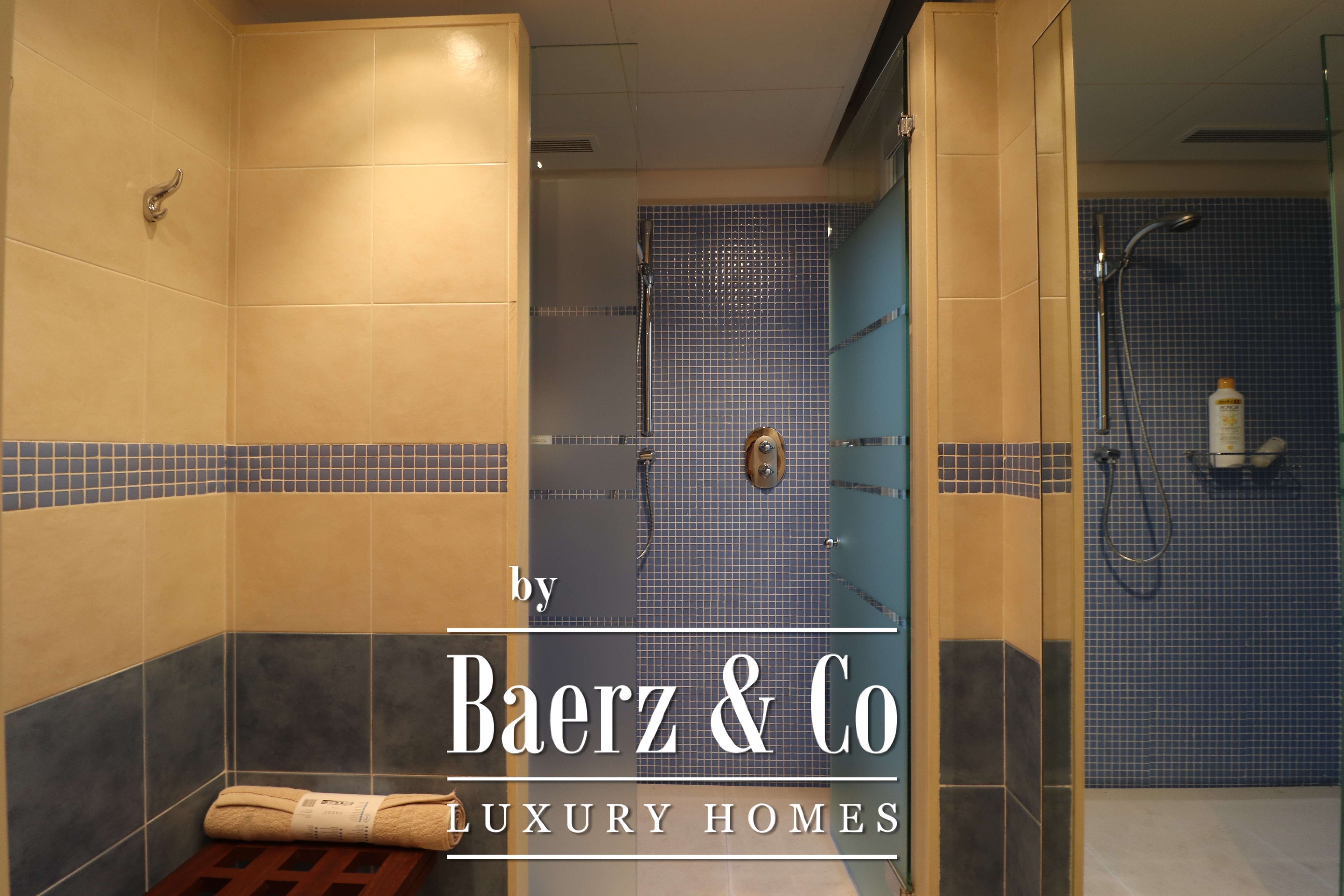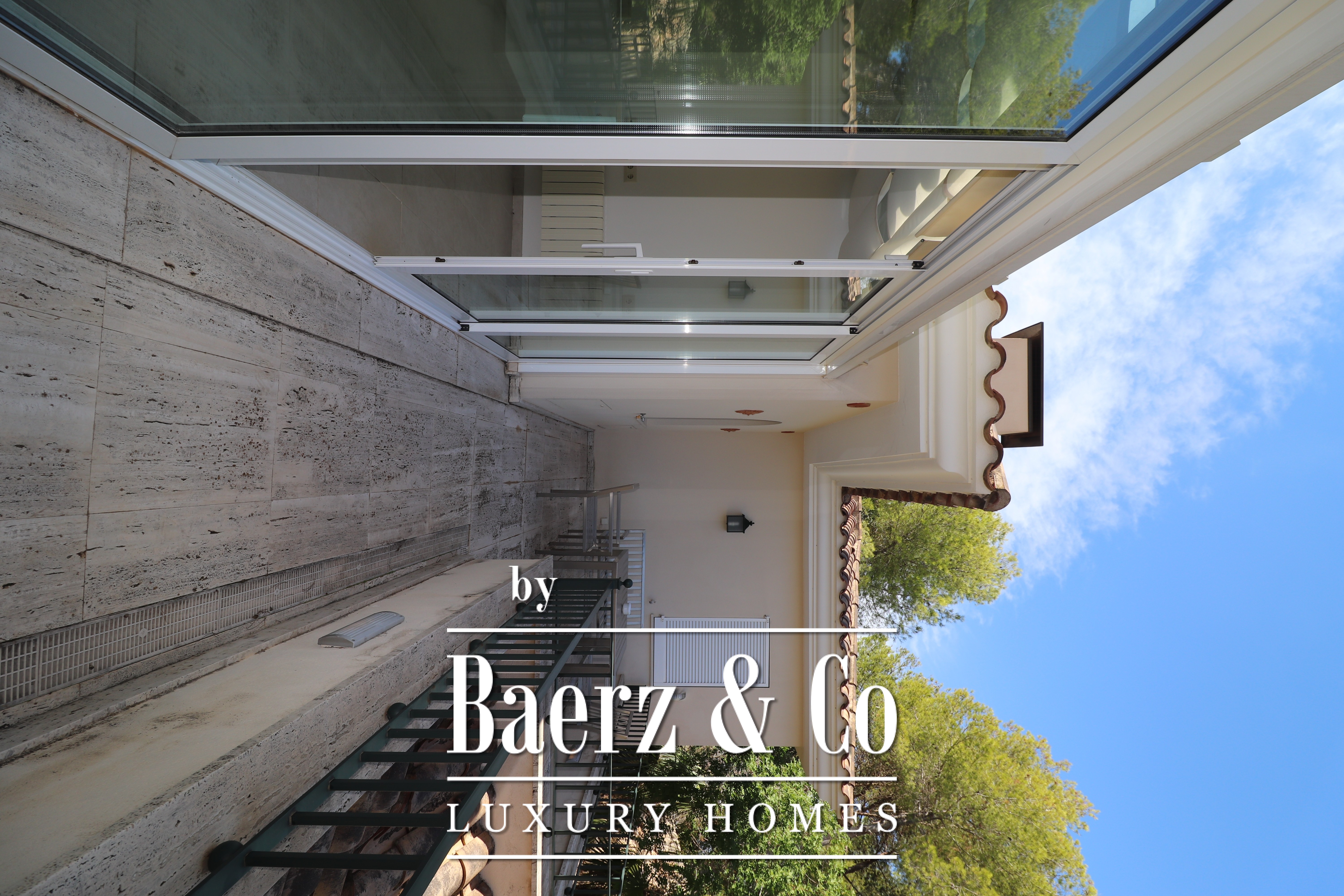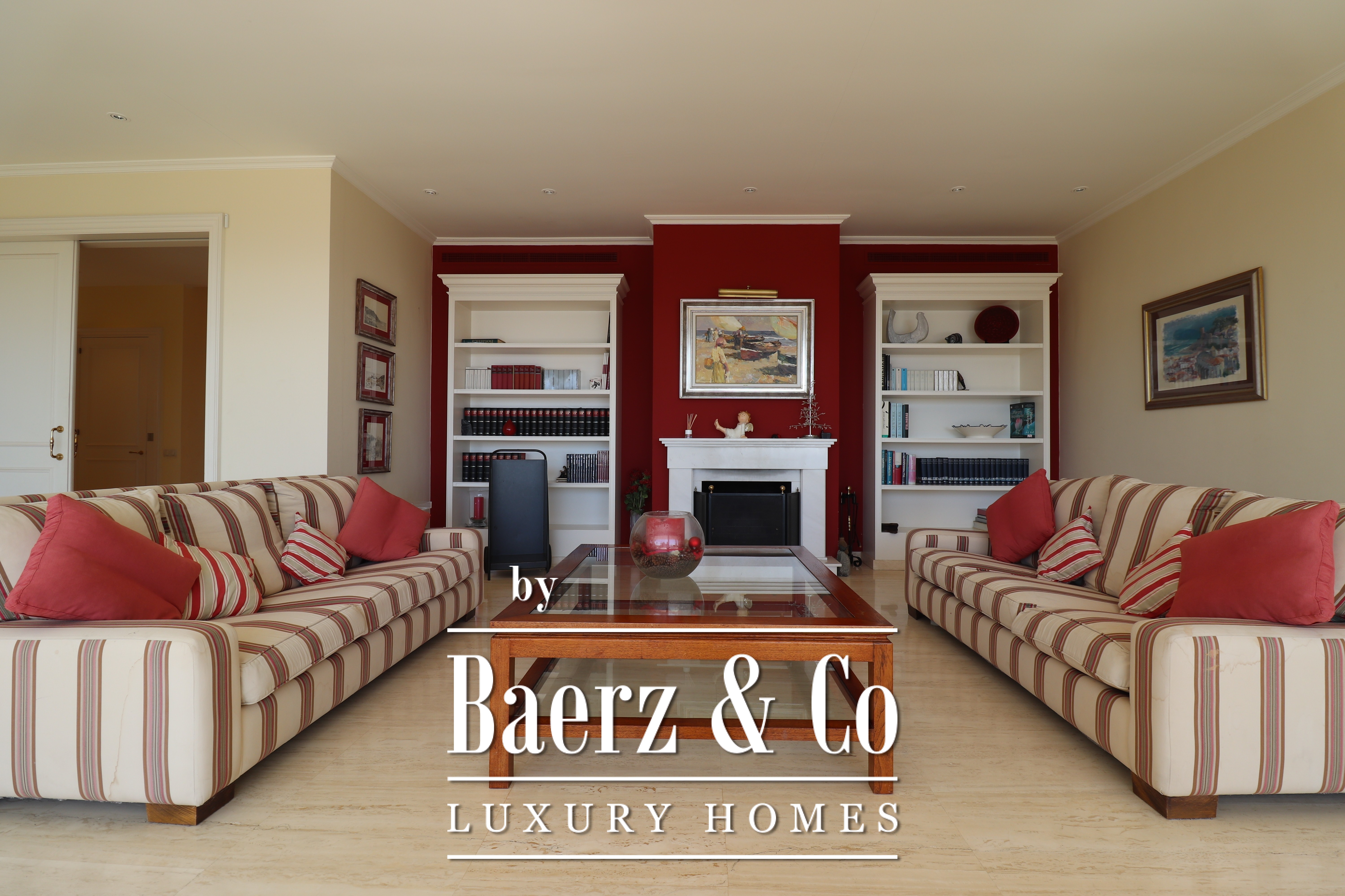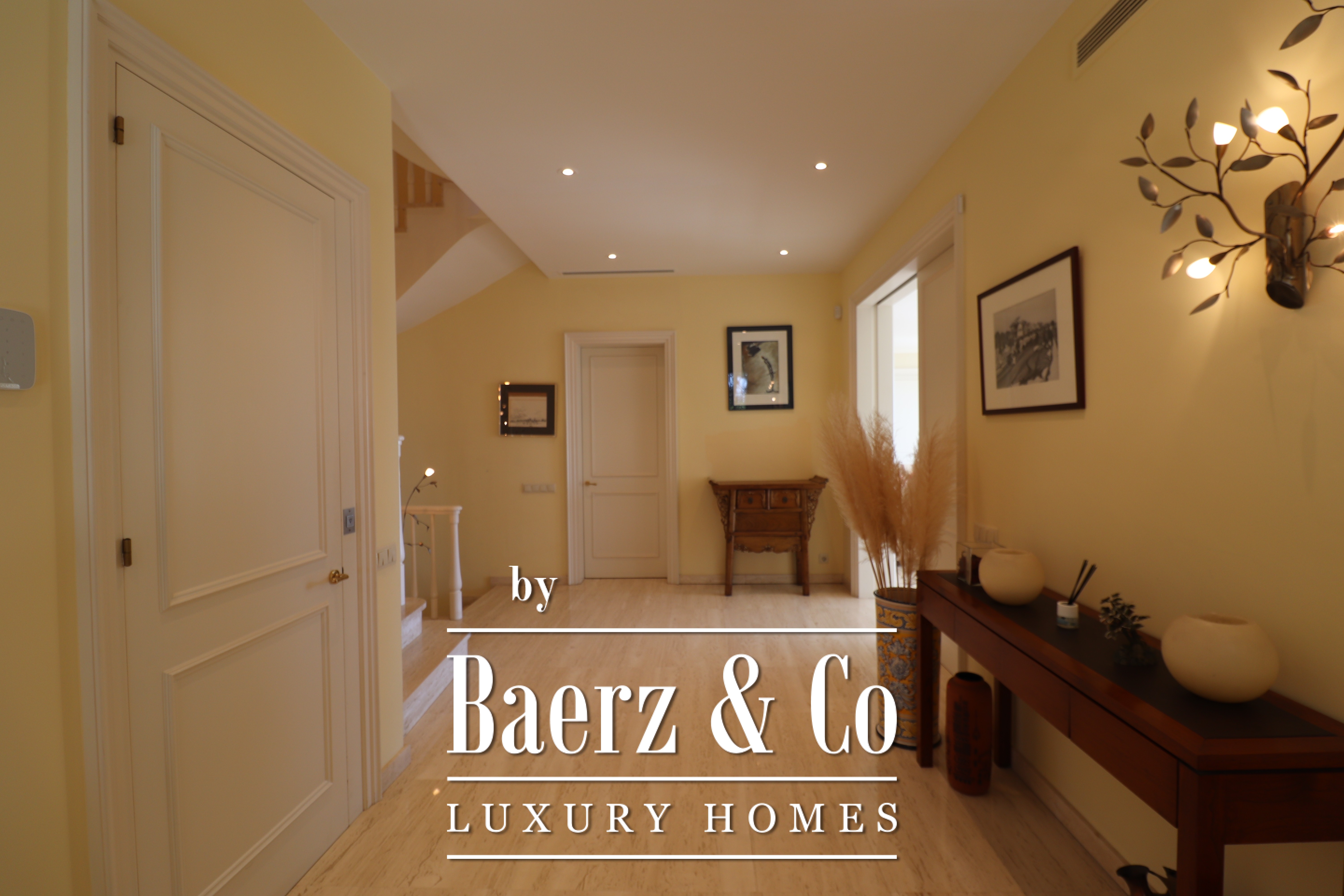 Ontworpen met oog voor discretie en comfort, spreidt de villa zich uit over drie verdiepingen, verbonden door een privé-lift. De hoofdverdieping begint met een stijlvolle entreehal en vloeit over in een open leefruimte met een salon en eetkamer, een mediaruimte, en een volledig uitgeruste keuken met aangrenzende bijkeuken en een dedicated kantoor. Vijf slaapkamers en acht badkamers bieden ruimte aan gezinsleven én grootschalig ontvangen.