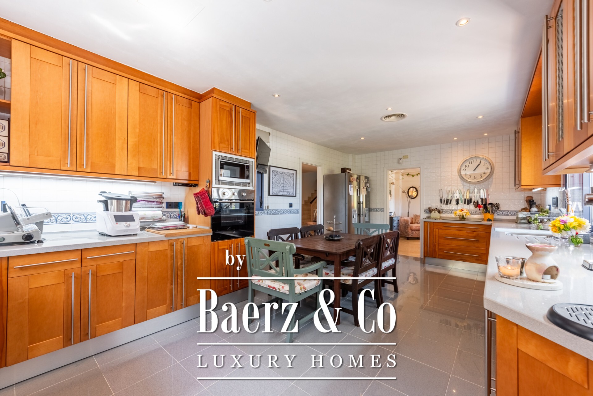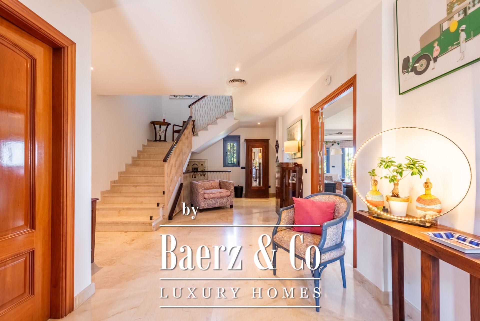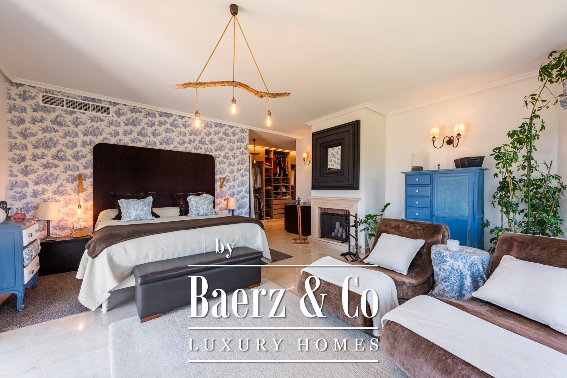 De villa beschikt over zes slaapkamers en vijf badkamers verdeeld over drie verdiepingen, inclusief een aparte mastersuite met inloopgarderobe en en-suite badkamer, naast een afzonderlijk gastengedeelte. De begane grond verbindt een volledig ingerichte keuken, een eetkamer voor samenkomsten en een woonkamer met open haard, elk met toegang tot zowel overdekte als zonnige terrassen voor een naadloze overgang tussen binnen en buiten. Centrale verwarming middels radiatoren en airconditioning zorgen voor comfort in elk seizoen.