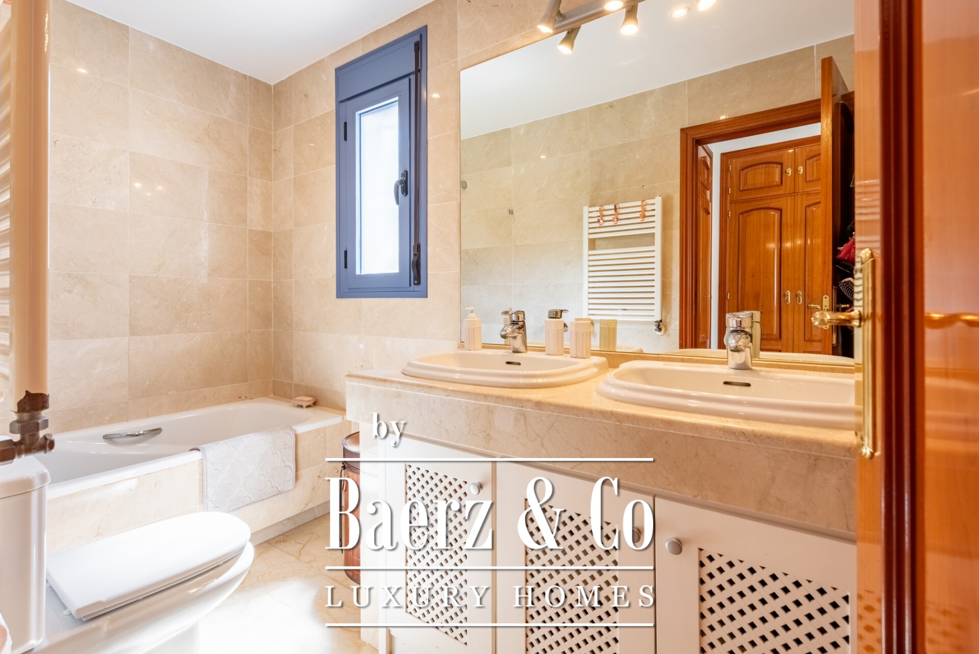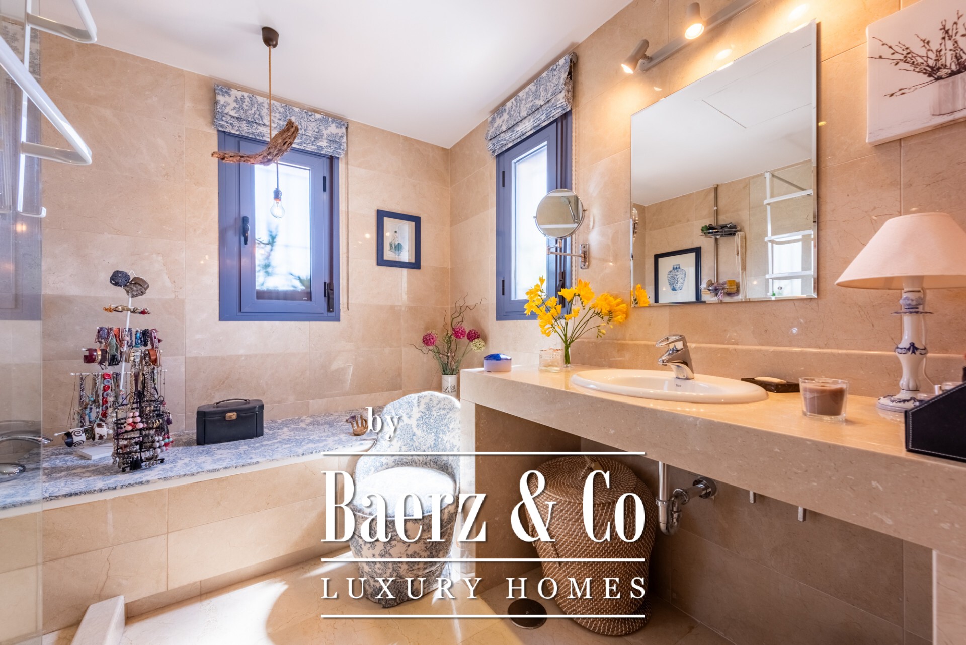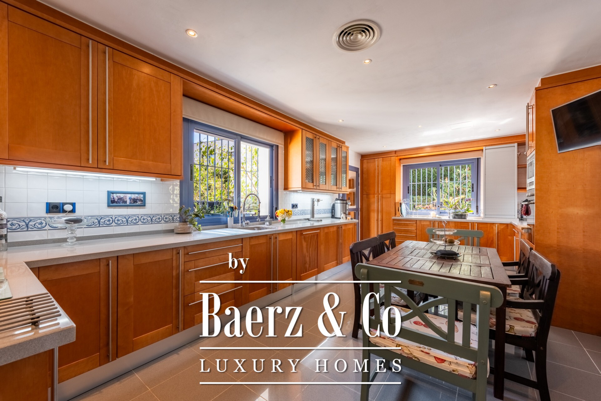 De villa beschikt over zes slaapkamers en vijf badkamers verdeeld over drie verdiepingen, inclusief een aparte mastersuite met inloopgarderobe en en-suite badkamer, naast een afzonderlijk gastengedeelte. De begane grond verbindt een volledig ingerichte keuken, een eetkamer voor samenkomsten en een woonkamer met open haard, elk met toegang tot zowel overdekte als zonnige terrassen voor een naadloze overgang tussen binnen en buiten. Centrale verwarming middels radiatoren en airconditioning zorgen voor comfort in elk seizoen.
