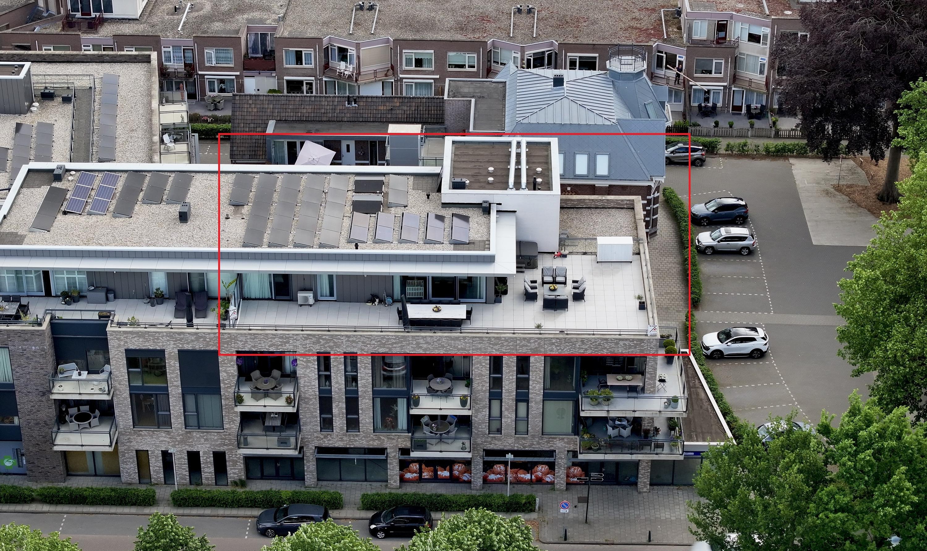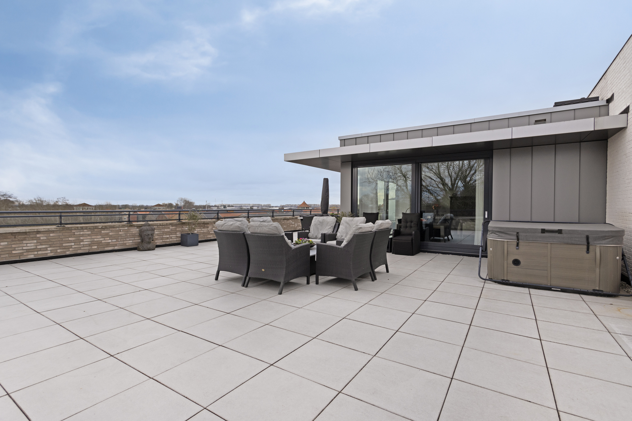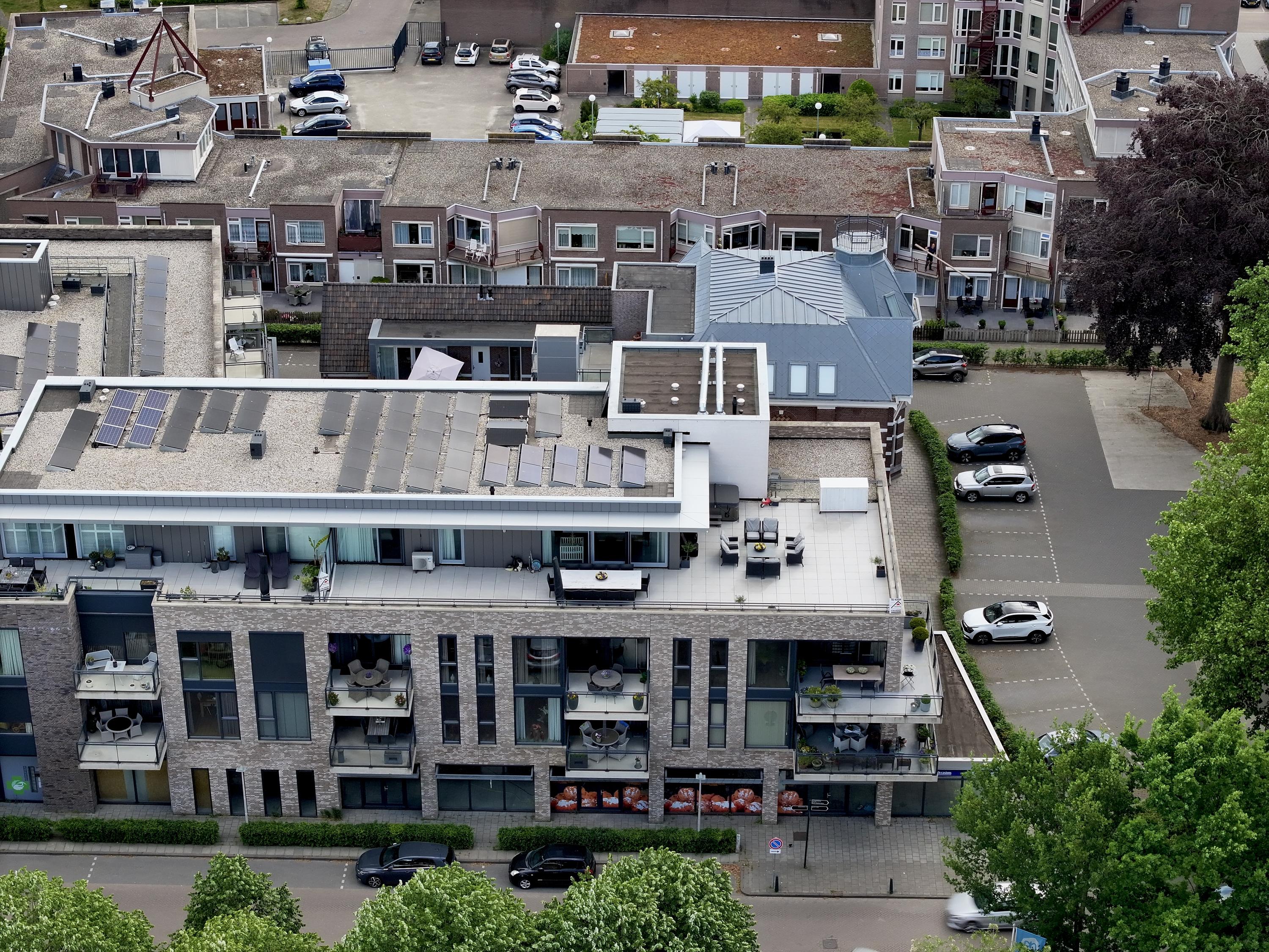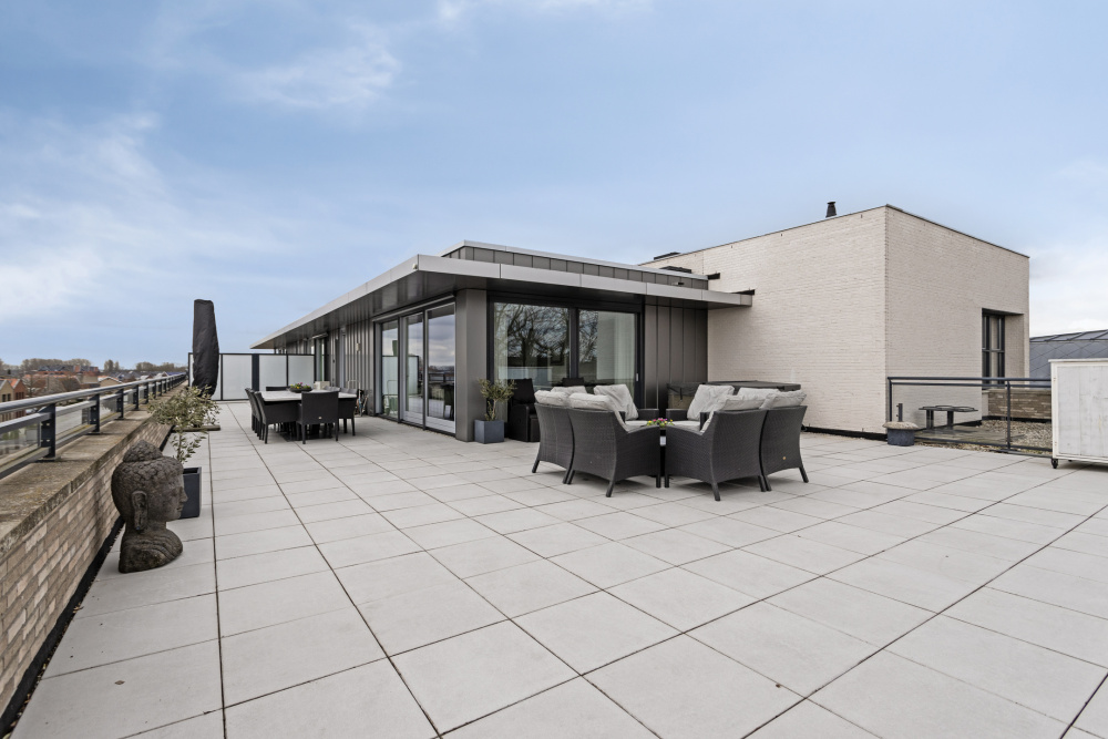 royaal dakterras van ca. 165 m², in basis gesitueerd op het zonnige westen en voorzien van diverse zon- en schaduwhoeken, keramische 60x60 tegels, een meer persoons jacuzzi met bovendek (ter overname), elektrapunten en een buitenkraan.