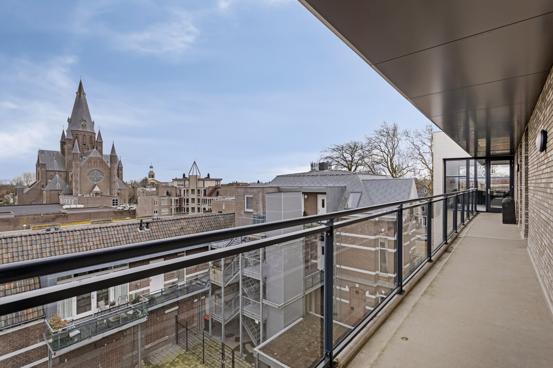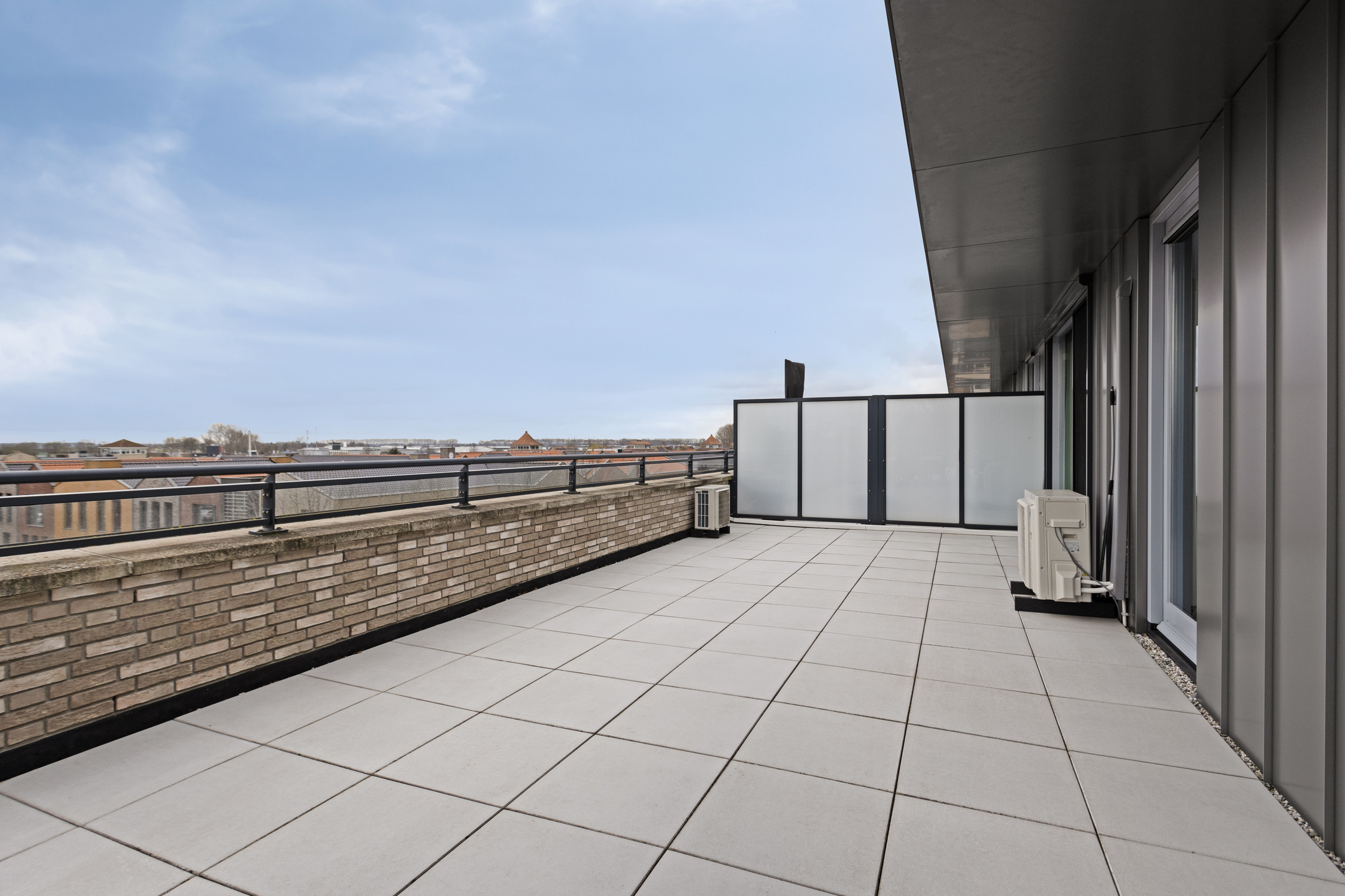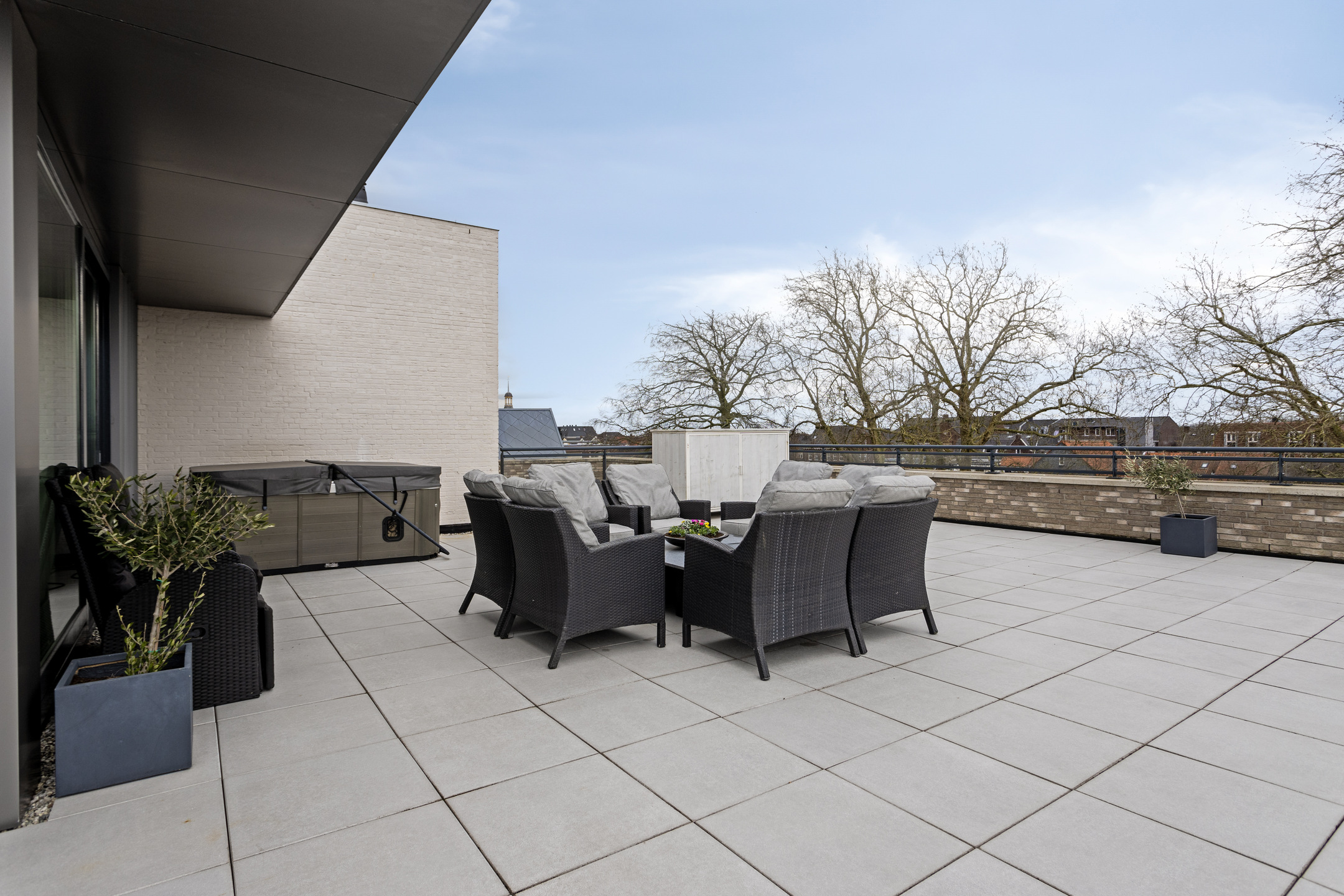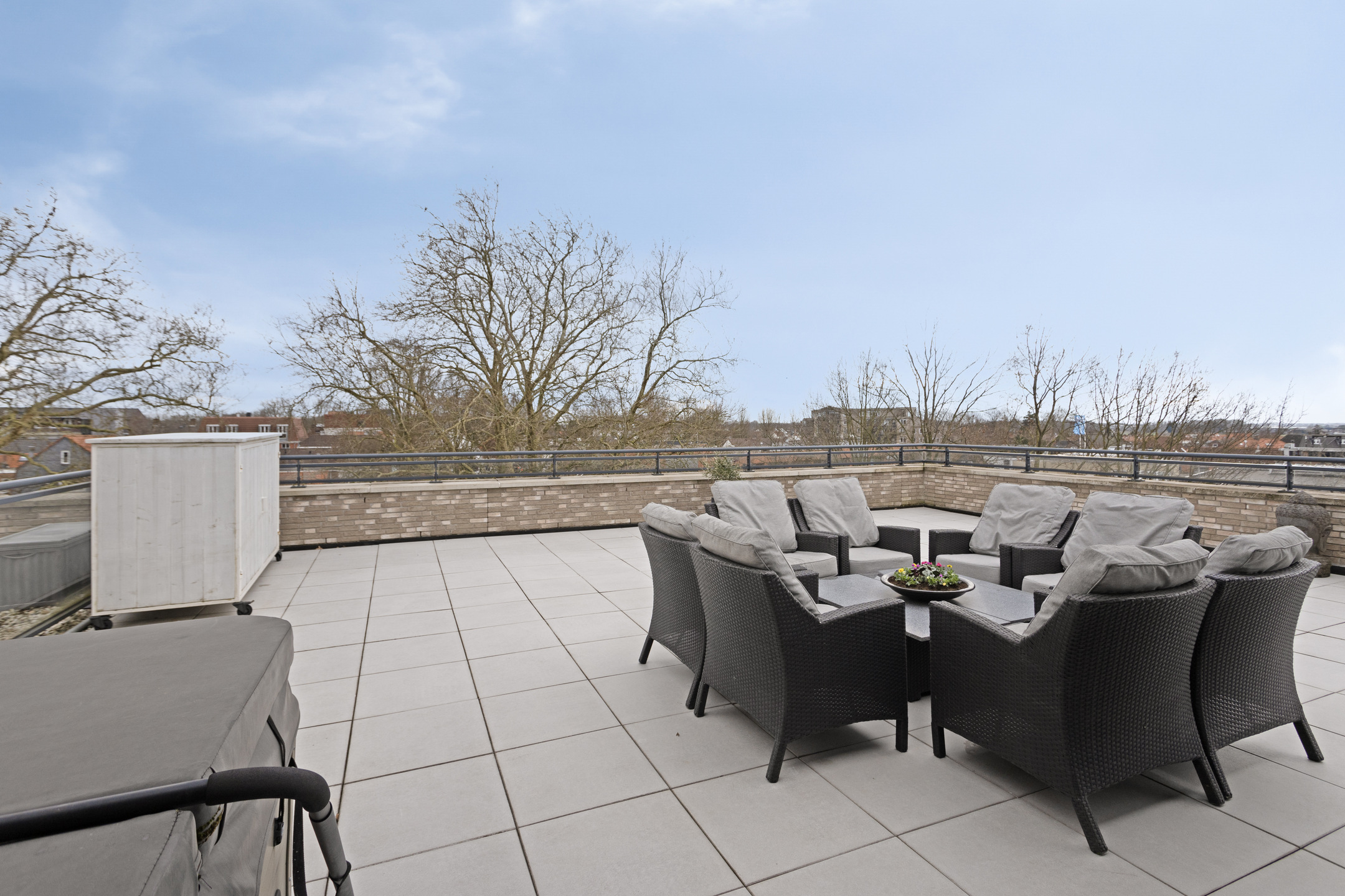 royaal dakterras van ca. 165 m², in basis gesitueerd op het zonnige westen en voorzien van diverse zon- en schaduwhoeken, keramische 60x60 tegels, een meer persoons jacuzzi met bovendek (ter overname), elektrapunten en een buitenkraan.