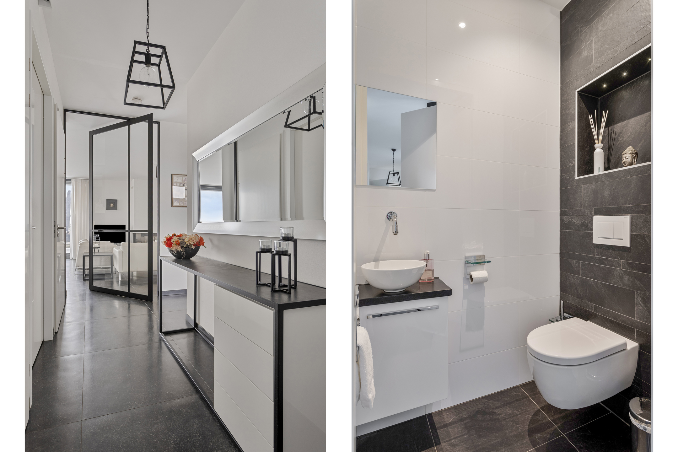 strak betegeld toilet met een wandcloset en fonteintje;