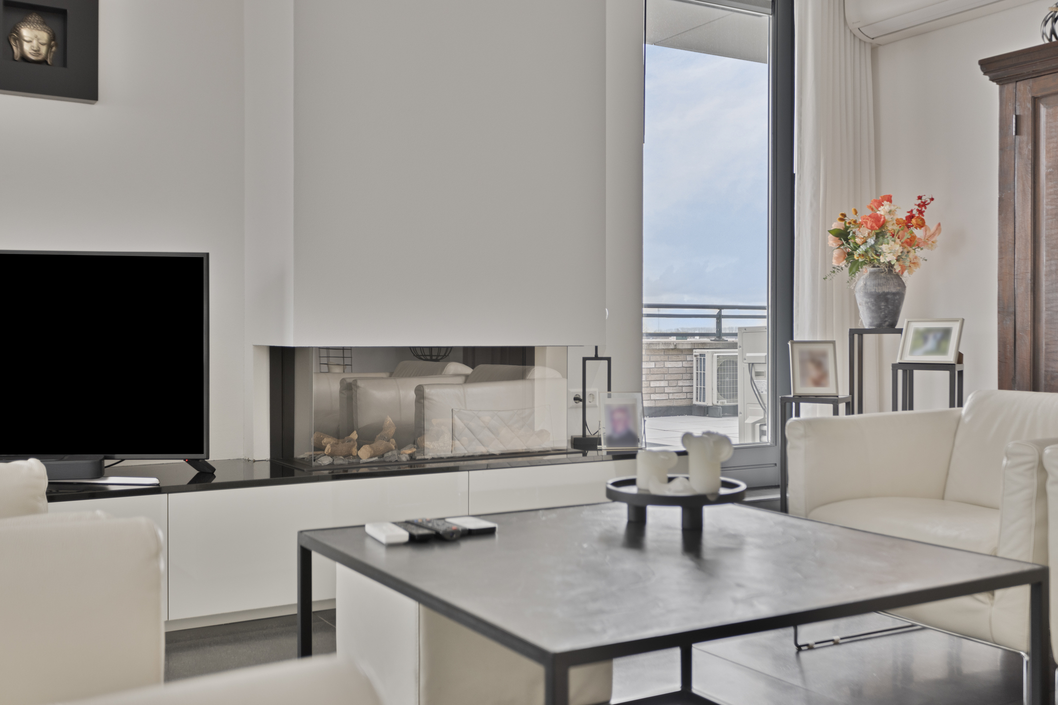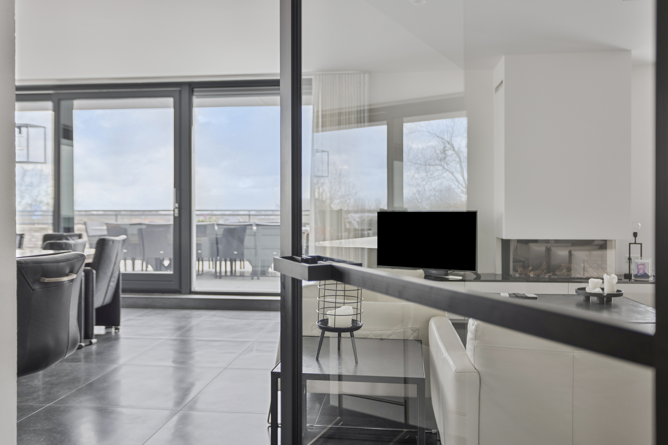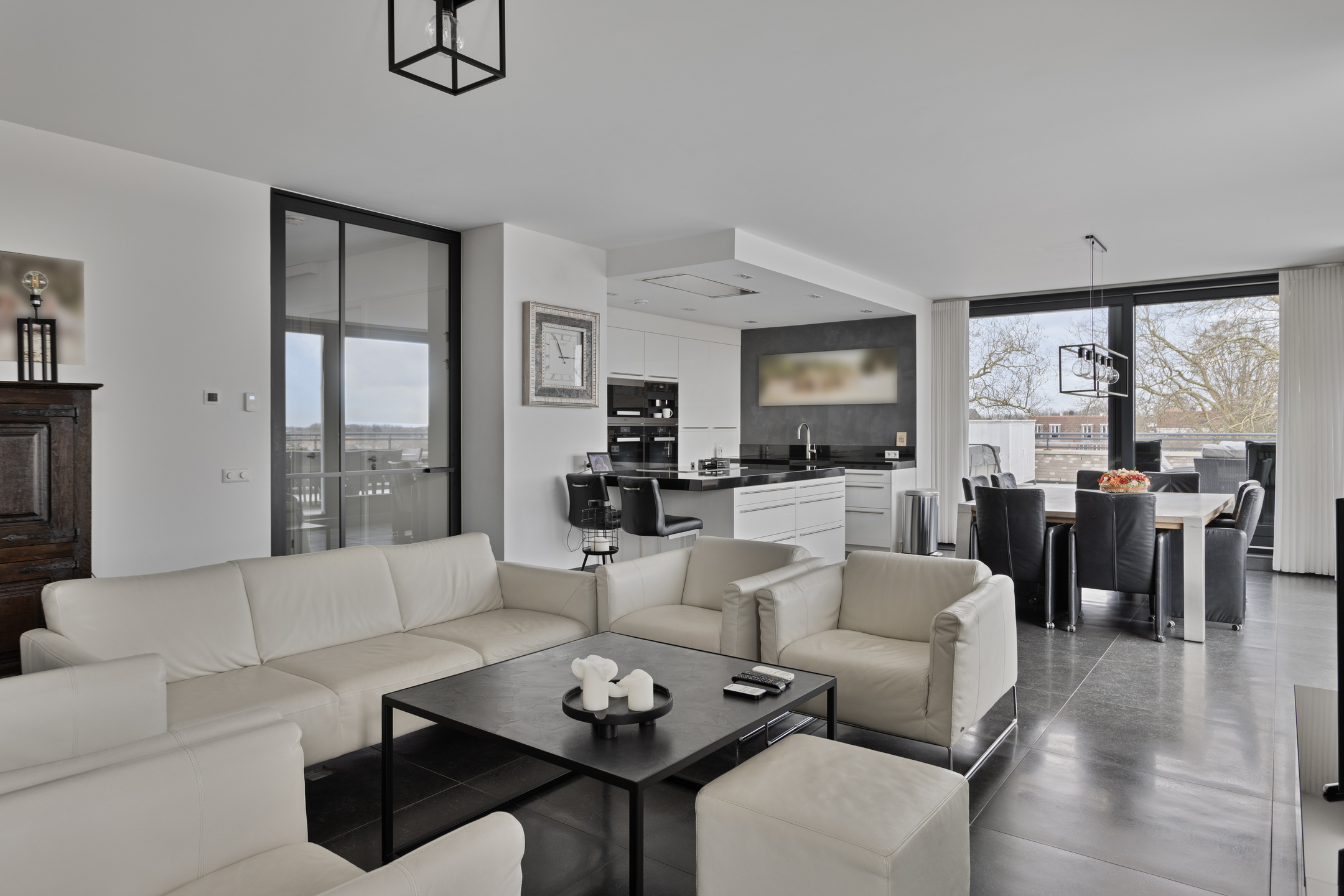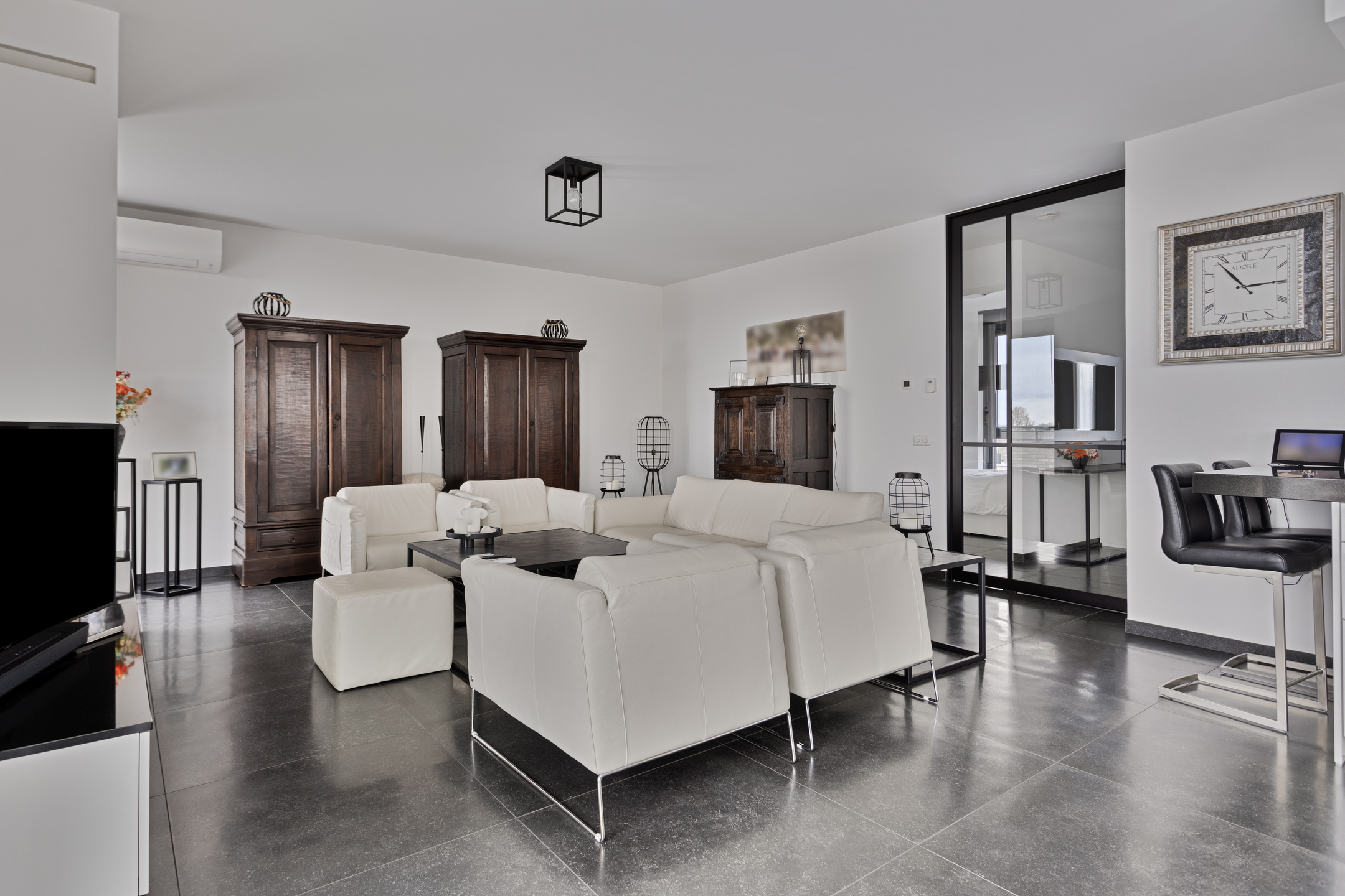 licht uitgevoerde living (ca. 58 m² incl. keuken) voorzien van een gashaard vv. dakdoorvoer, airconditioning, 2-tal schuifpuien en stroompunt in de vloer ter plaatse van het zitgedeelte, wandafwerking vlak stucwerk, 80x80 tegelvloer, plafond afgewerkt met vlak stucwerk;