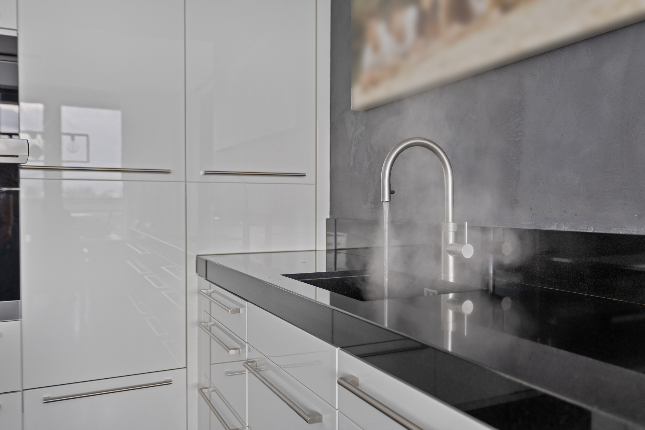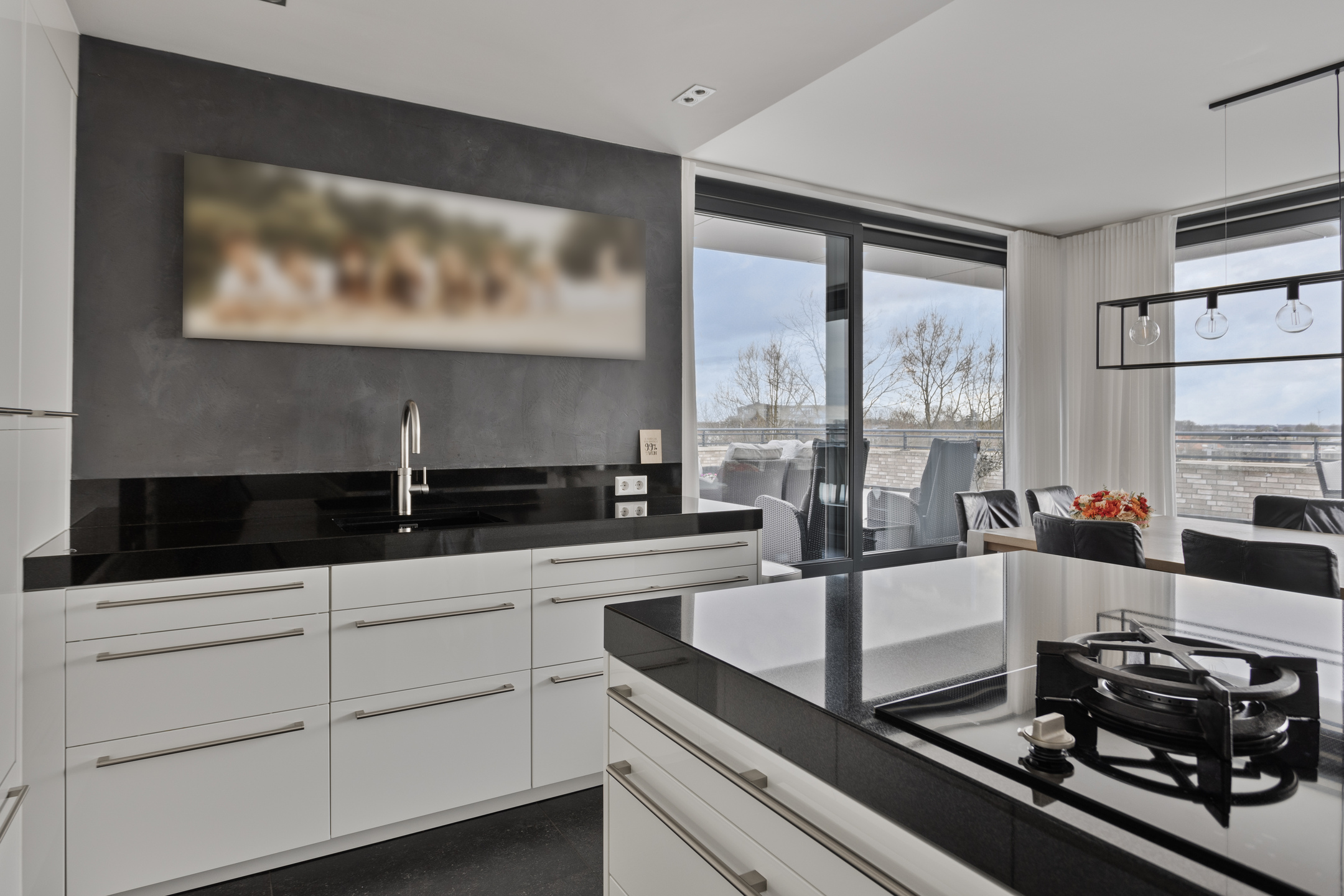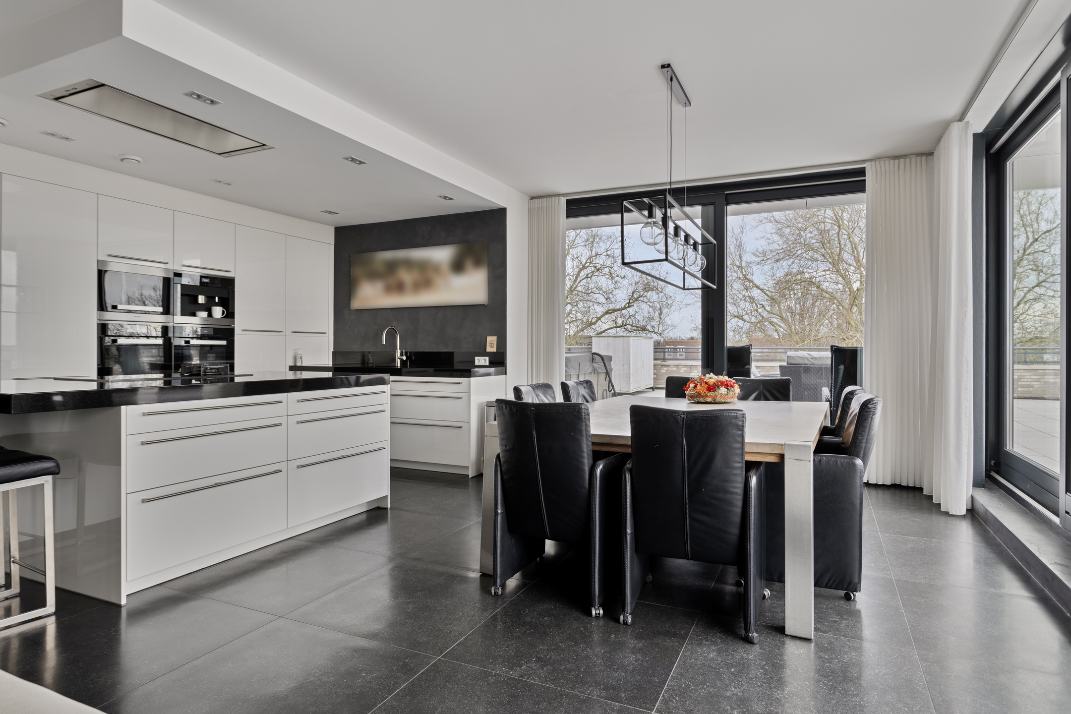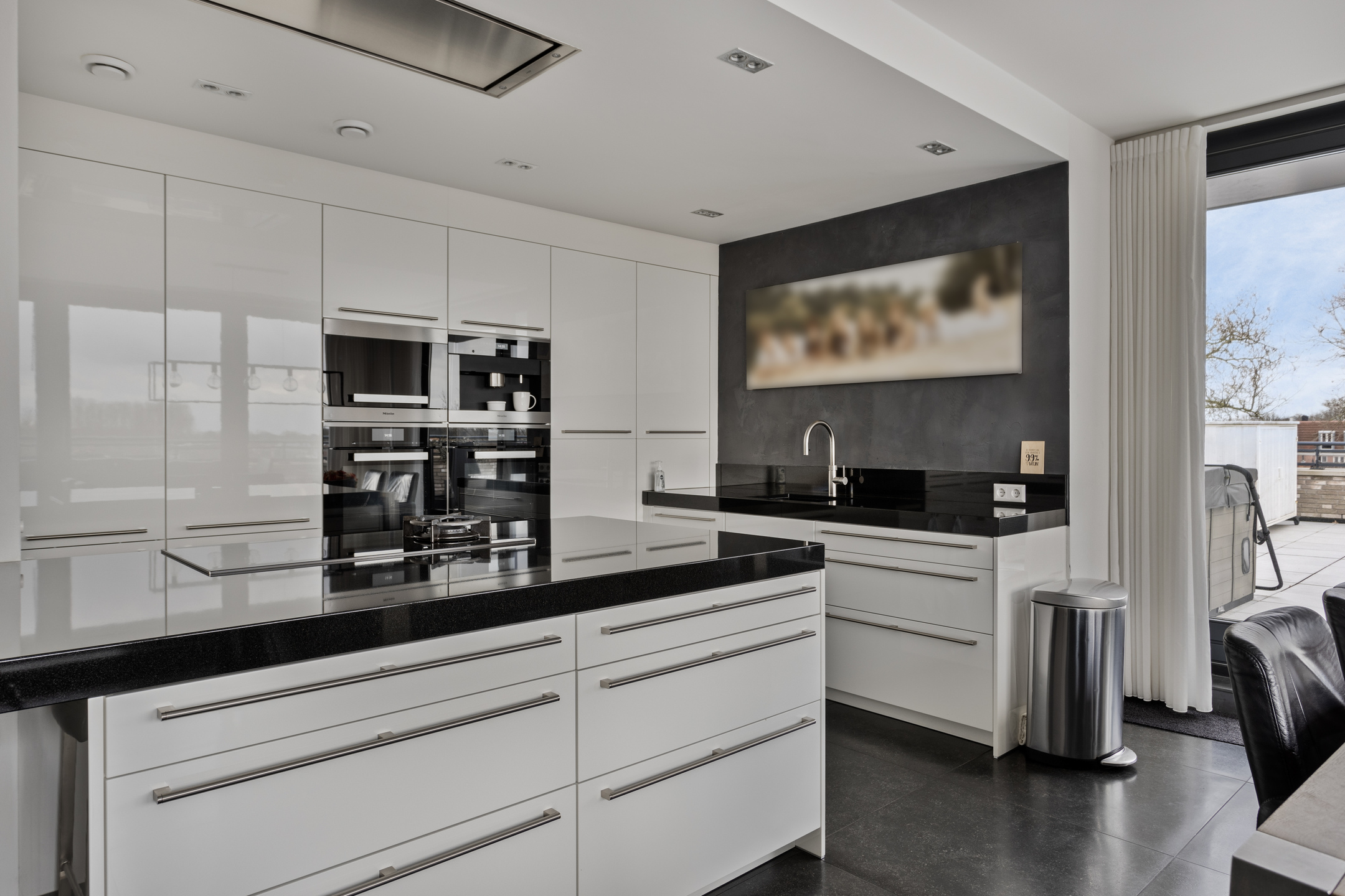 Het object beschikt over een fijne living met veel lichtinval en een directe toegang tot het dakterras. De keuken is direct bij de woonkamer betrokken en betreft een hoogwaardige Poggenpohl keuken met bijhorende luxe apparatuur waaronder een hogedruk stoomoven, de verzinkte afzuigkap met directe afzuiging naar buiten, een Quooker en uiteraard een graniet werkblad.
