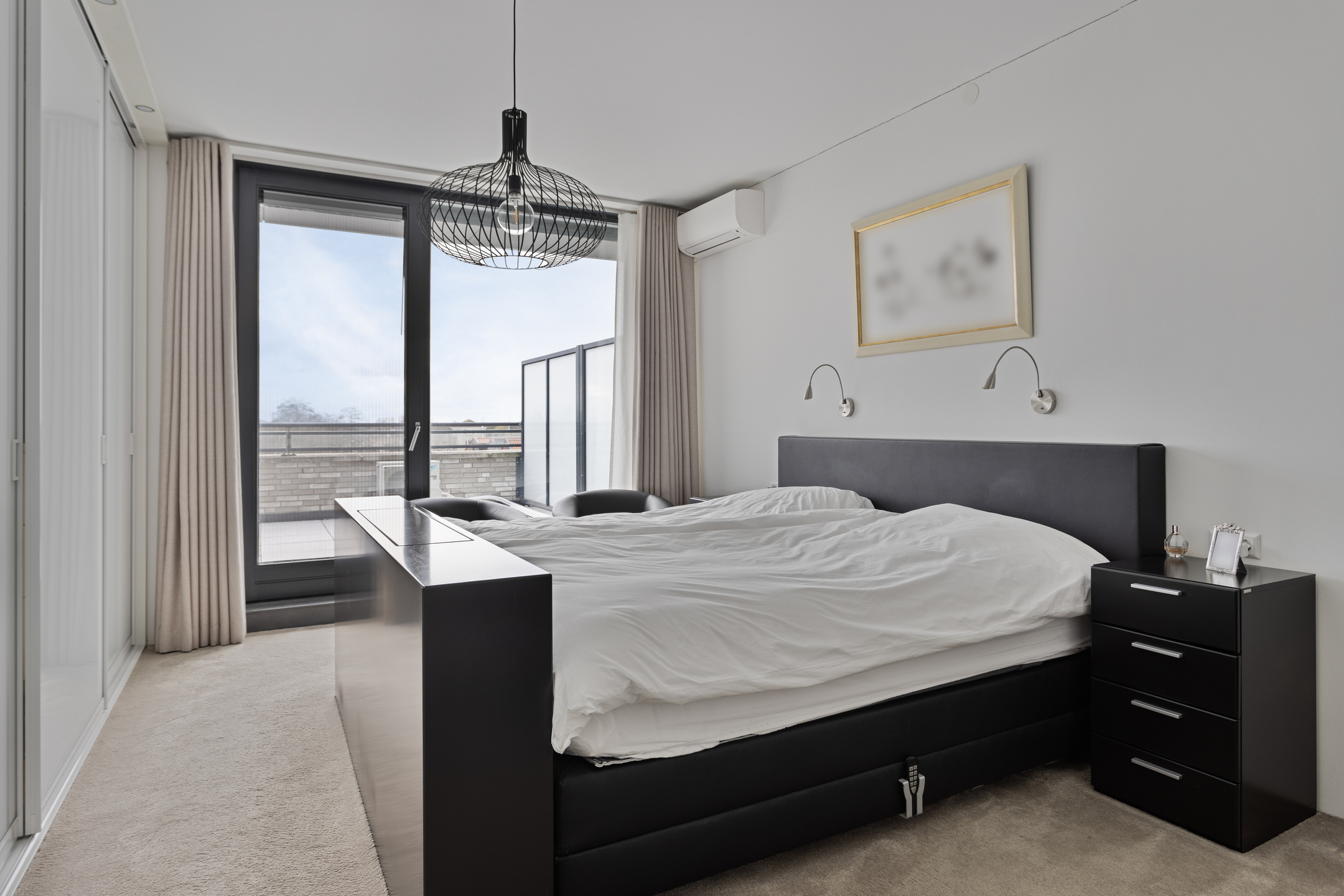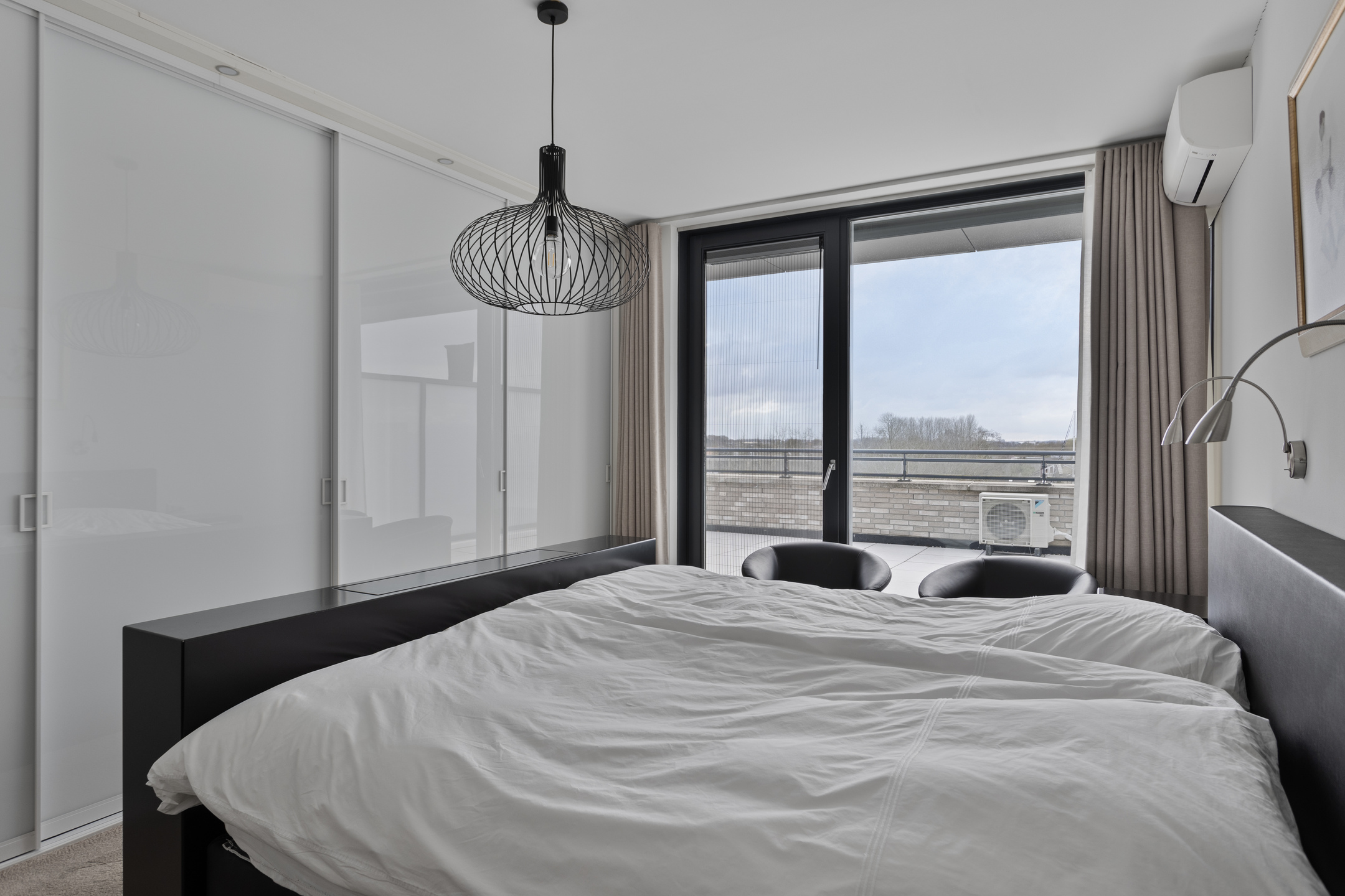 hoofdslaapkamer (ca. 22,5 m²) voorzien van een inbouwkastenwand en airconditioning, wandafwerking vlak stucwerk, vloer afgewerkt met tapijt, plafond afgewerkt met vlak stucwerk, loopdeur naar balkon;