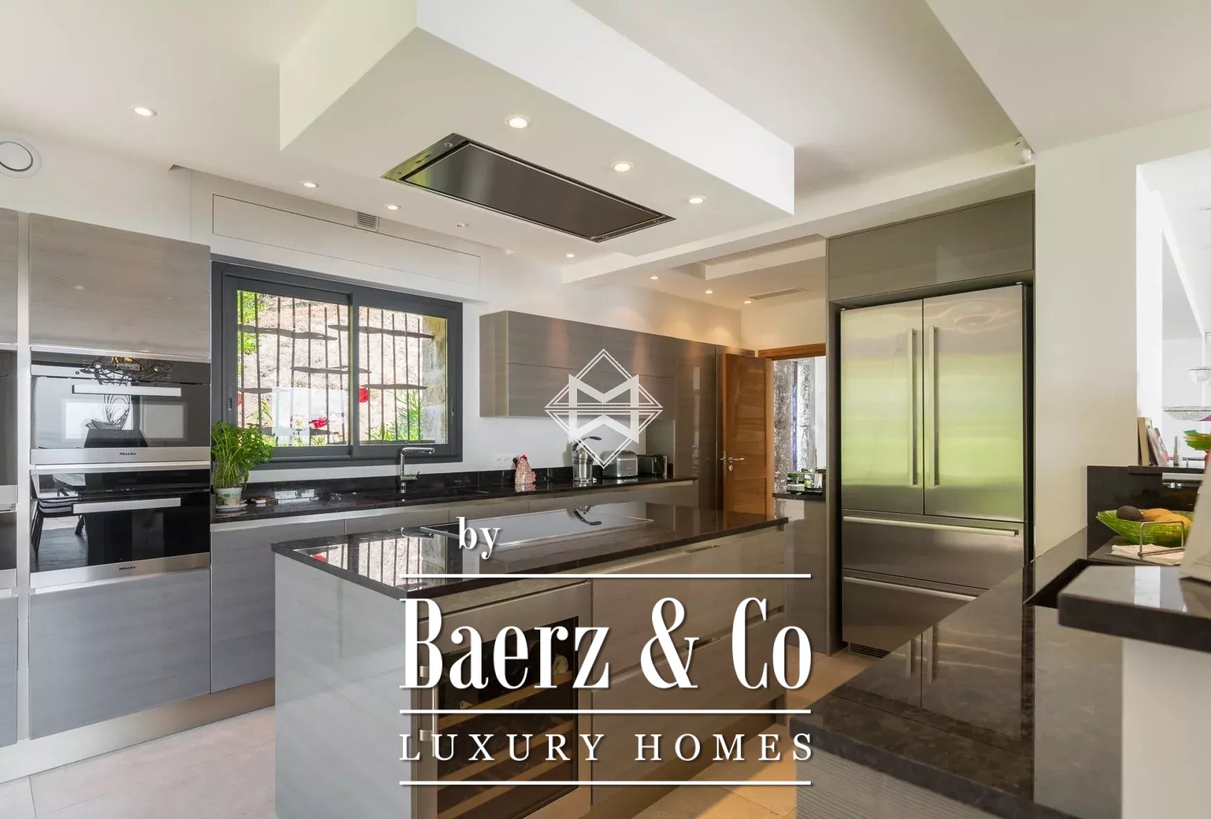 Vijf slaapkamers en vier badkamers zijn doordacht ingedeeld over uitnodigende leefruimtes, allemaal gepositioneerd om optimaal van het mediterrane licht te genieten. De terrassen vloeien naadloos over in een verwarmd overloopzwembad en jacuzzi, elk strategisch geplaatst om het uitzicht en de privacy maximaal te waarborgen.