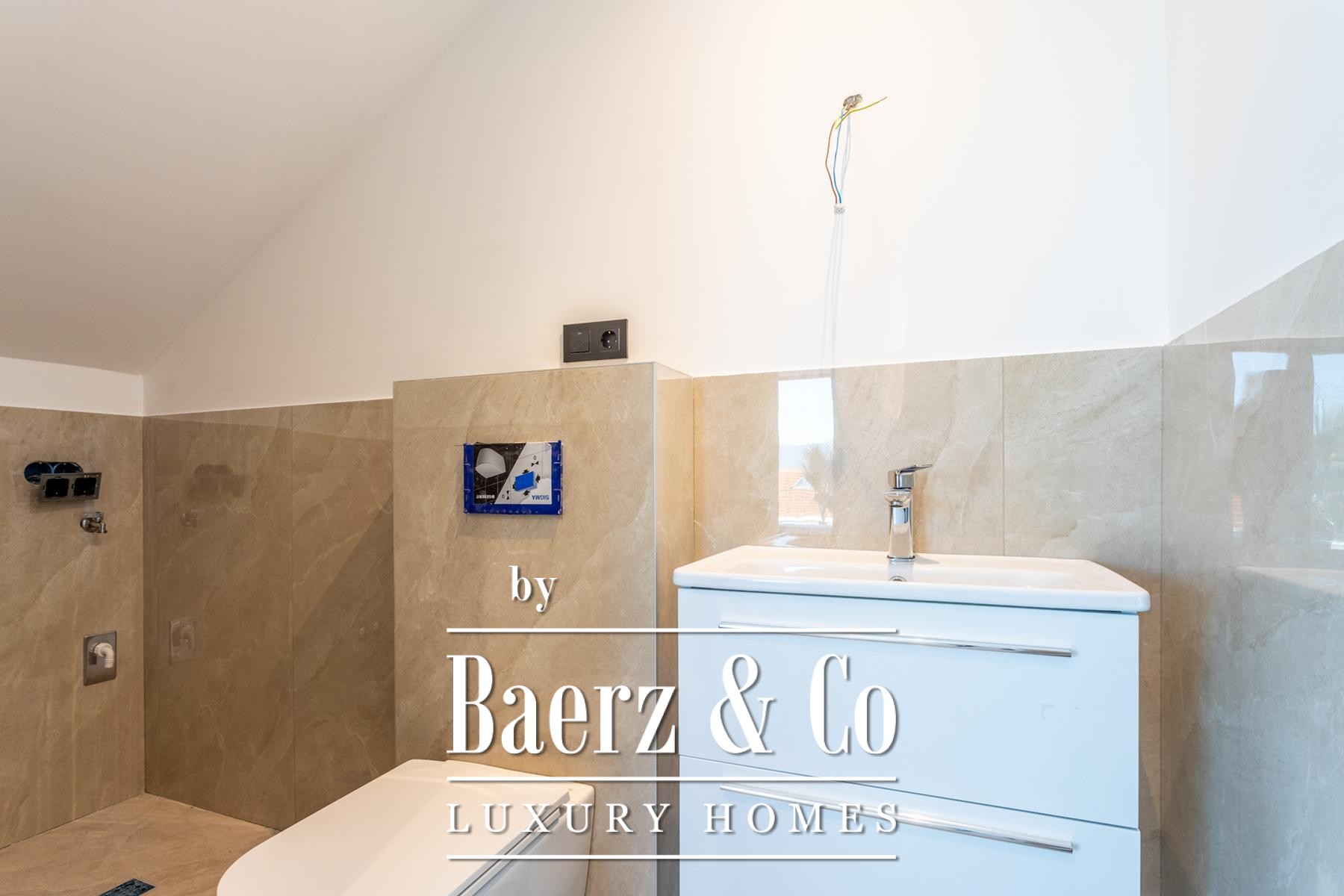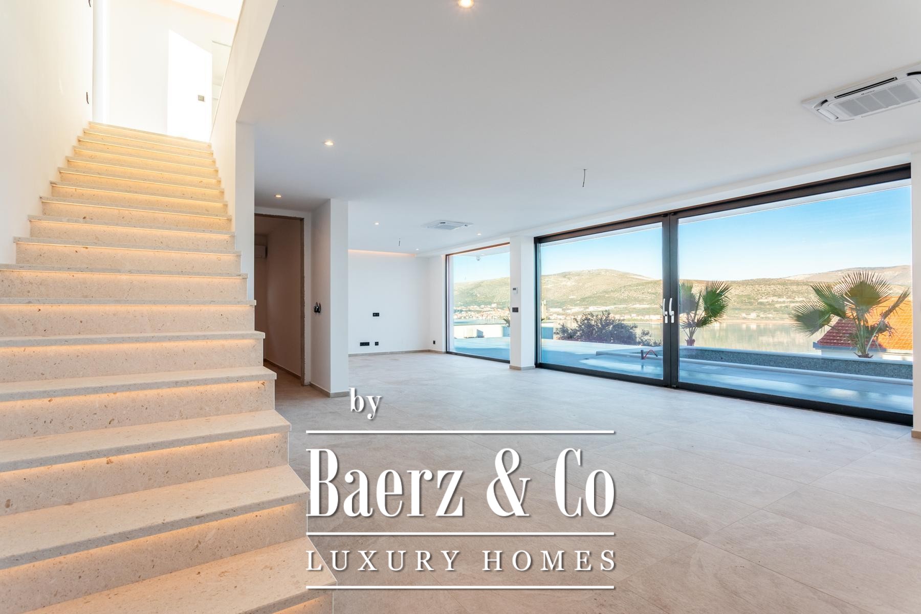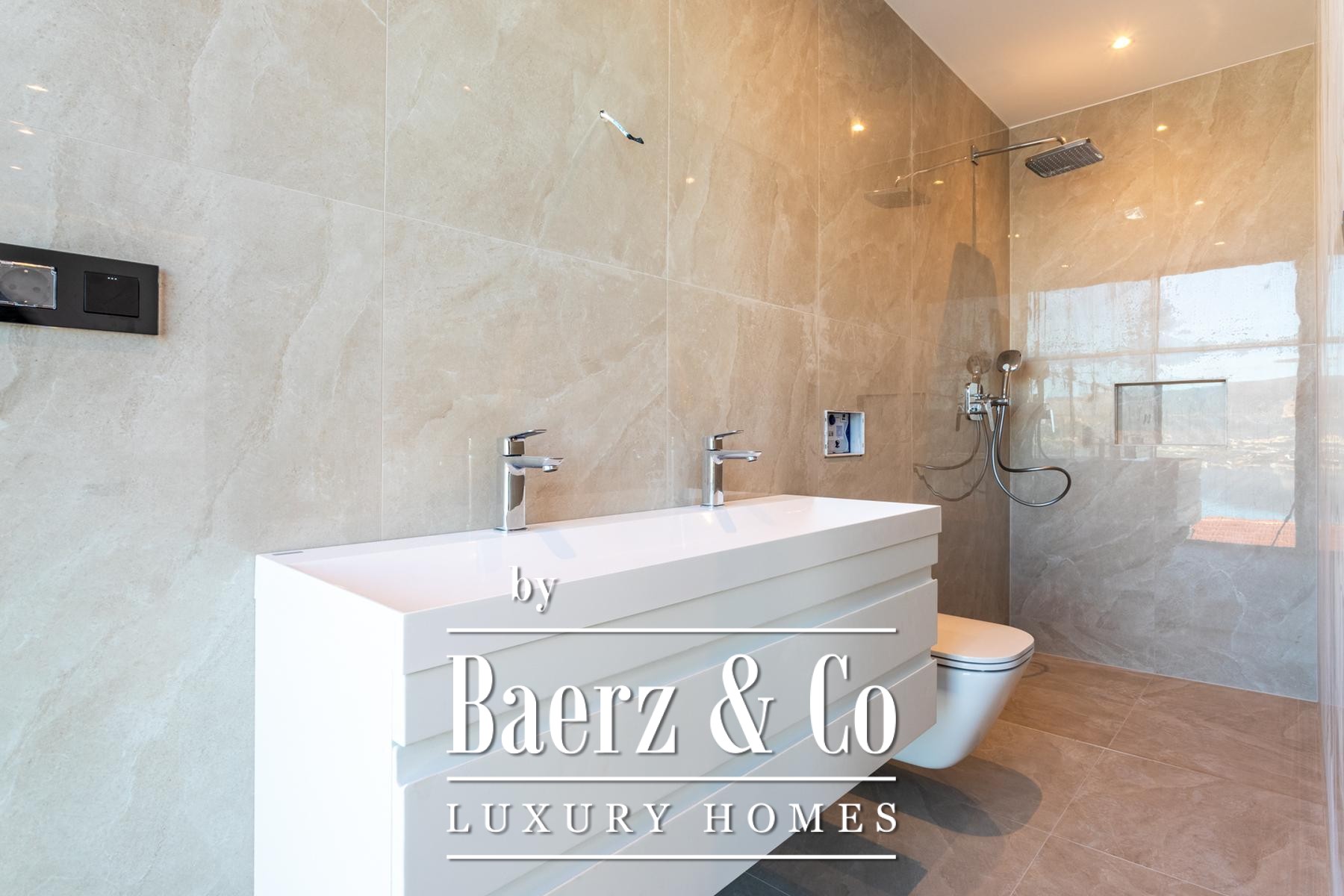Een gang, gastentoilet met wasfaciliteiten en een multifunctionele kamer—geschikt als kantoor, fitnessruimte of speelkamer—maken de doordachte indeling van het hoofdverdiep compleet. Op de eerste verdieping beschikken drie slaapkamers elk over een en-suite badkamer en volledige beglazing, waardoor er overal een panoramisch uitzicht op de Adriatische Zee is.
