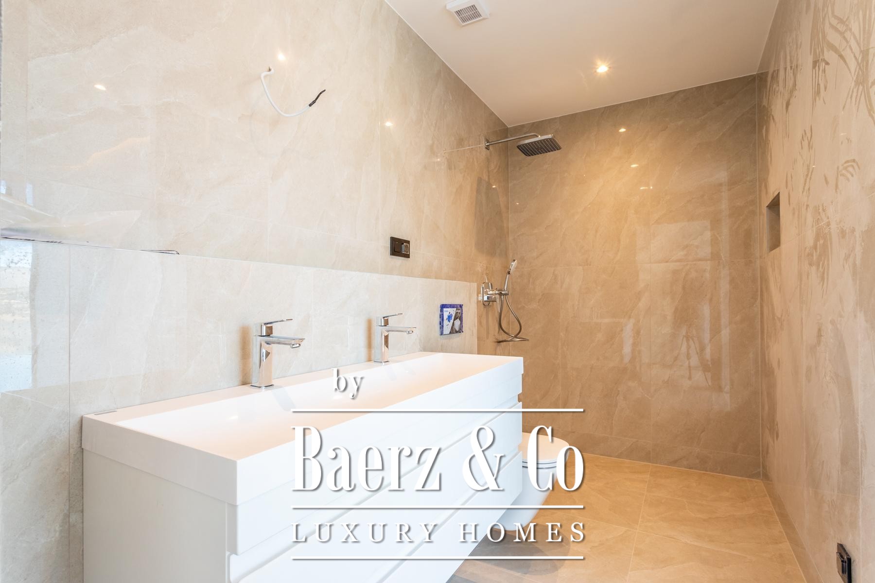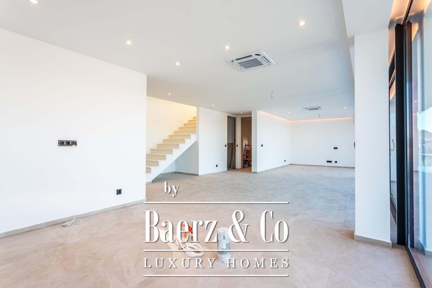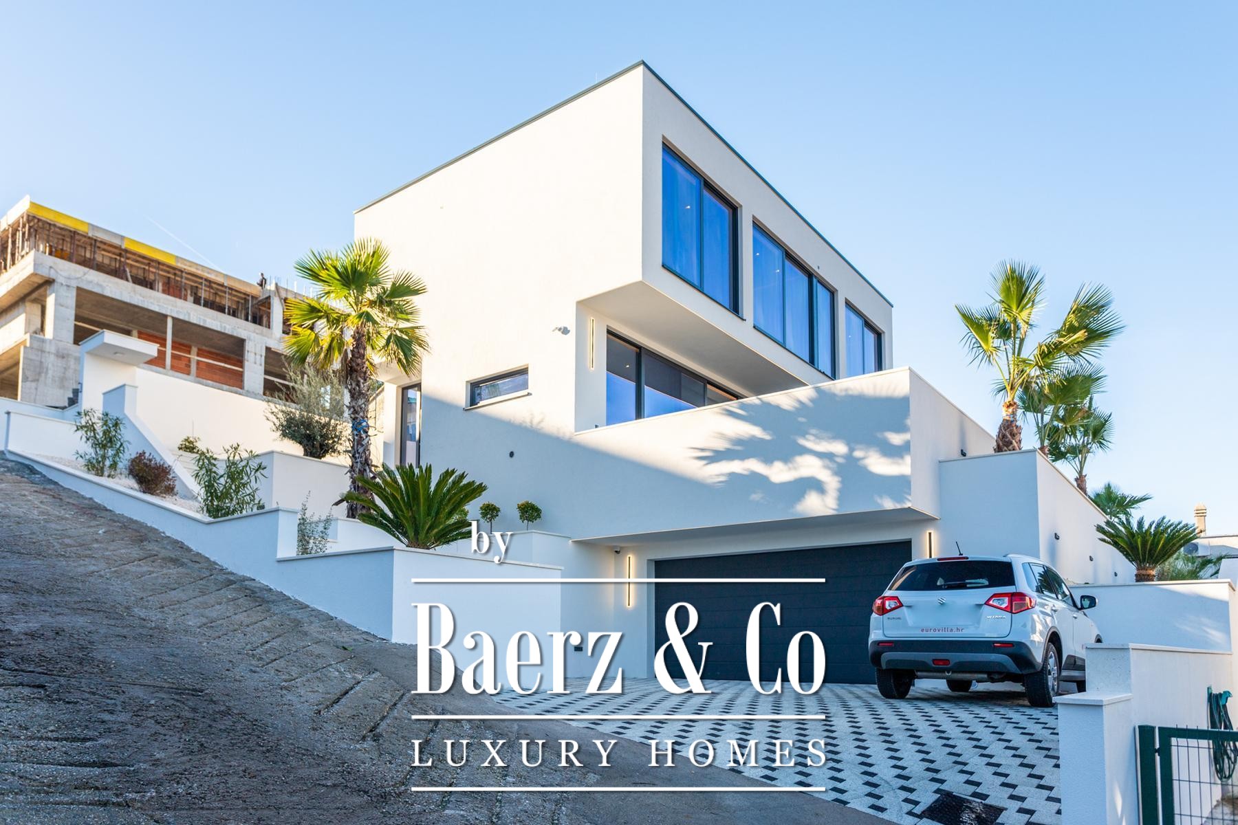 De villa verwelkomt u met een inpandige garage voor twee auto's, subtiel verbonden met een technische ruimte. De begane grond is ingericht als een open leefruimte, waar keuken, eetgedeelte en woonkamer samensmelten met vloerhoge glazen gevels. Natuurlijk licht vult elke hoek en er is een naadloze overgang naar een aangelegd terras en verwarmd zwembad.