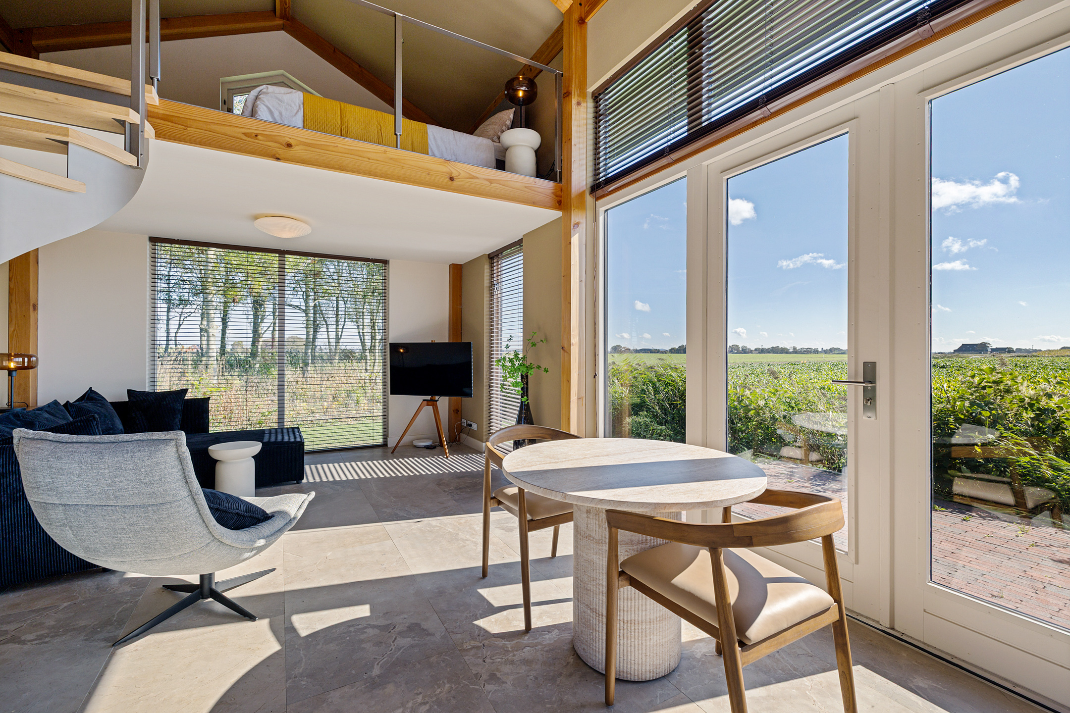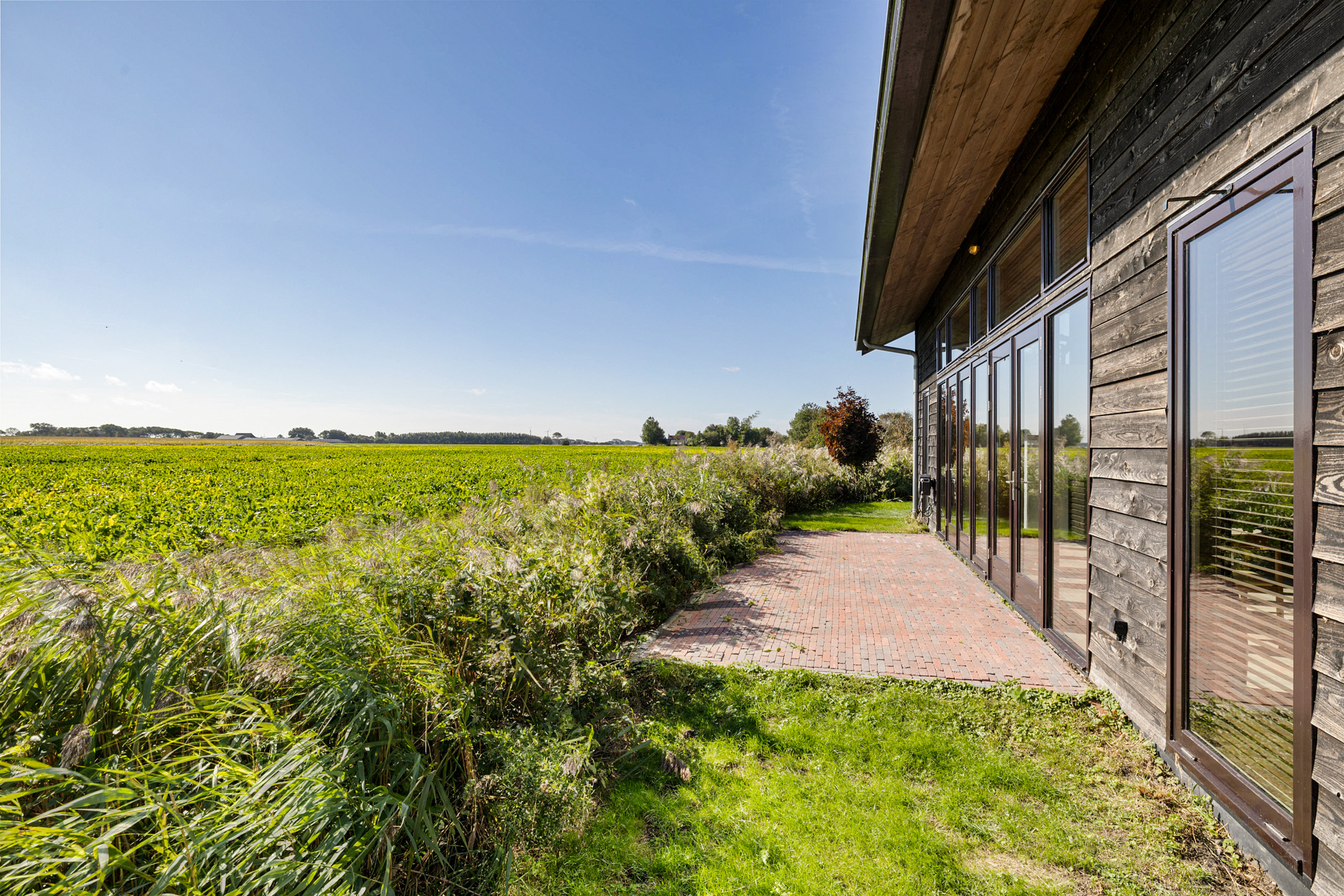 Het bijhuis, type schuurwoning (ca 13x4.5m) is onder architectuur gebouwd, volledig geïsoleerd en rondom voorzien van hoge raampartijen (HR++) met panoramisch zicht. De huisje is aan de lange zijde zowel aan de voorkant als aan de achterkant middels openslaande tuindeuren te betreden. Met aan beide zijden terrassen met handgevormde klinkers. De lichte hoge ruimte met stoere douglas spanten in het zicht benadrukken het leven in en met de natuur. Dankzij het dark-sky gebied is de prachtige sterrenhemel helder in volle glorie te zien. Zelfs het Noorderlicht vertoont zich hier geregeld. En wat van de overvliegende zwermen water-, trek- en weidevogels..