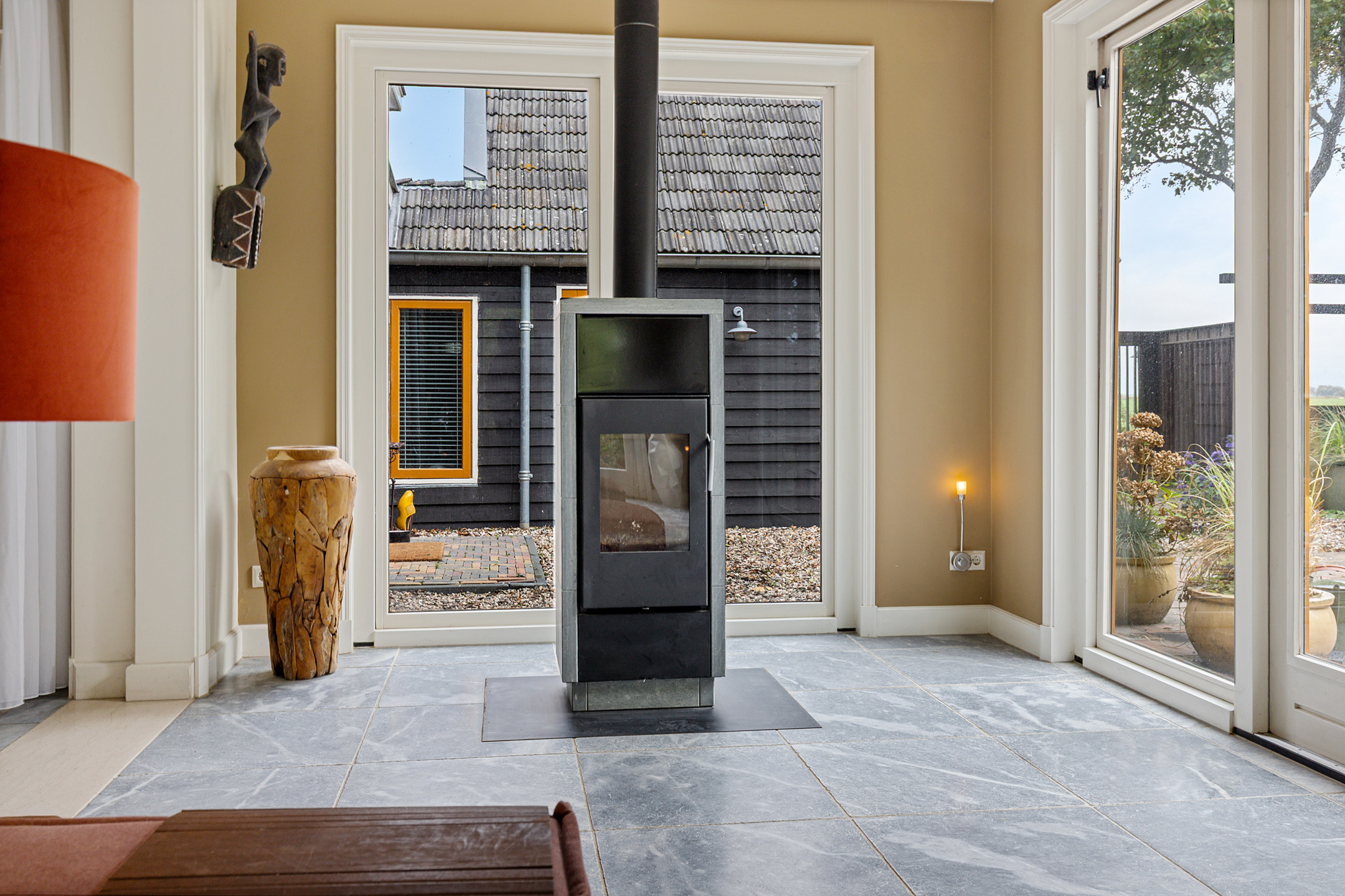 Bij binnenkomst valt meteen de stijl op: de voordeur met sierlijk smeedijzeren deurlichtrooster, een wand van oude Friese tegeltjes en een hardstenen vloer zetten de toon van dit zorgvuldig verbouwde dijkhuis. De hal geeft toegang tot een royale badkamer met dubbel wastafelmeubel, ligbad, inloopdouche en toilet.