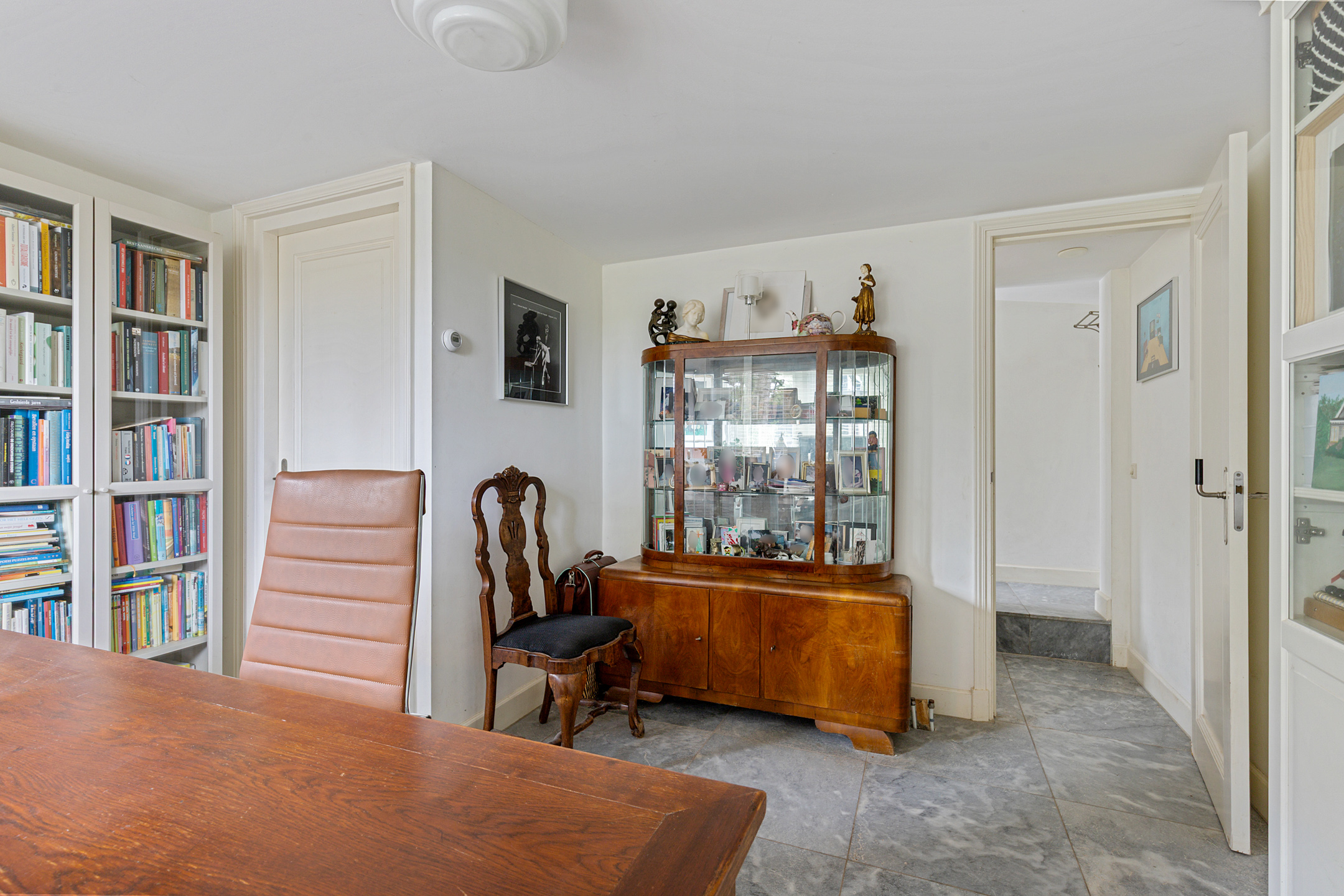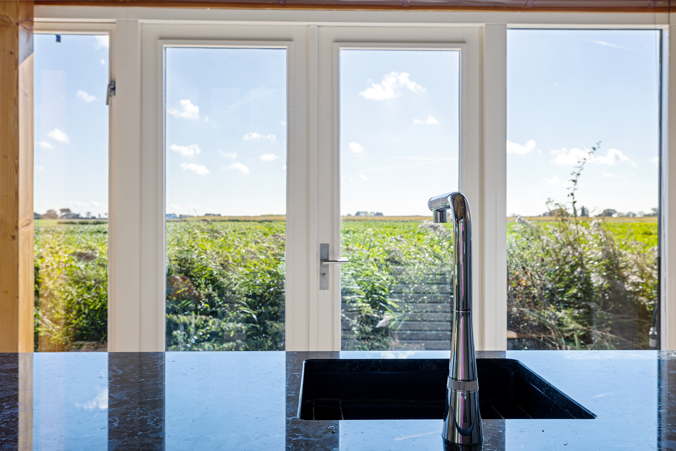 De lichte woonkeuken in de linker vleugel biedt panoramisch zicht op de Waddendijk en landerijen. Een centrale plek om te koken en te tafelen, voorzien van hoogwaardige inbouwapparatuur. Achter de keuken bevindt zich via een gang met prachtige Friese tegelwand de huidige studeerkamer, met deuren naar tuin en badkamer/toilet. Boven de studeerkamer ligt een lichte loft, geschikt als logeerkamer of atelier.
