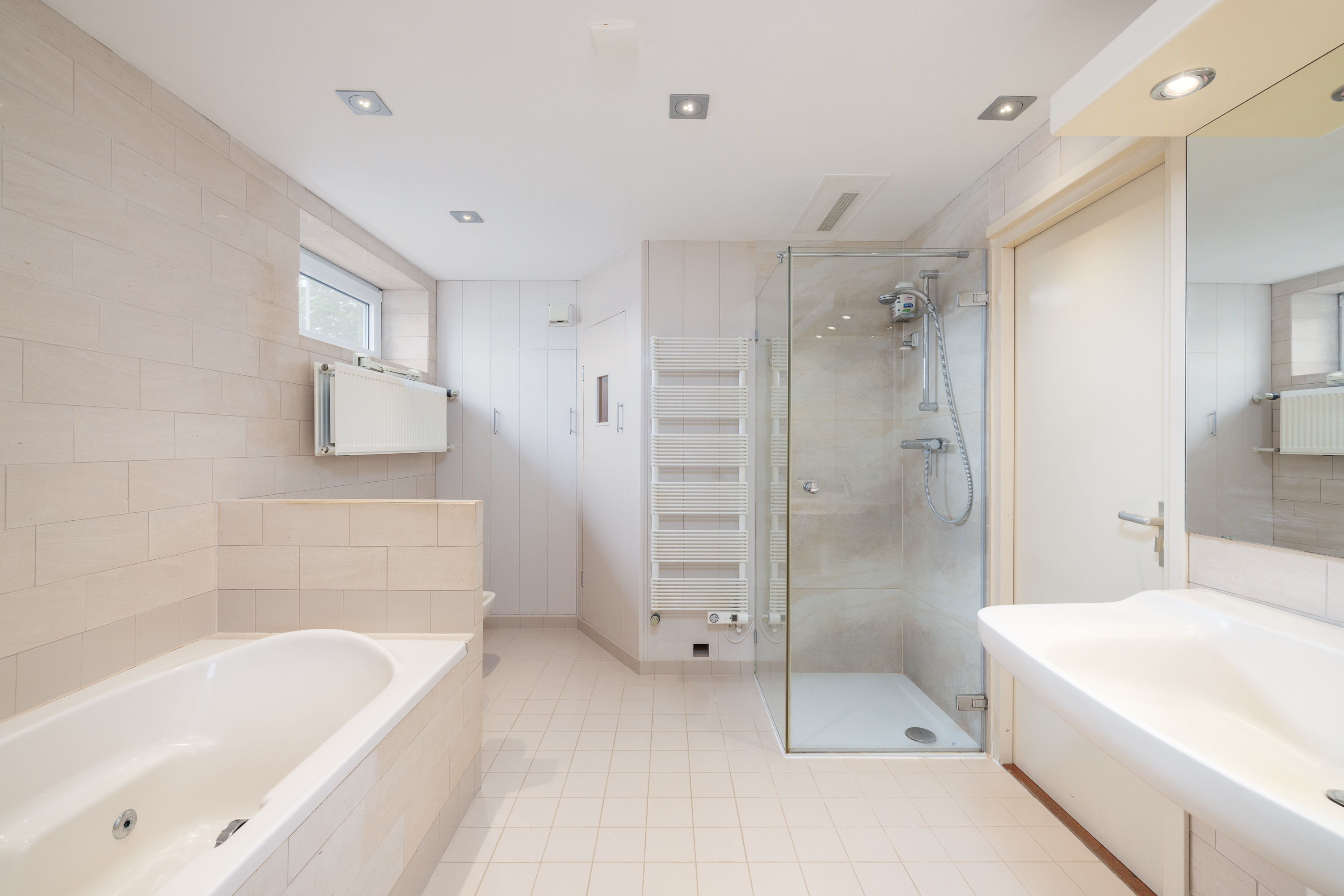 De badkamer aan de achterzijde beschikt over een kleine sauna. De tweede badkamer is uitgerust met een inloopdouche, aansluiting voor wasapparatuur en een apart toilet.
