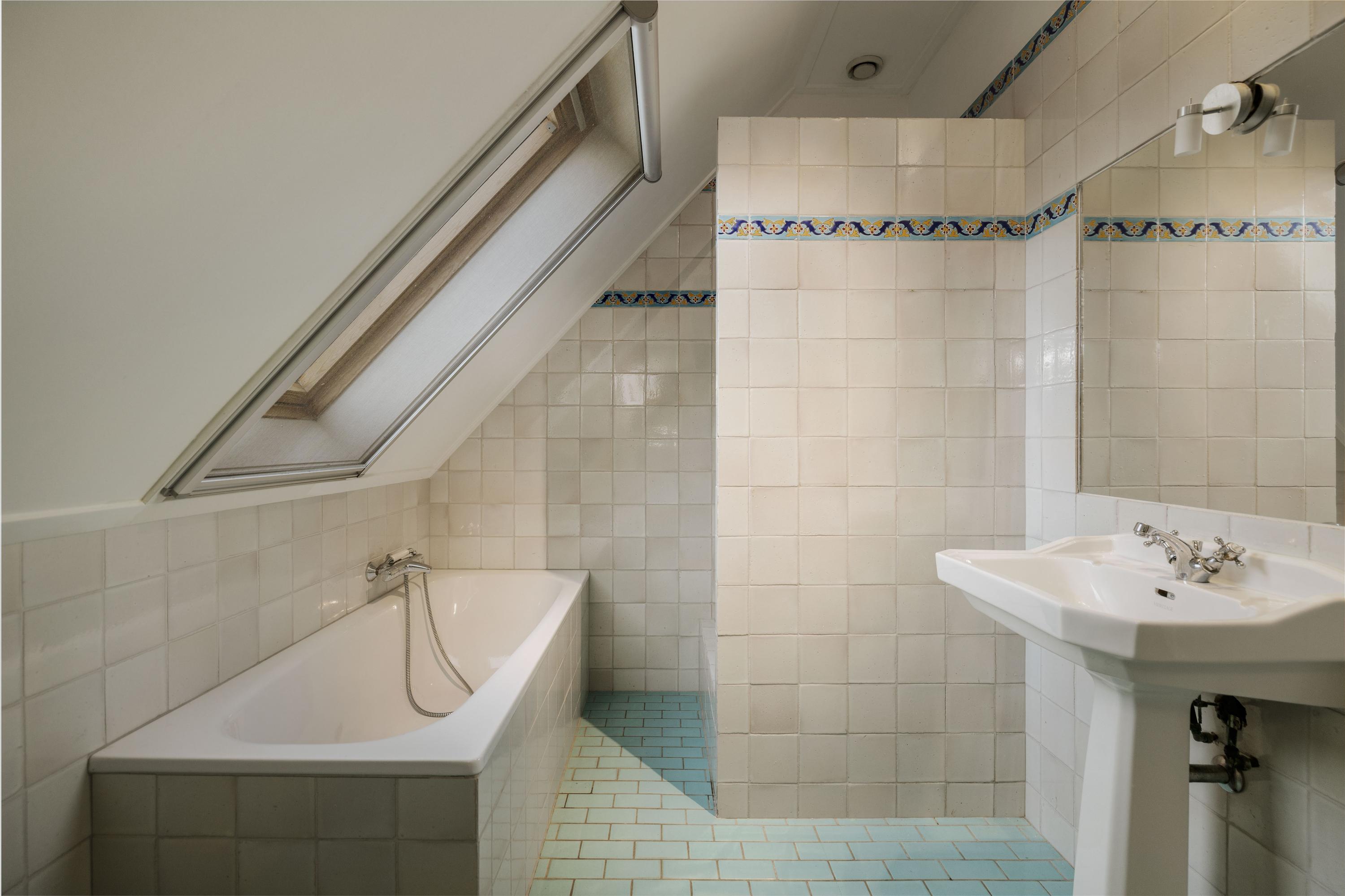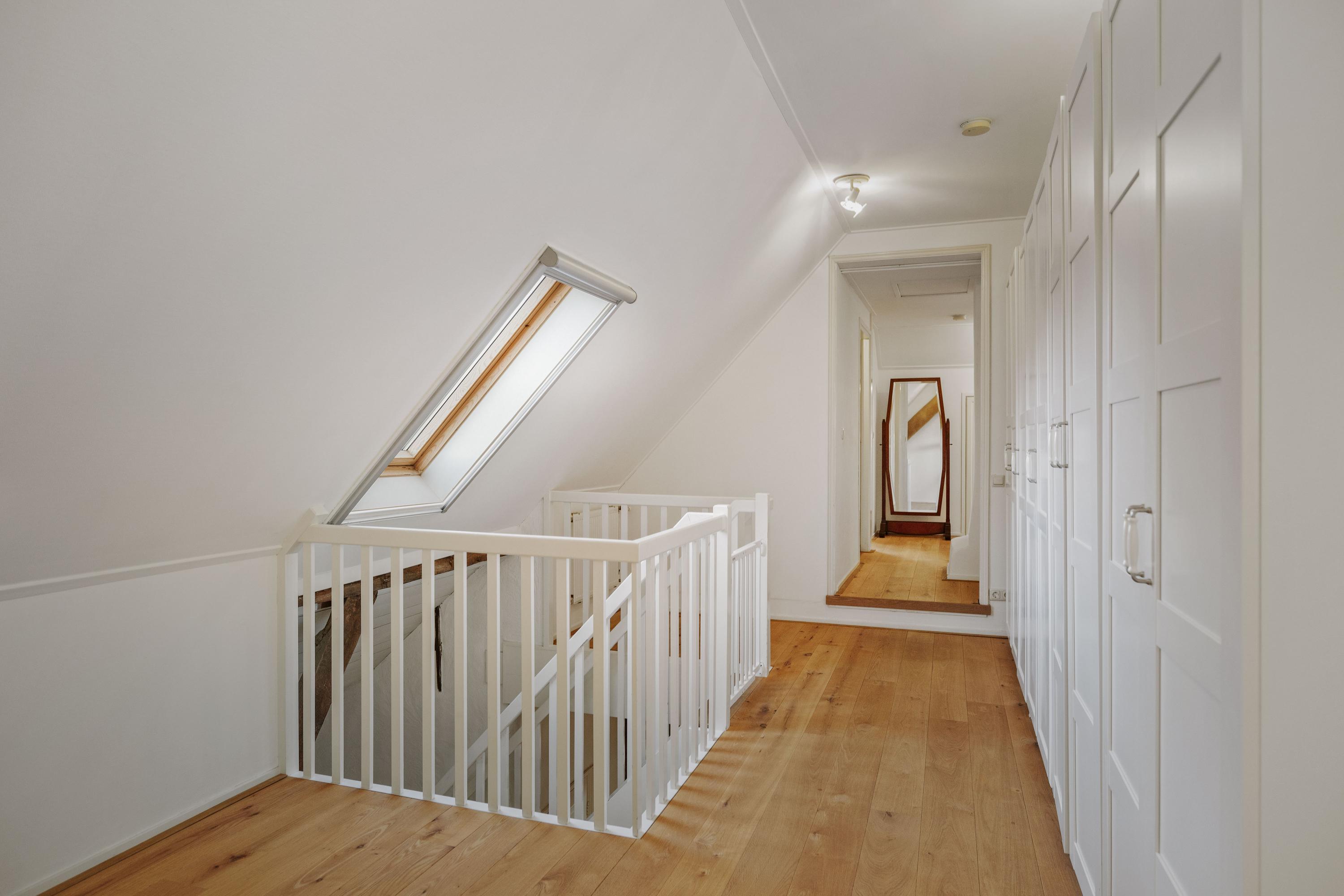 Aan de royale en zonnige overloop, met op de vloer een rood eiken planken vloer, grenzen vijf ruime slaapkamers. De ouderkamer beschikt over een eigen badkamer met inloopdouche, WC en wastafel. In het voorhuis bevindt zich tevens de waskamer/ technische ruimte, met de aansluitingen voor de wasmachine en -droger, de ketel en het buffervat en een boiler van 120 liter, alsmede een praktische berging. Hier is tevens de tweede badkamer, met dubbele wastafels, een ruime inloopdouche en een WC.