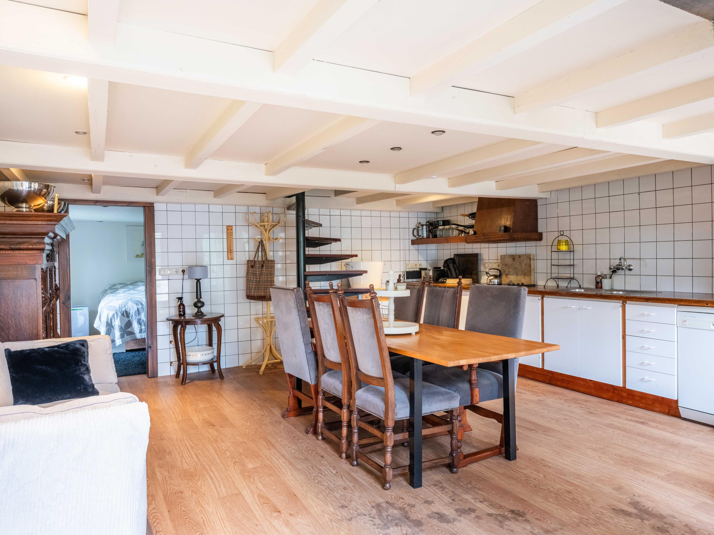Via de hal met garderoberuimte en bergkast bereik je het toilet met fonteintje en de trap naar de eerste verdieping. Vanuit de hal stap je direct door naar de gezellige eetruimte met open keuken. De grote ramen bieden een prachtig zicht op de groene tuin rondom. De landelijke keuken is voorzien van vaste kasten en volop bergruimte. Vanuit hier is er tevens toegang tot de ruime kelder, ideaal voor voorraad of als wijnkelder. De royale woonkeuken vormt het hart van het huis, met authentieke details zoals een Engelse fornuis met vier ovens en karakteristieke balkenplafonds.